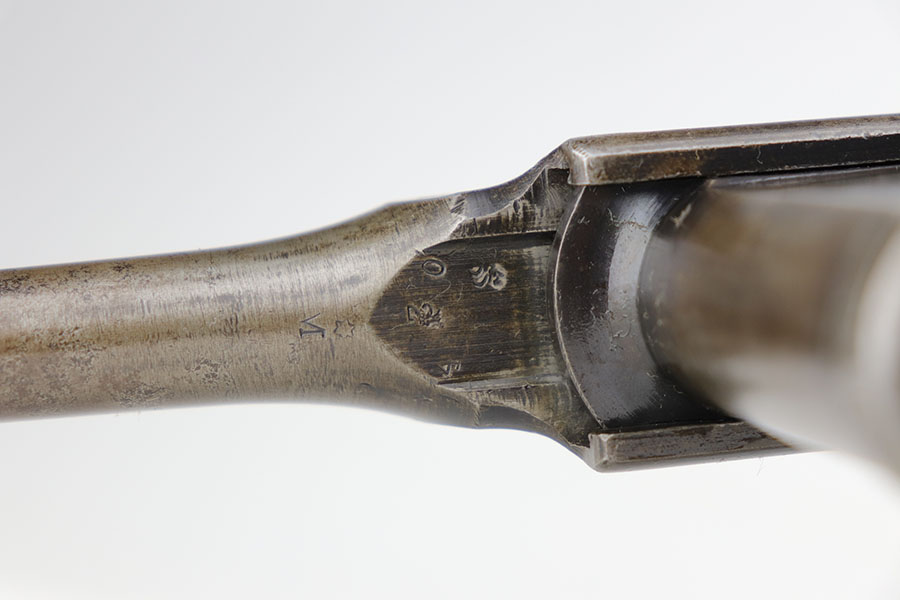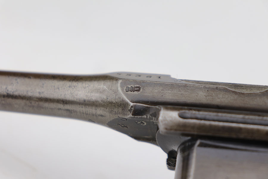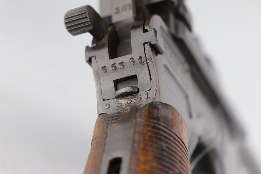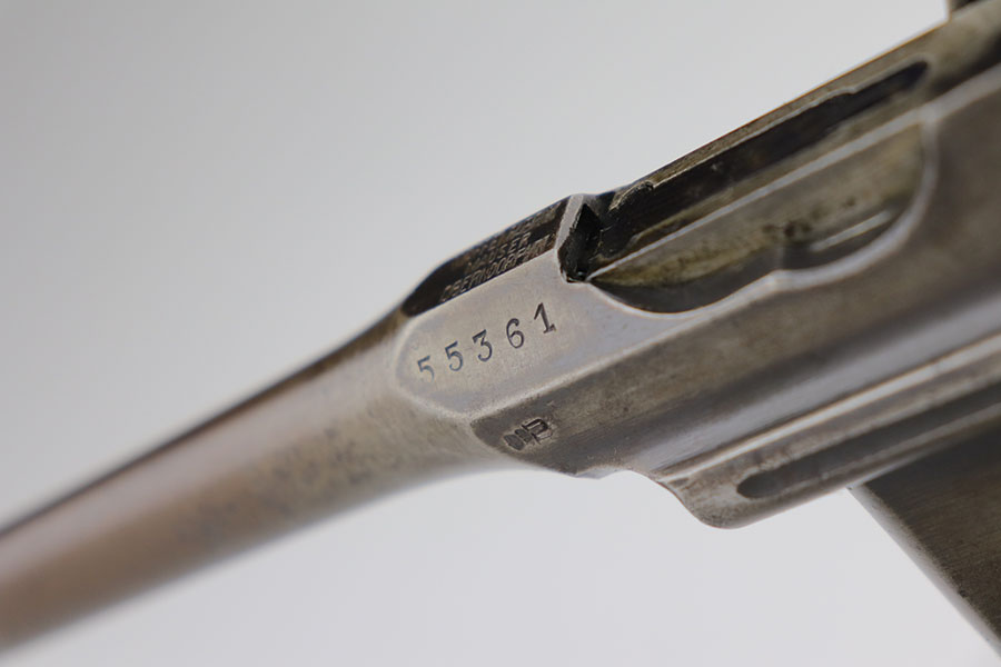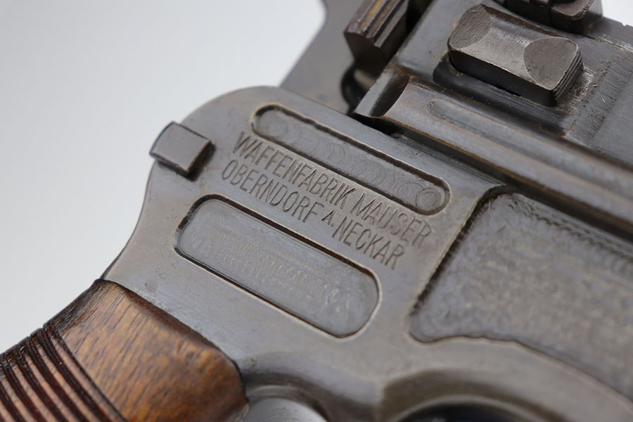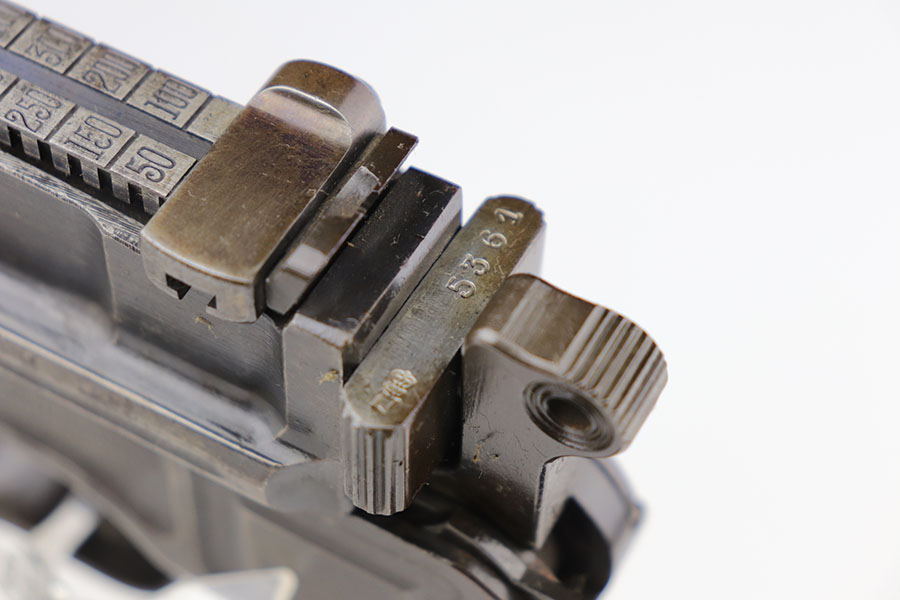 2/321 – This is a “Red 9” Mauser C96 Broomhandle, chambered in 9mm. Unlike its commercial counterparts, “Red 9” Broomhandles were chambered in the more common 9mm Para caliber, which was used by the German Army and were marked with a large 9 on the grips which was then filled with red or orange paint to help German soldiers differentiate its caliber from the standard .30 mauser cartridge. Only about 130,000 of these very collectible guns were made, with only about 100,000 being accepted by the army and issued to the troops. Considered to be a substitute for a light carbine, they became very popular in trench warfare and were used by some of the Germany’s elite crack troops. This one is all matching and has retained about 60% of its original finish. There is general thinning, light brown patina, and spotty oxidation throughout. The grips are excellent and matching. The bore has great rifling with minor pin-pricking in the grooves.