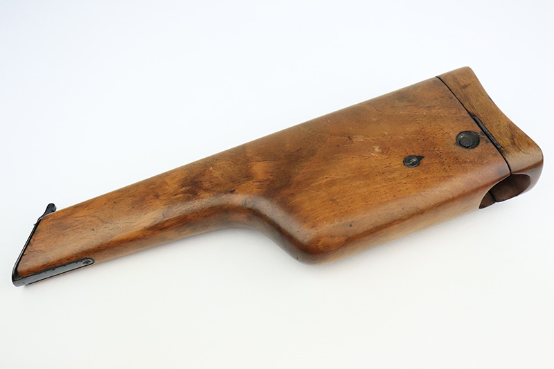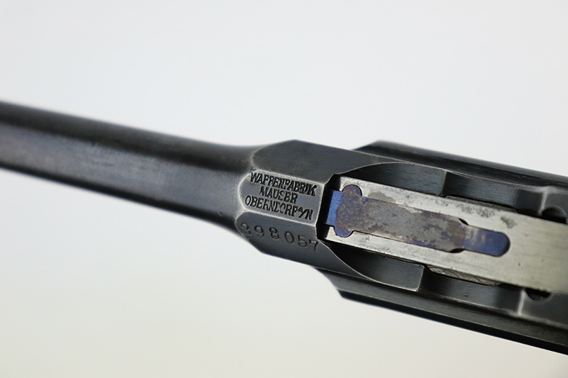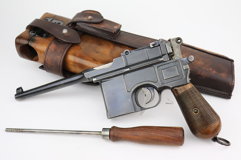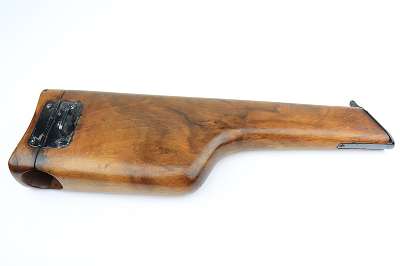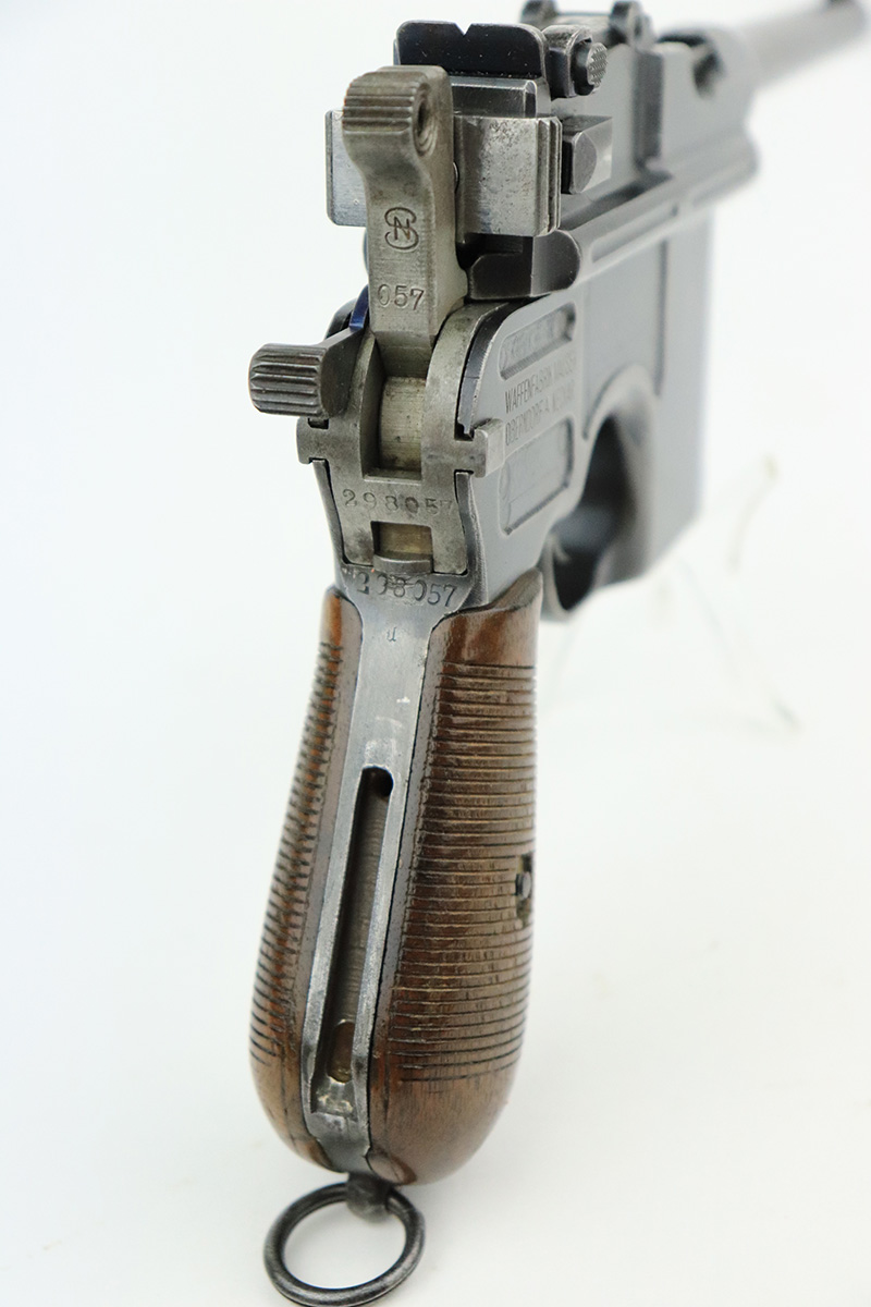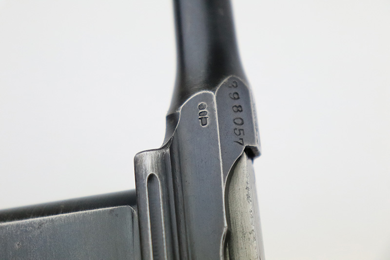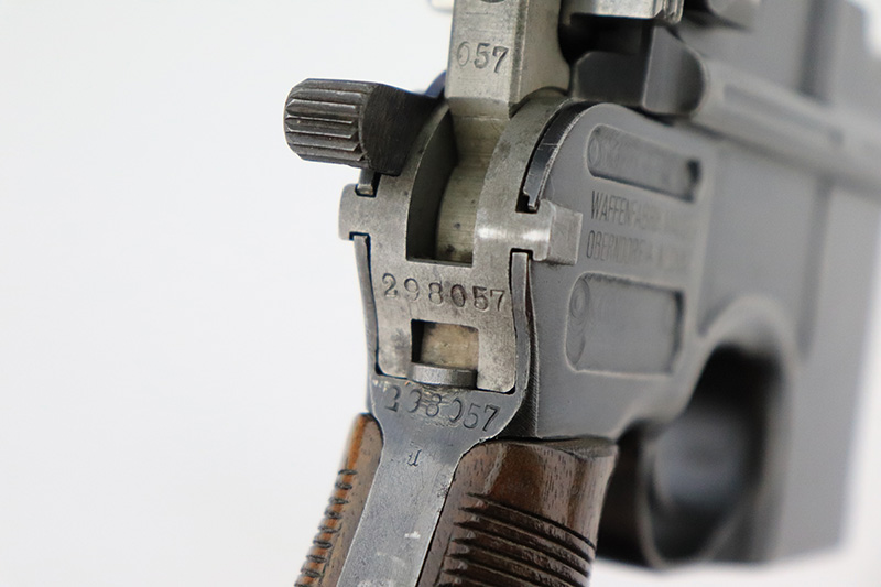 9/7/22 – This is a very nice example of a Mauser C96 chambered in 7.63mm. It is all matching and has an Imperial German proof on the right side of the slide, indicating it was issued to the Imperial German military during WW1. It comes as a rig with a shoulder stock, leather harness, and a cleaning rod (all are reproductions). The gun itself has retained about 90% of its original finish. Most of the wear is on the grip straps, but there is also minor wear on the high edges of the frame, and some minor spotty wear along the barrel. Comes with very nice matching-numbered grips. The bore is shiny with strong rifling with an area of spotty oxidation.