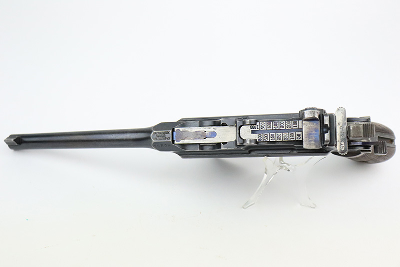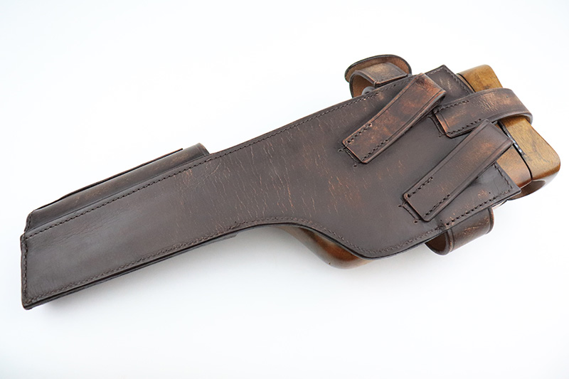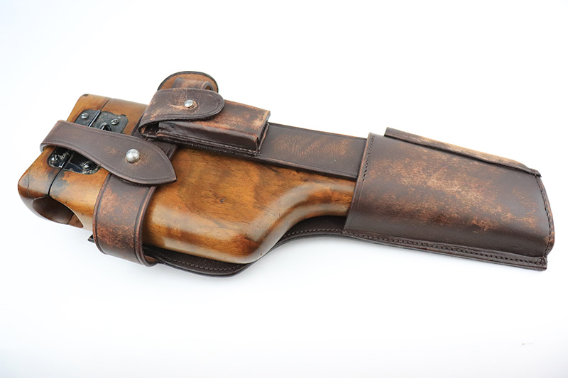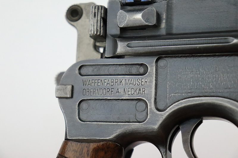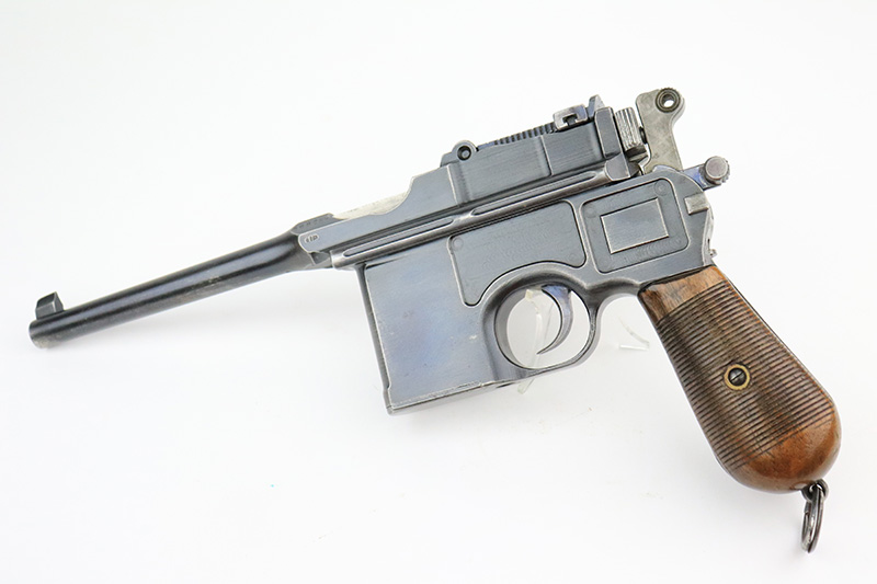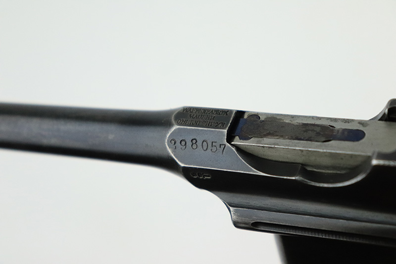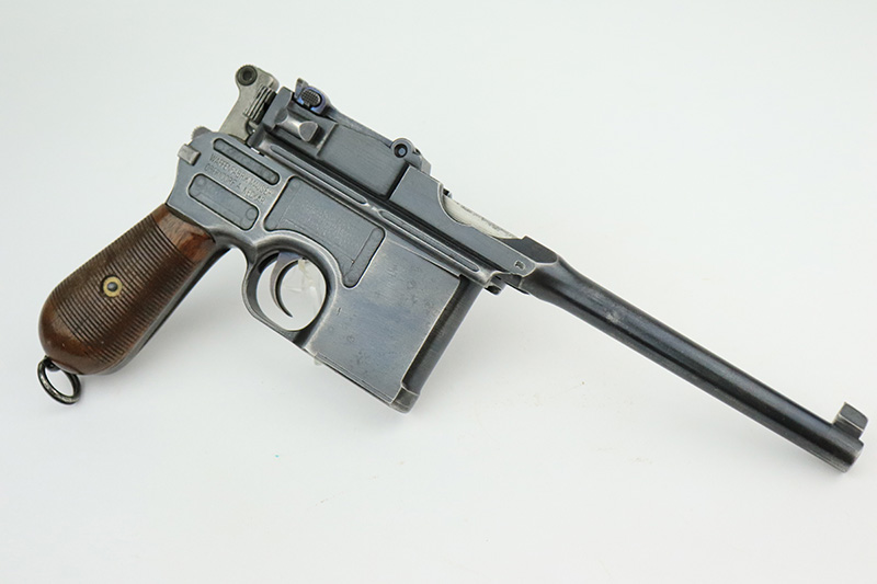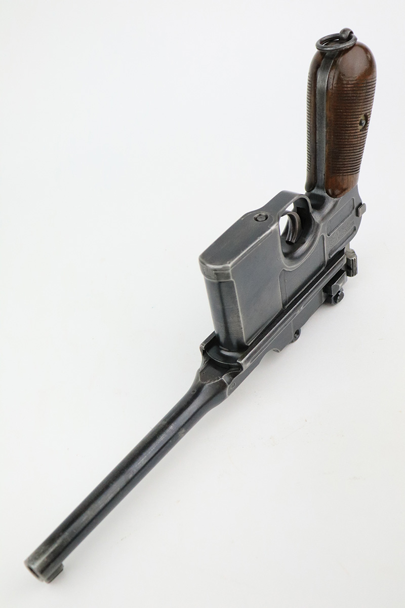 9/7/22 – This is a very nice example of a Mauser C96 chambered in 7.63mm. It is all matching and has an Imperial German proof on the right side of the slide, indicating it was issued to the Imperial German military during WW1. It comes as a rig with a shoulder stock, leather harness, and a cleaning rod (all are reproductions). The gun itself has retained about 90% of its original finish. Most of the wear is on the grip straps, but there is also minor wear on the high edges of the frame, and some minor spotty wear along the barrel. Comes with very nice matching-numbered grips. The bore is shiny with strong rifling with an area of spotty oxidation.