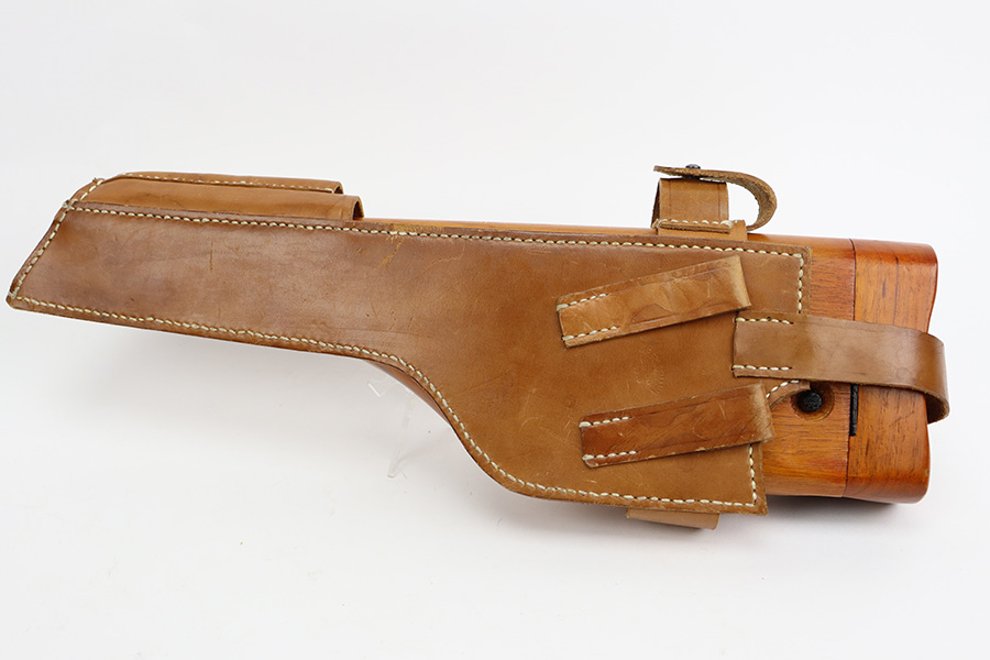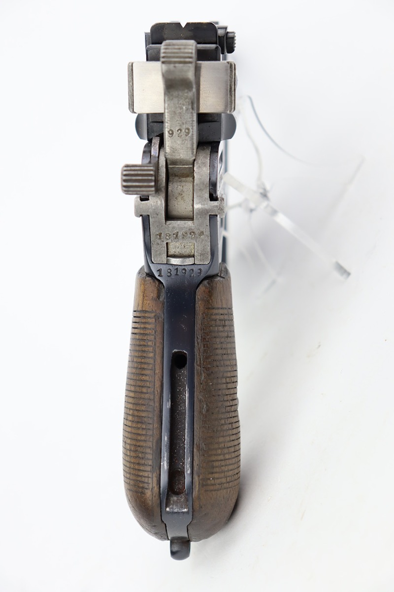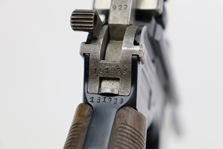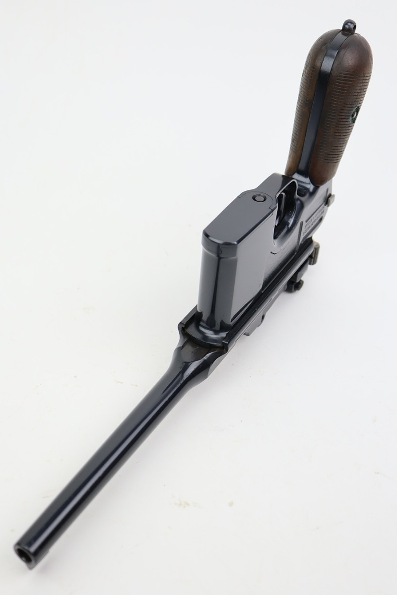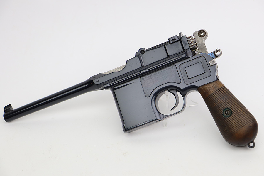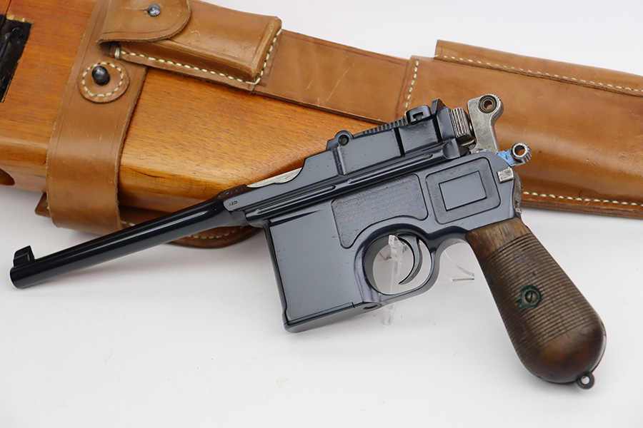 7/28/23 – This is an excellent example of a Mauser C96 sold in the commercial market during WW1. All matching with commercial proofs. Chambered in 7.63mm. Comes as a rig with an excellent reproduction wood stock and leather harness. The gun is beautiful restored and refinished with virtually no signs of wear. Fitted with slightly worn, period-correct, matching-numbered wood grips. Very nice bore with great rifling.