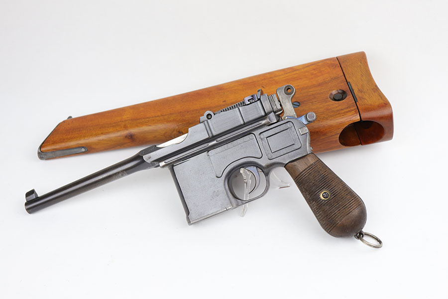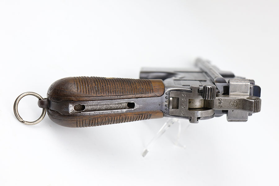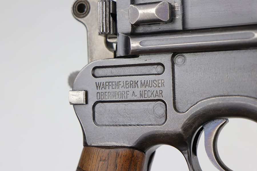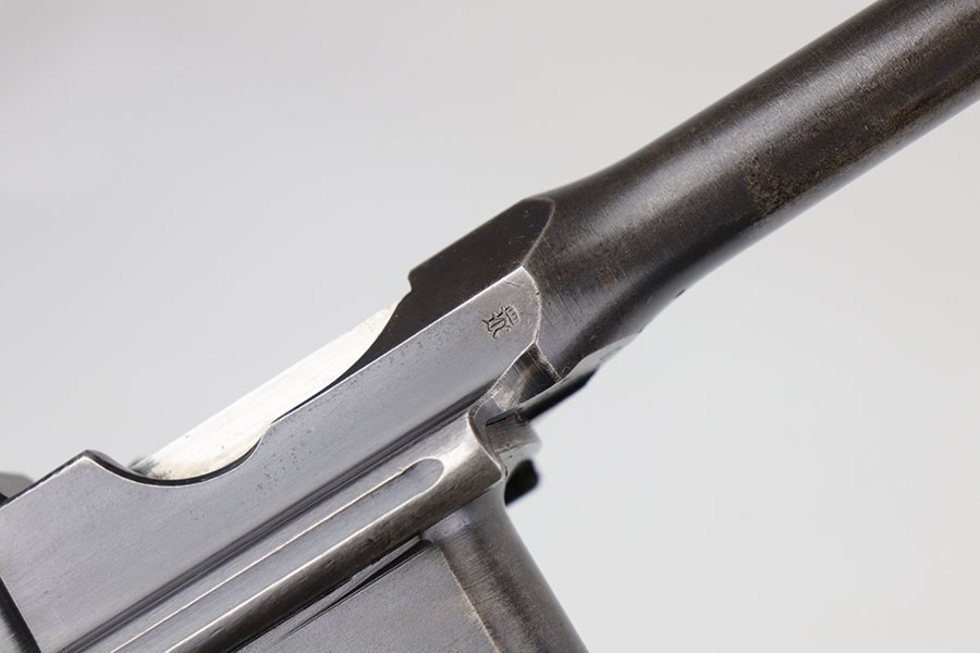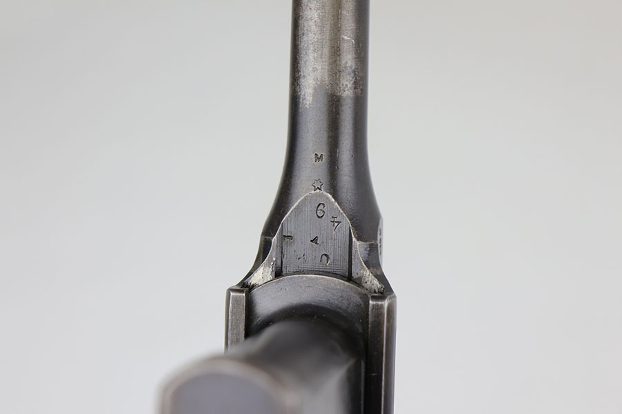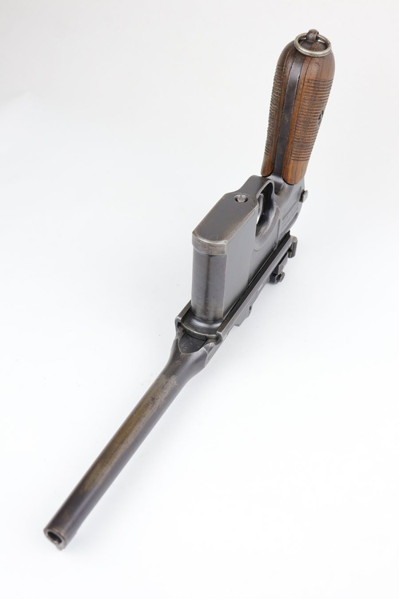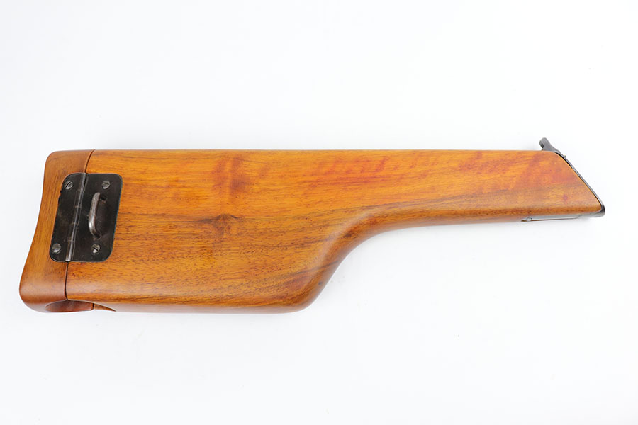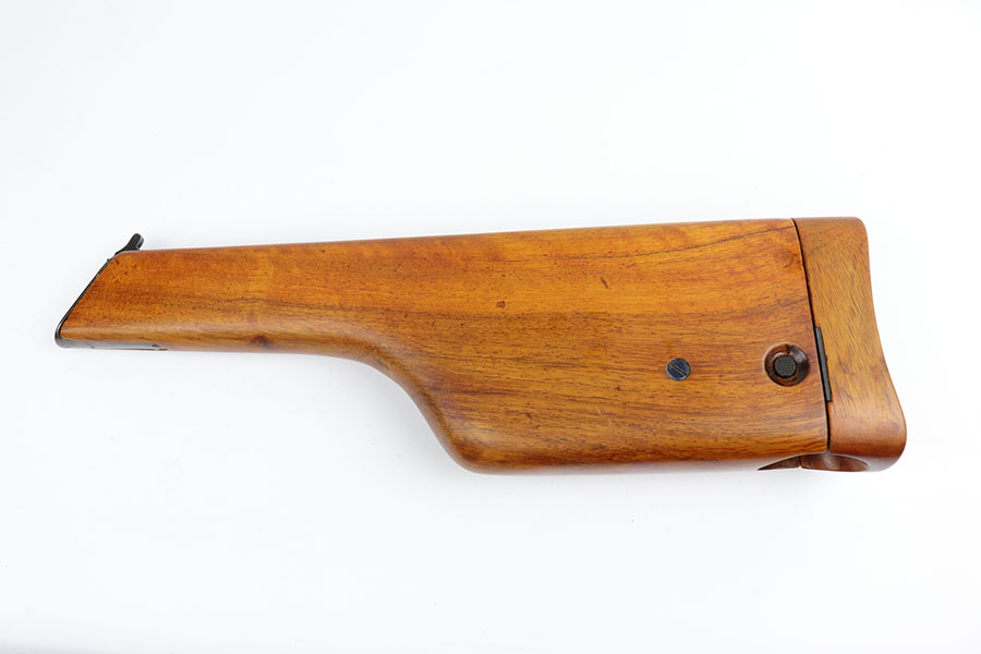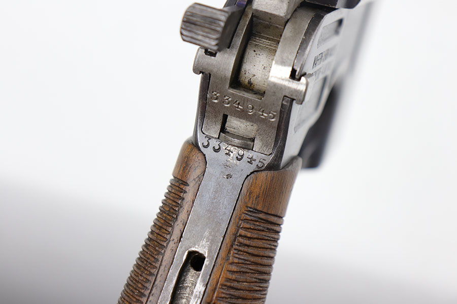 5/19/20 – This is a very nice, all original example of WWI Mauser C96 “broomhandle” pistol, made for German Imperial Army around 1916-1917 and has a German Army acceptance mark on the right side of the chamber. It is chambered in hard hitting .30 Mauser caliber and is all matching, including the internal parts, grips and the stock. The gun retains around 90-92% of its original wartime finish with some holster wear on high point and under the barrel from sliding in and out of the stock. It had not been messed with and remains in its original condition. Very nice bore with strong rifling. Grips are without defects. Shoulder stock is matching to the gun and has two stable hairline cracks on the side. It attaches well into a grove on the back of the gun, although does have some lateral movement at the attachment point, as most of these were made during the last 2 years of the war with much less regard for fit than the earlier commercial guns. The stock appears to have a very light coat of varnish on it, and likely was sanded at some point. Some fire blue is still present on the extractor, trigger, safety and the rear sight slider of the gun.