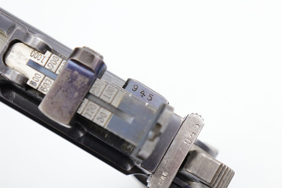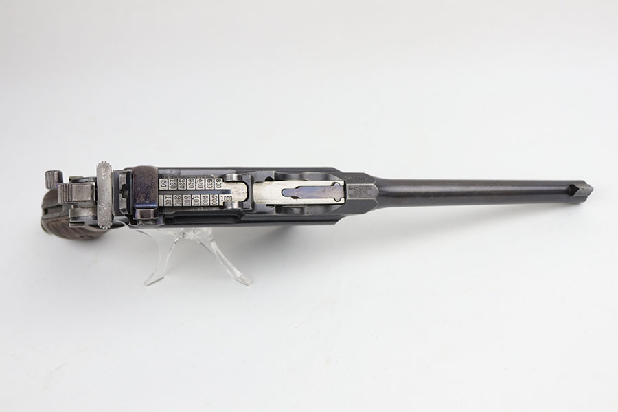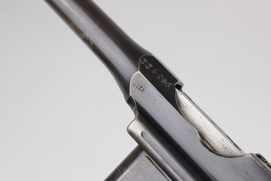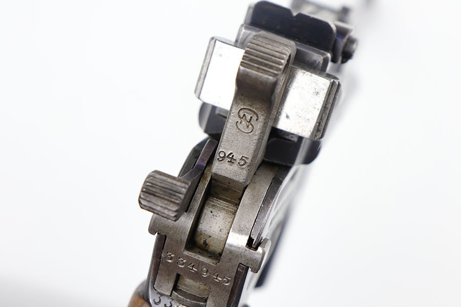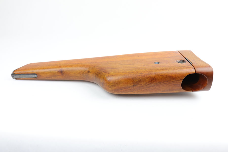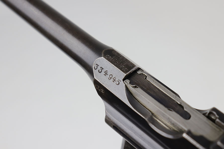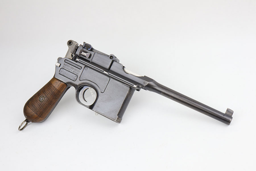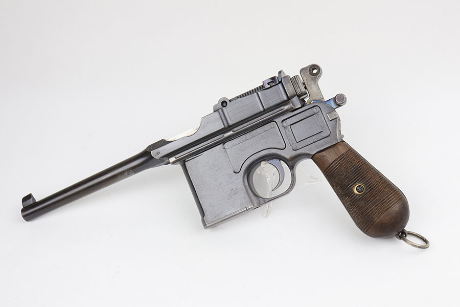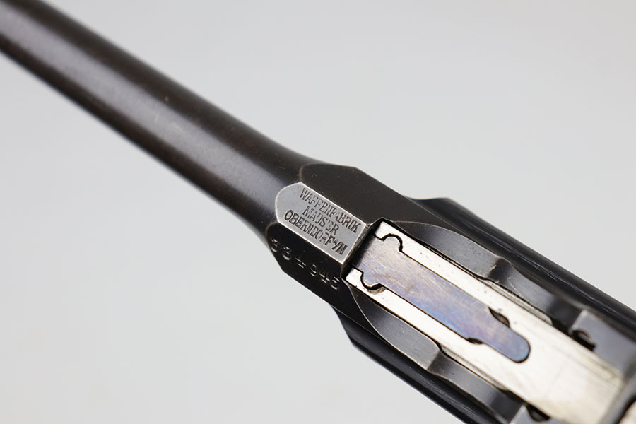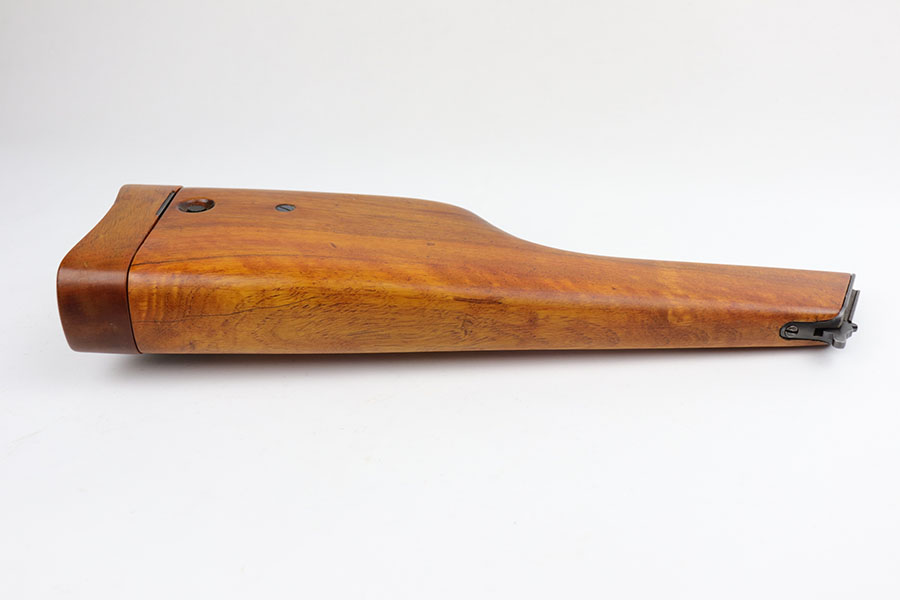 5/19/20 – This is a very nice, all original example of WWI Mauser C96 “broomhandle” pistol, made for German Imperial Army around 1916-1917 and has a German Army acceptance mark on the right side of the chamber. It is chambered in hard hitting .30 Mauser caliber and is all matching, including the internal parts, grips and the stock. The gun retains around 90-92% of its original wartime finish with some holster wear on high point and under the barrel from sliding in and out of the stock. It had not been messed with and remains in its original condition. Very nice bore with strong rifling. Grips are without defects. Shoulder stock is matching to the gun and has two stable hairline cracks on the side. It attaches well into a grove on the back of the gun, although does have some lateral movement at the attachment point, as most of these were made during the last 2 years of the war with much less regard for fit than the earlier commercial guns. The stock appears to have a very light coat of varnish on it, and likely was sanded at some point. Some fire blue is still present on the extractor, trigger, safety and the rear sight slider of the gun.