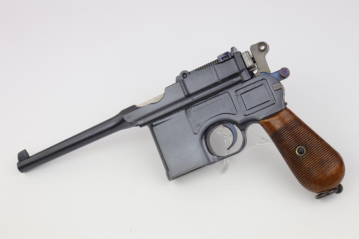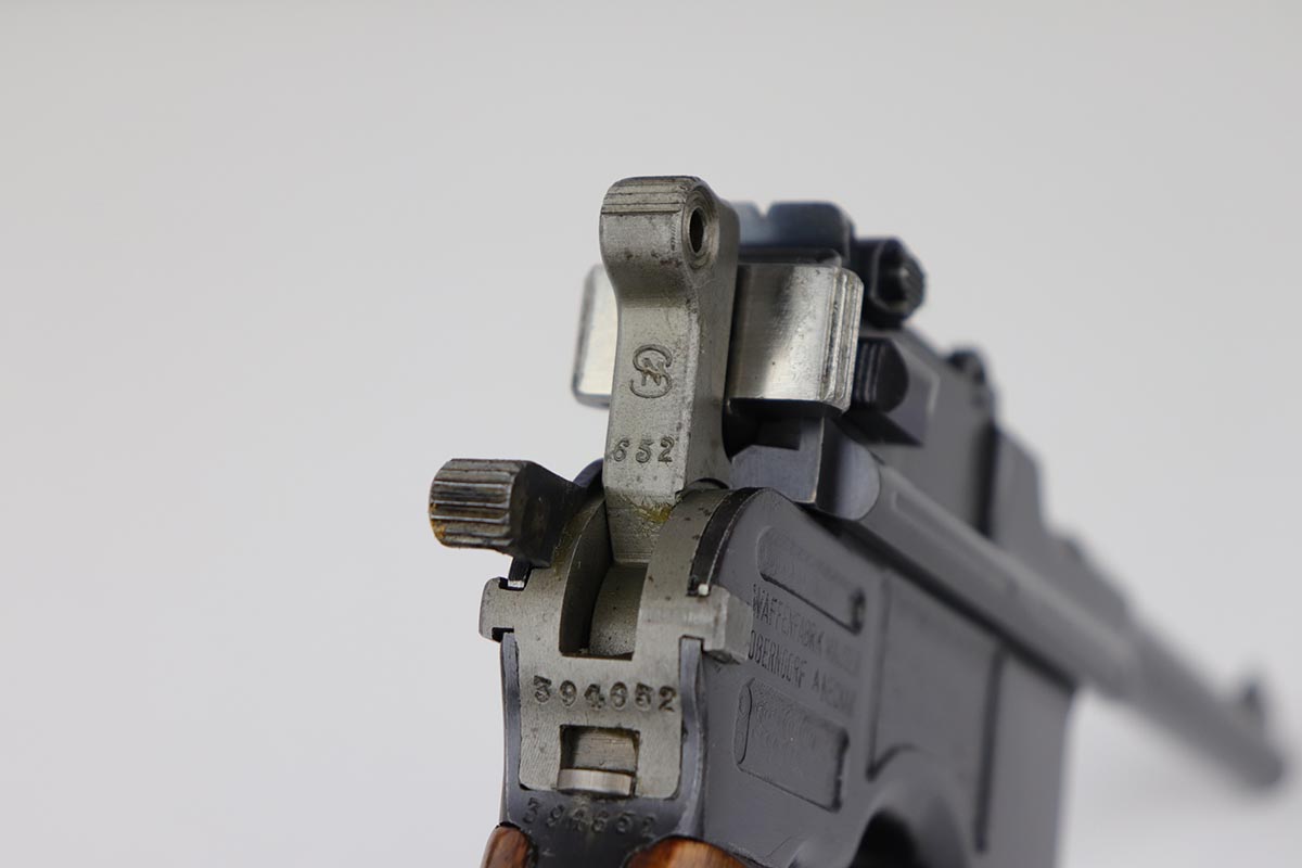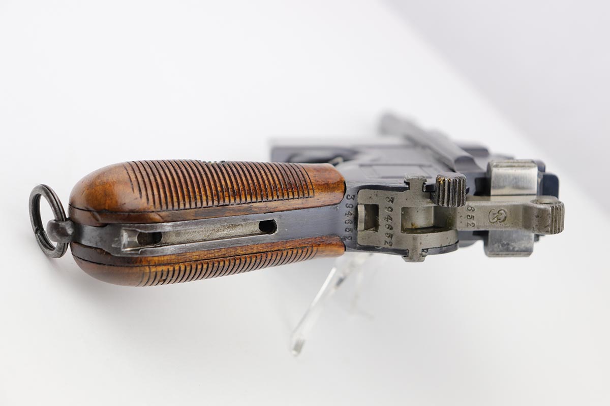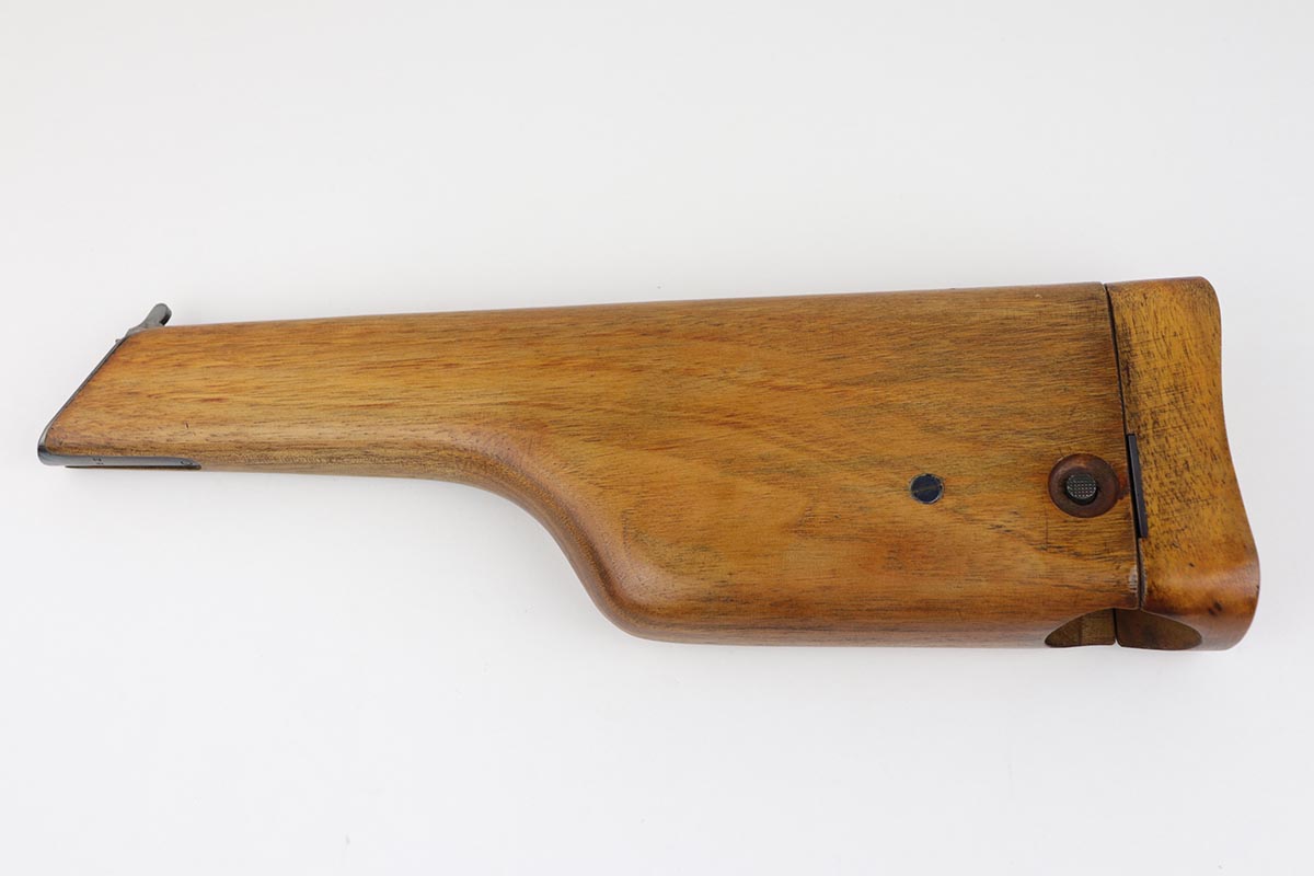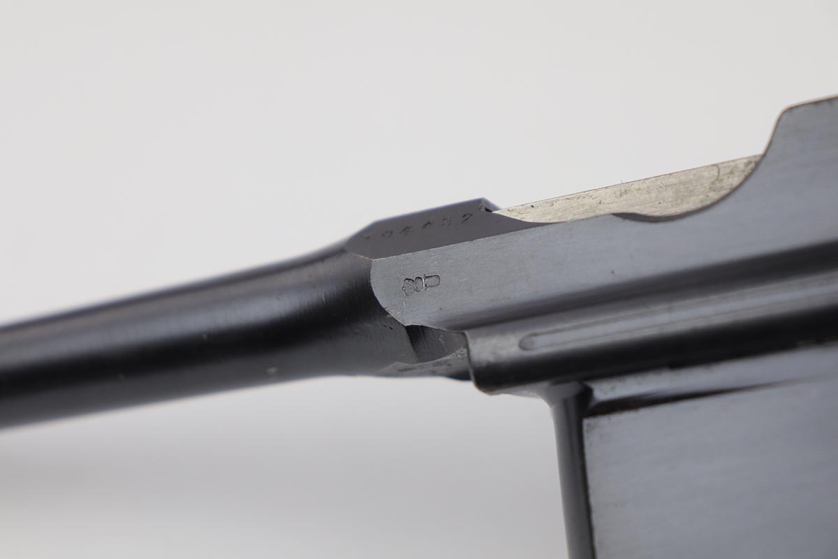 7/18/19 – This is a super rare example of a military contract “wartime commercial” Mauser Broomhandle rig, made in 1917-1918. In addition to ordering “Red 9” Mausers that were chambered in 9mm, the German Army also ordered a number of C96 pistols in .30 Mauser. All were marked with an imperial acceptance stamp on the right side of the chamber. What makes this gun unique is an additional Prussian Eagle stamp on the bottom of the trigger guard – identical to the Prussian Eagle marking stamped on the front of the magazine well on the Prussian contract “Red 9”. Only a couple such guns have been reported by the collectors, and this is one of them. The gun is all matching, including grips and an excellent condition stock with no cracks or other defects. It retains 97-98% of its original blue, with a hint of high edge wear, and with vivid fire blue still present on the small parts. Excellent bore and grips. This is a once in a lifetime opportunity to acquire such a rare variation!