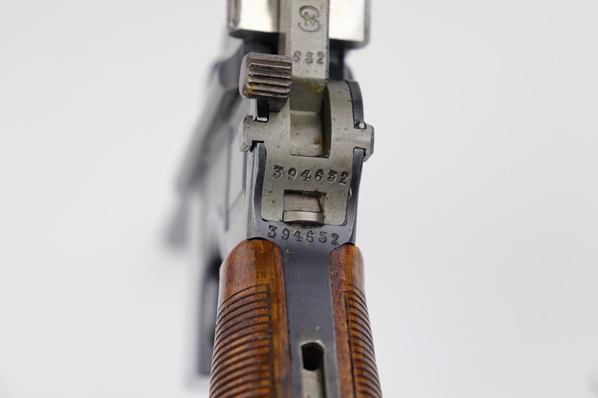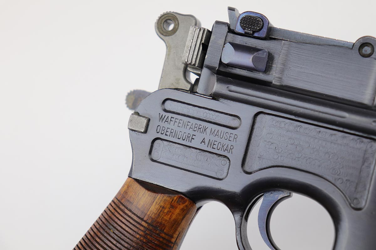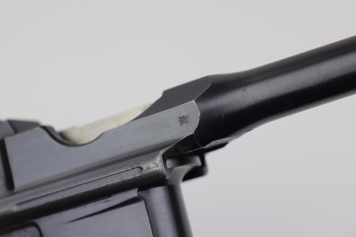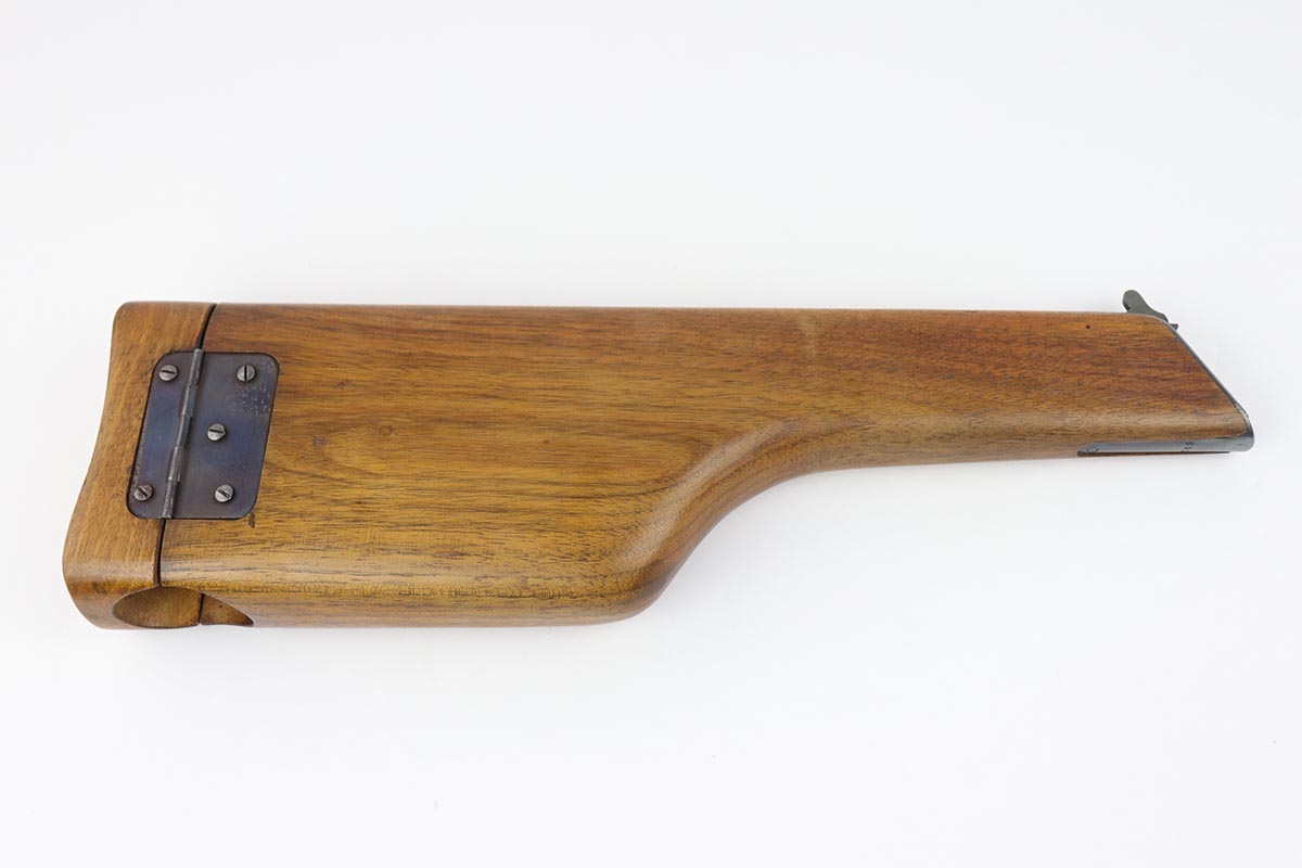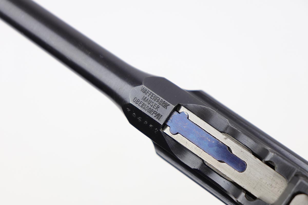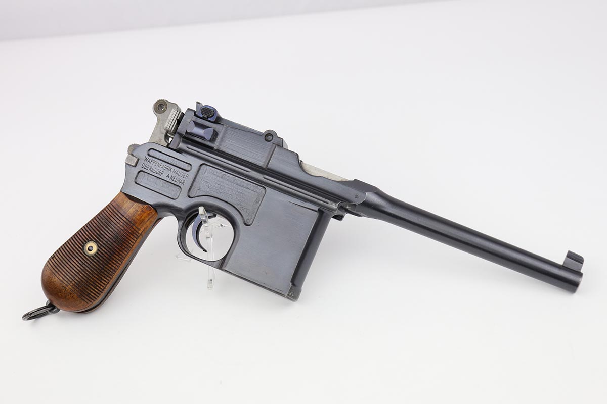 7/18/19 – This is a super rare example of a military contract “wartime commercial” Mauser Broomhandle rig, made in 1917-1918. In addition to ordering “Red 9” Mausers that were chambered in 9mm, the German Army also ordered a number of C96 pistols in .30 Mauser. All were marked with an imperial acceptance stamp on the right side of the chamber. What makes this gun unique is an additional Prussian Eagle stamp on the bottom of the trigger guard – identical to the Prussian Eagle marking stamped on the front of the magazine well on the Prussian contract “Red 9”. Only a couple such guns have been reported by the collectors, and this is one of them. The gun is all matching, including grips and an excellent condition stock with no cracks or other defects. It retains 97-98% of its original blue, with a hint of high edge wear, and with vivid fire blue still present on the small parts. Excellent bore and grips. This is a once in a lifetime opportunity to acquire such a rare variation!