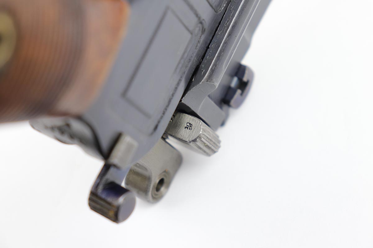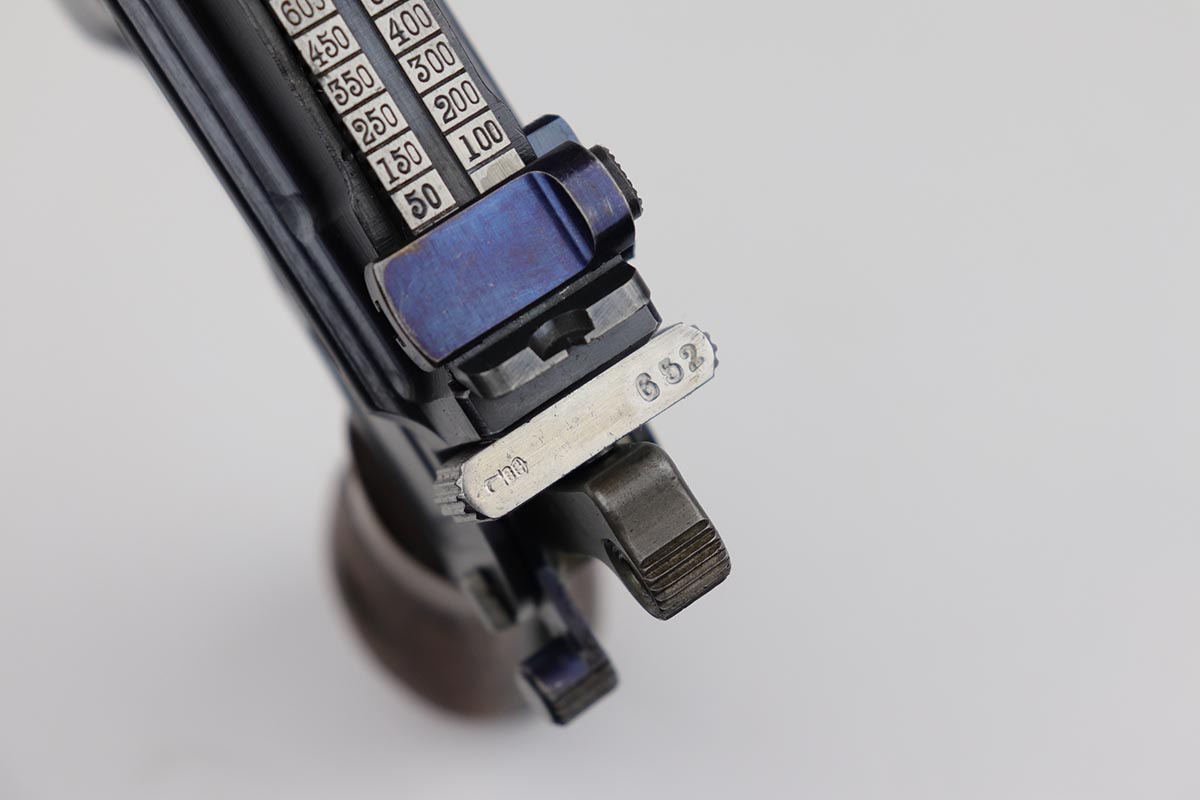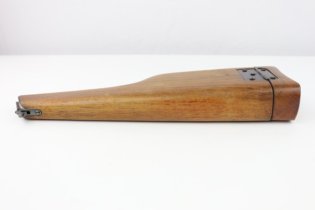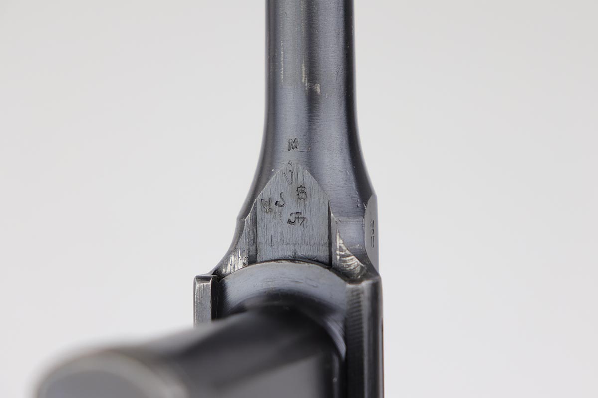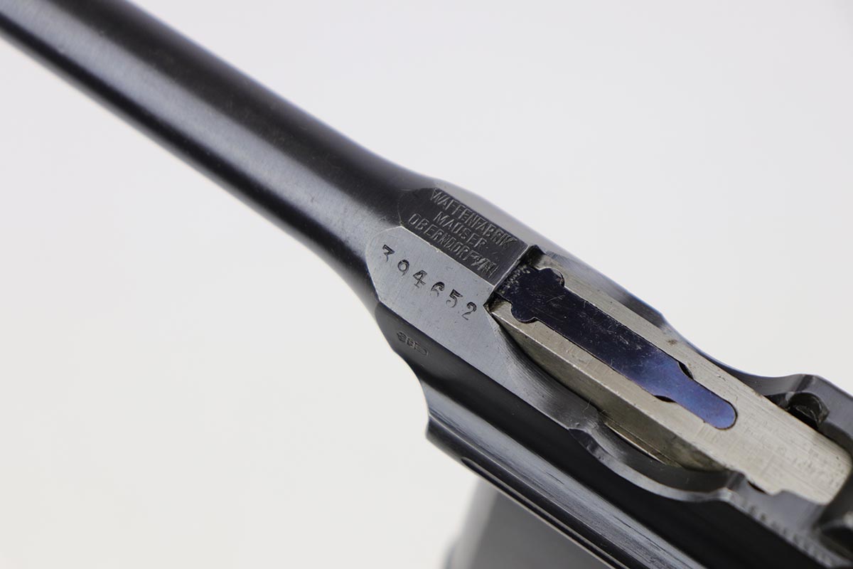 7/18/19 – This is a super rare example of a military contract “wartime commercial” Mauser Broomhandle rig, made in 1917-1918. In addition to ordering “Red 9” Mausers that were chambered in 9mm, the German Army also ordered a number of C96 pistols in .30 Mauser. All were marked with an imperial acceptance stamp on the right side of the chamber. What makes this gun unique is an additional Prussian Eagle stamp on the bottom of the trigger guard – identical to the Prussian Eagle marking stamped on the front of the magazine well on the Prussian contract “Red 9”. Only a couple such guns have been reported by the collectors, and this is one of them. The gun is all matching, including grips and an excellent condition stock with no cracks or other defects. It retains 97-98% of its original blue, with a hint of high edge wear, and with vivid fire blue still present on the small parts. Excellent bore and grips. This is a once in a lifetime opportunity to acquire such a rare variation!
