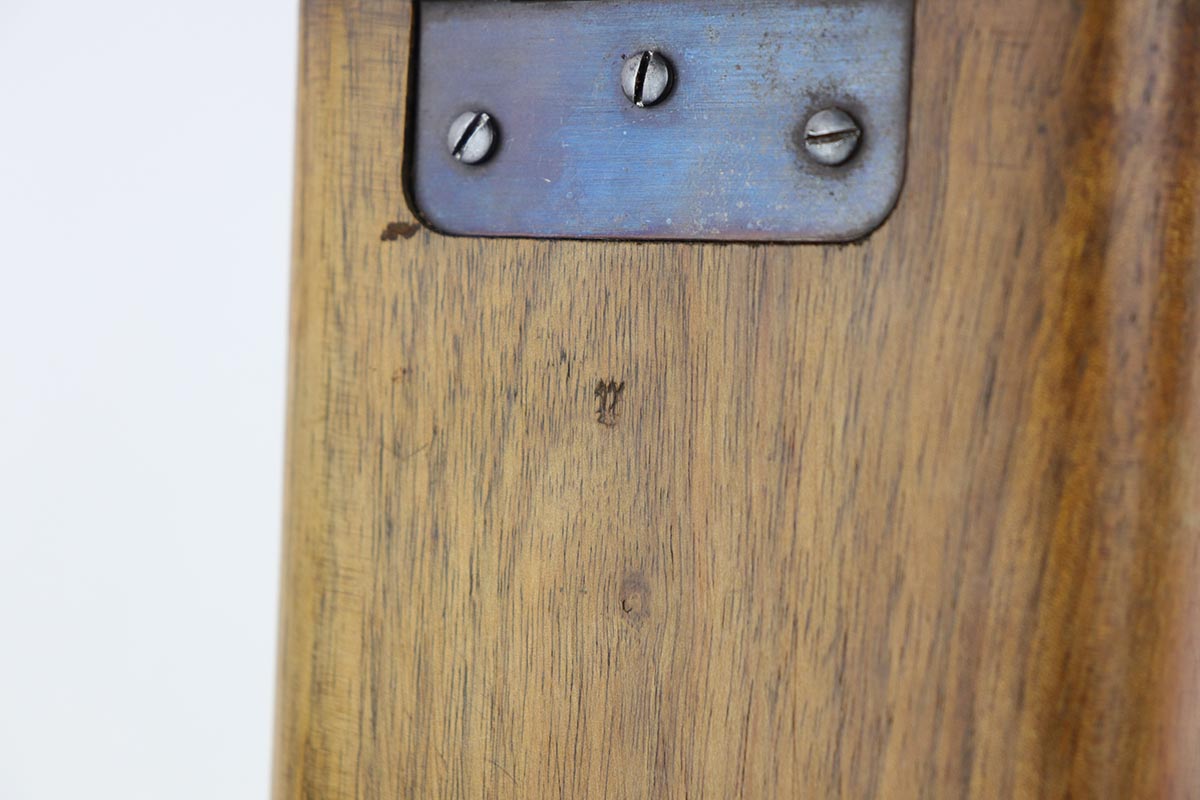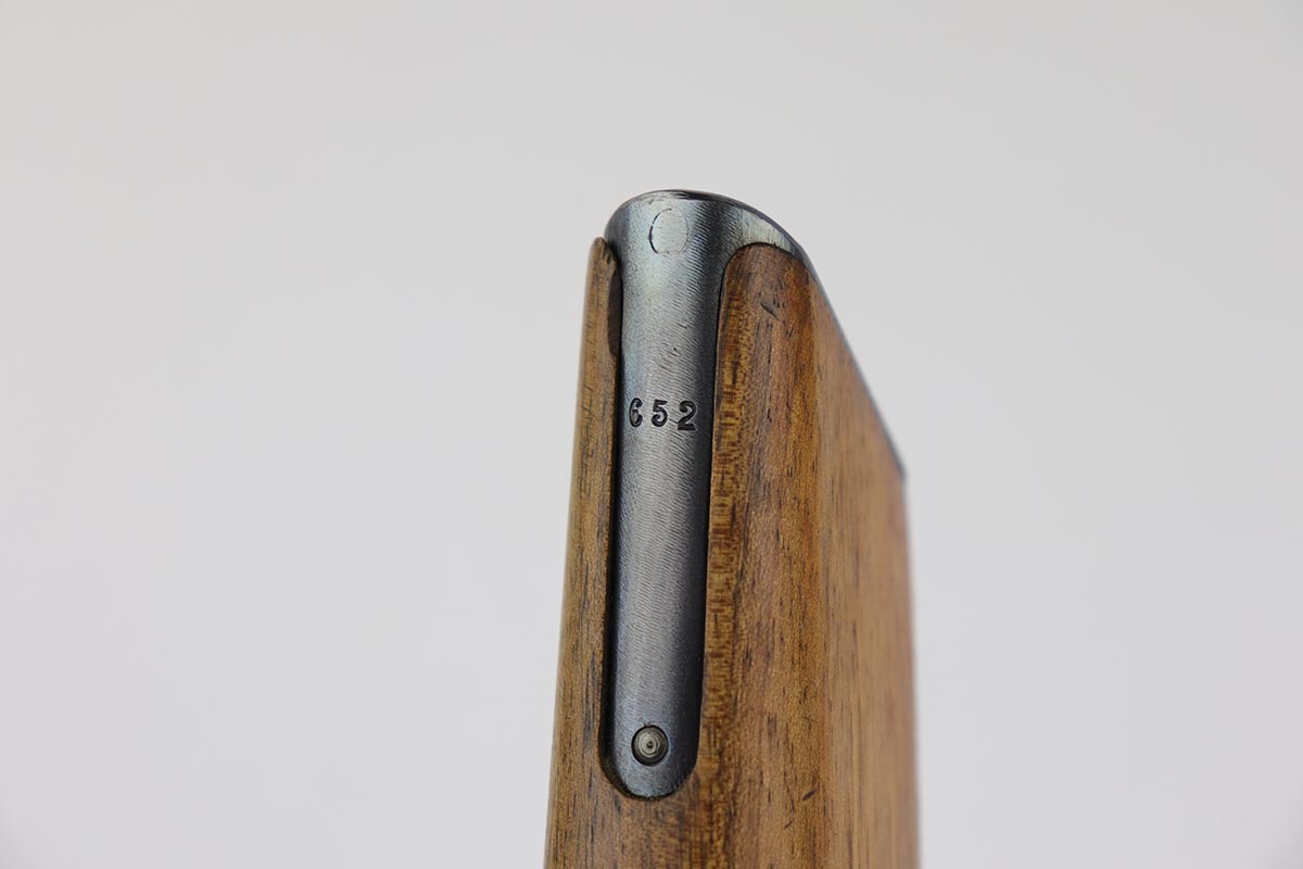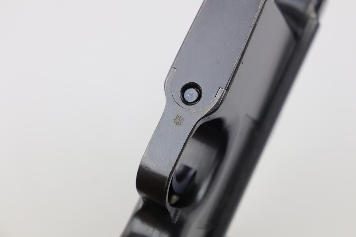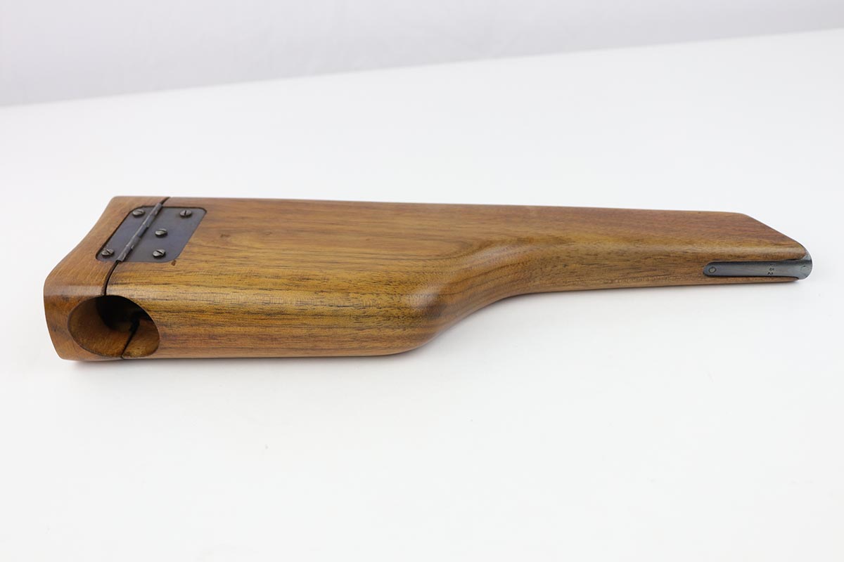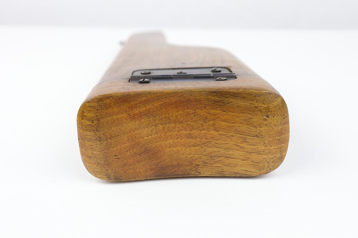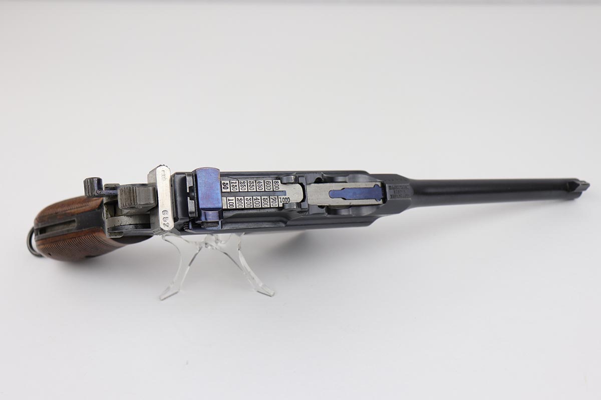 7/18/19 – This is a super rare example of a military contract “wartime commercial” Mauser Broomhandle rig, made in 1917-1918. In addition to ordering “Red 9” Mausers that were chambered in 9mm, the German Army also ordered a number of C96 pistols in .30 Mauser. All were marked with an imperial acceptance stamp on the right side of the chamber. What makes this gun unique is an additional Prussian Eagle stamp on the bottom of the trigger guard – identical to the Prussian Eagle marking stamped on the front of the magazine well on the Prussian contract “Red 9”. Only a couple such guns have been reported by the collectors, and this is one of them. The gun is all matching, including grips and an excellent condition stock with no cracks or other defects. It retains 97-98% of its original blue, with a hint of high edge wear, and with vivid fire blue still present on the small parts. Excellent bore and grips. This is a once in a lifetime opportunity to acquire such a rare variation!