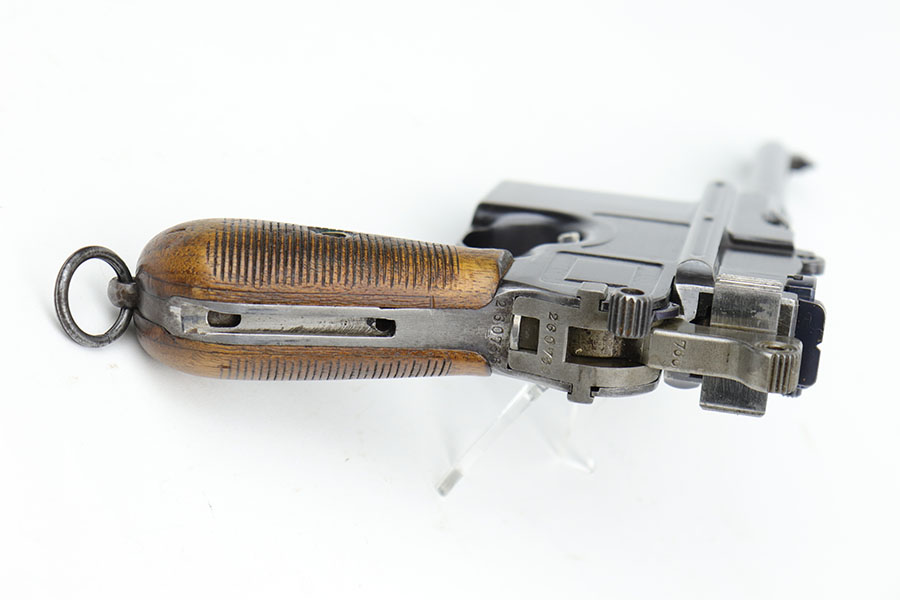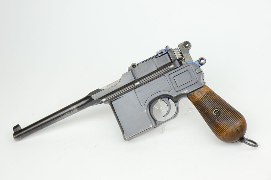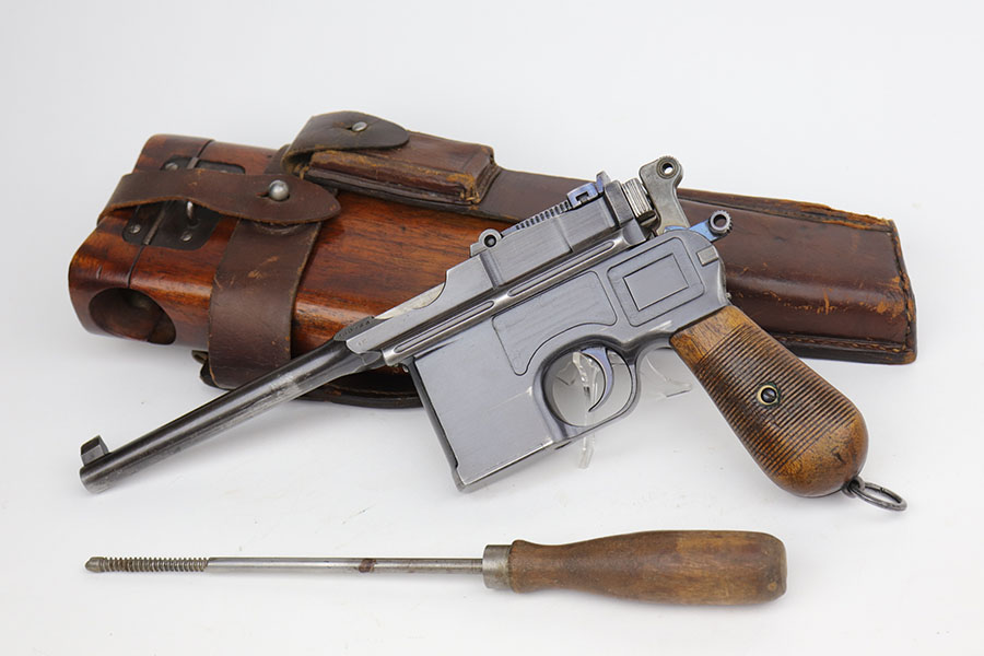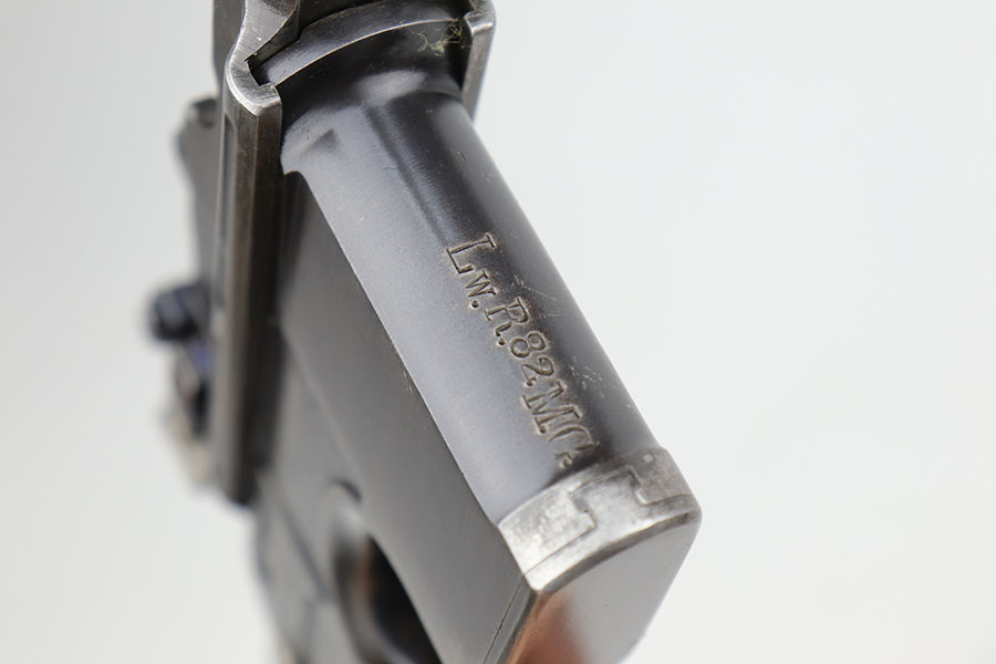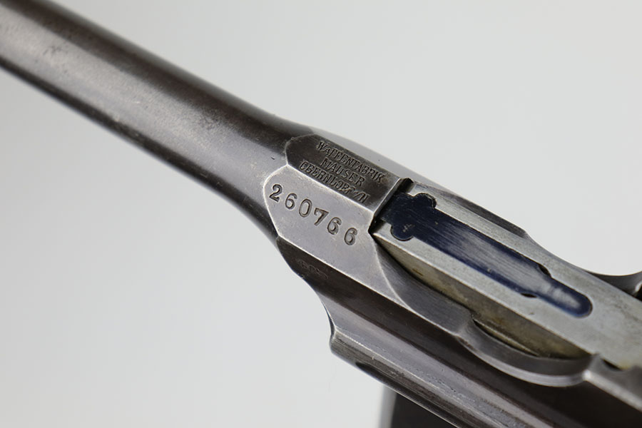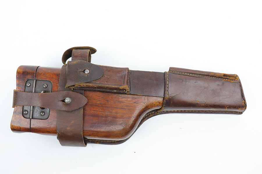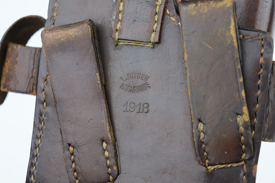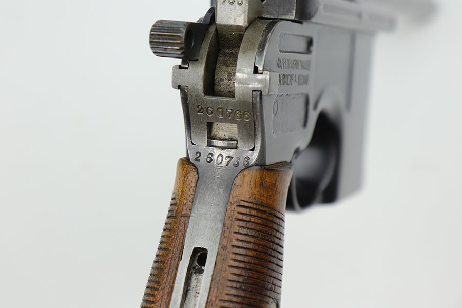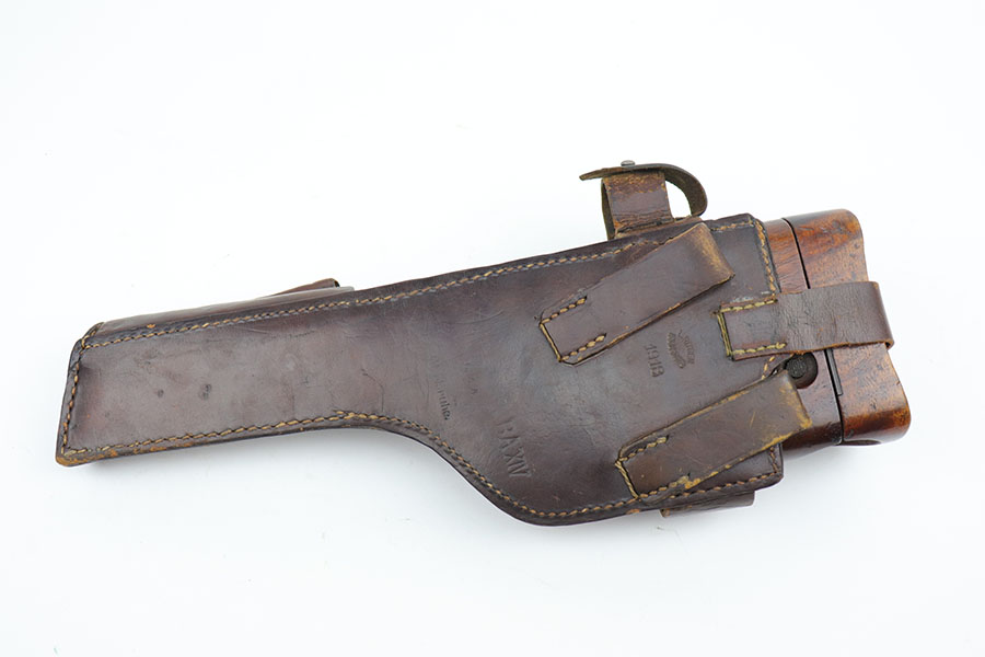 10/2/20 – This is an interesting and complete Mauser C96 Broomhandle rig with an original stock, unit marking on front of magazine well, harness and cleaning rod. The pistol has all original finish with a fair amount of thinning on the barrel from the stock and more on the mag well and grip frame. Small parts still retain most of the beautiful fire blue. Both the original grips are matching numbered to the gun. The stock is period original but mismatched to the pistol. The unit marking on the frame reads “Lw.R.82.Mg”, which is the 82nd Landwehr Infantry Regiment. That unit fought against the American Expeditionary Forces in the Battle of Saint-Mihiel, which is potentially where this gun was captured. Our consignor bought this gun in the 1970s directly from the vet that brought it back, and it has been in his possession ever since. Its sister pistol is also listed now, likely made in the factory on the same day over 100 years ago. The vet that captured this one was named Alex Kurmes and he was a medic. The harness on this gun is 1918 dated and in very good condition aside from the hole in the bottom of the cleaning rod pouch.
