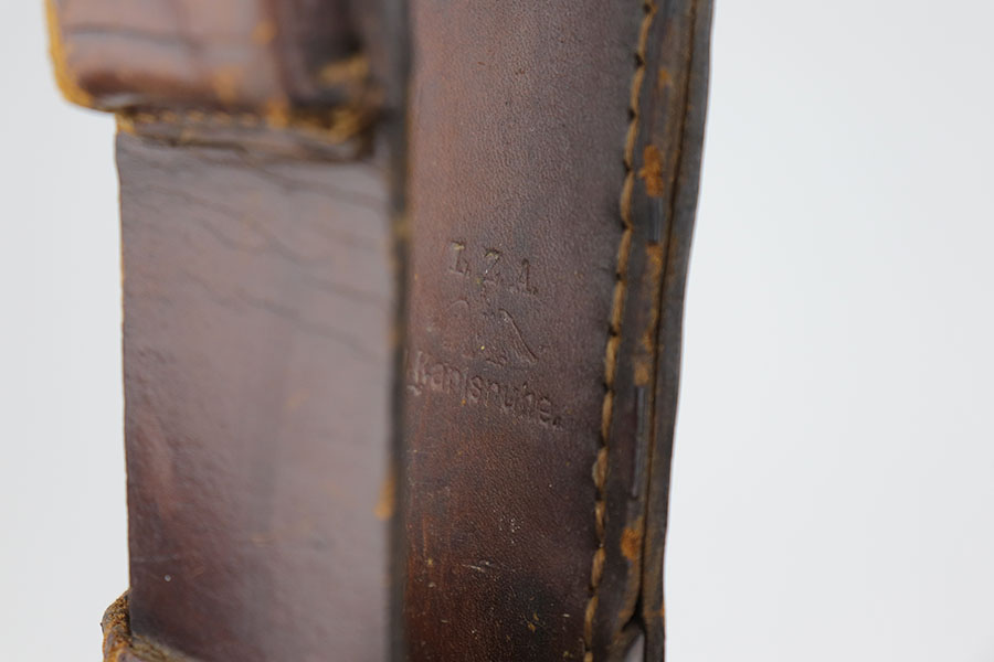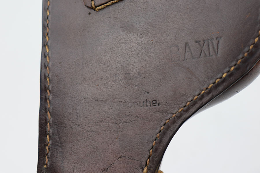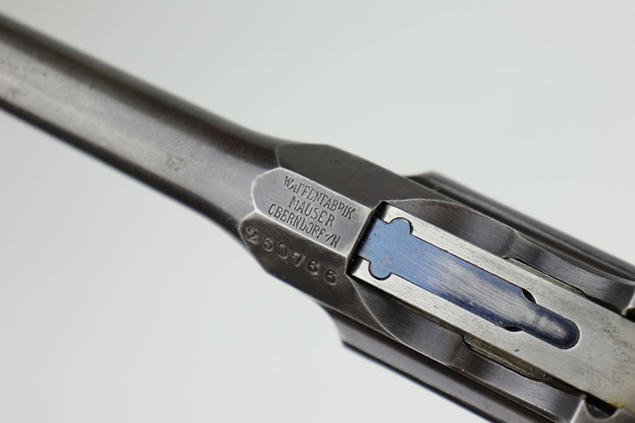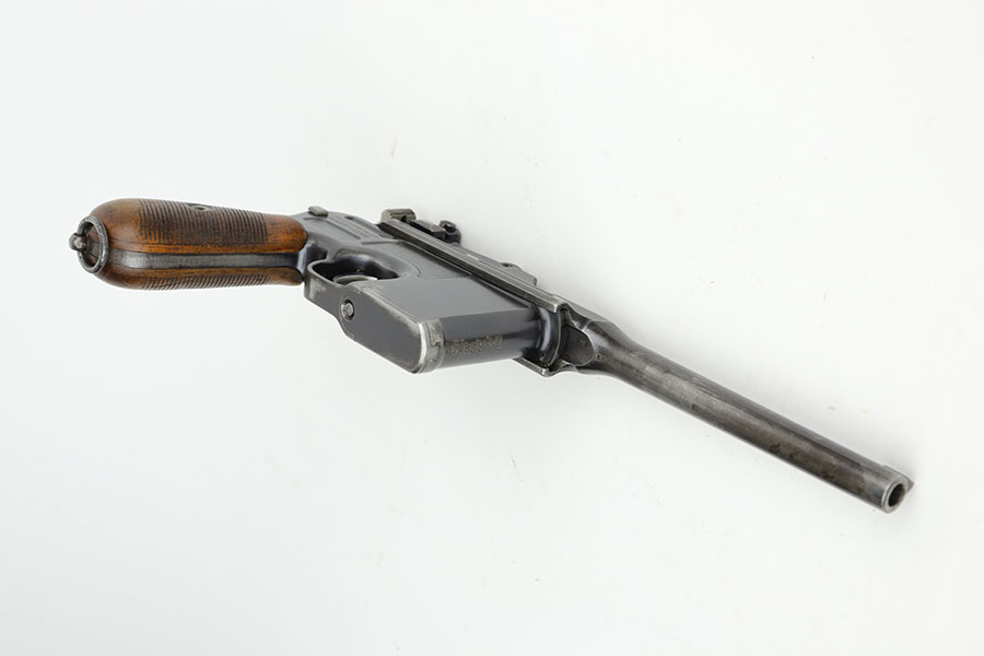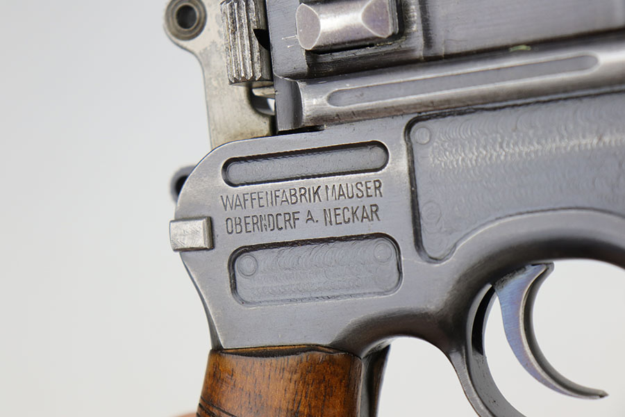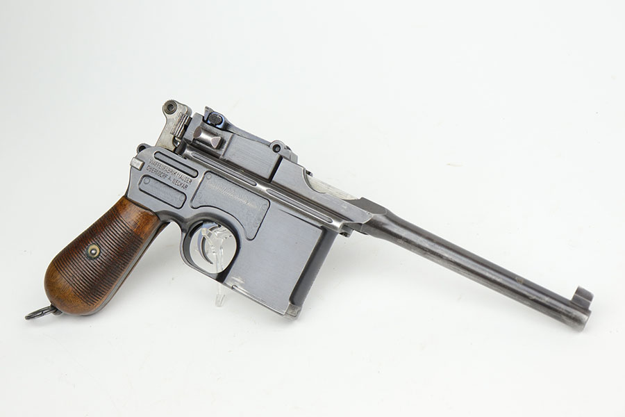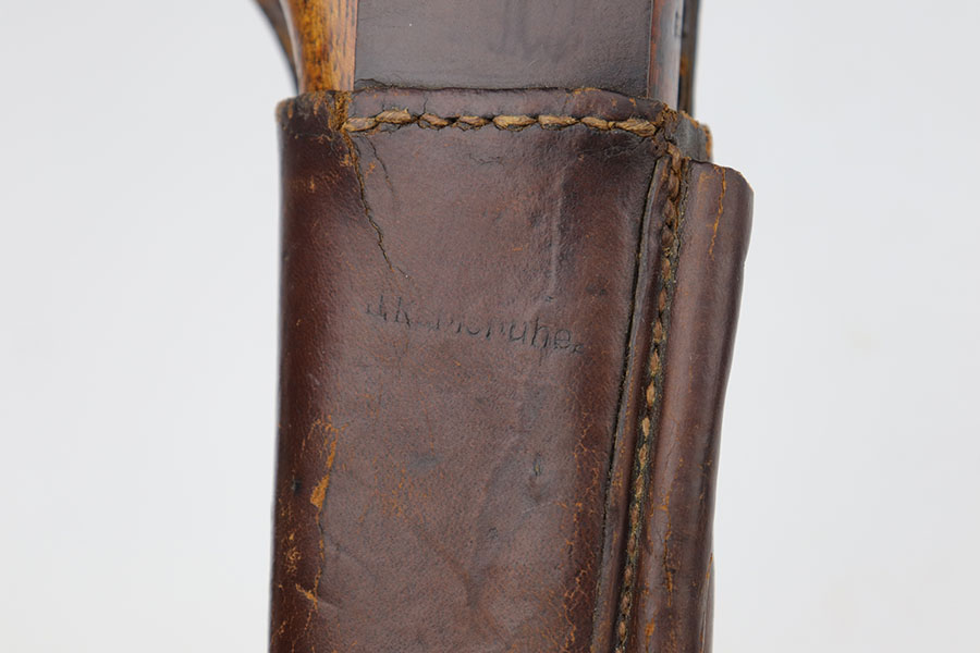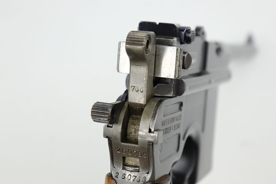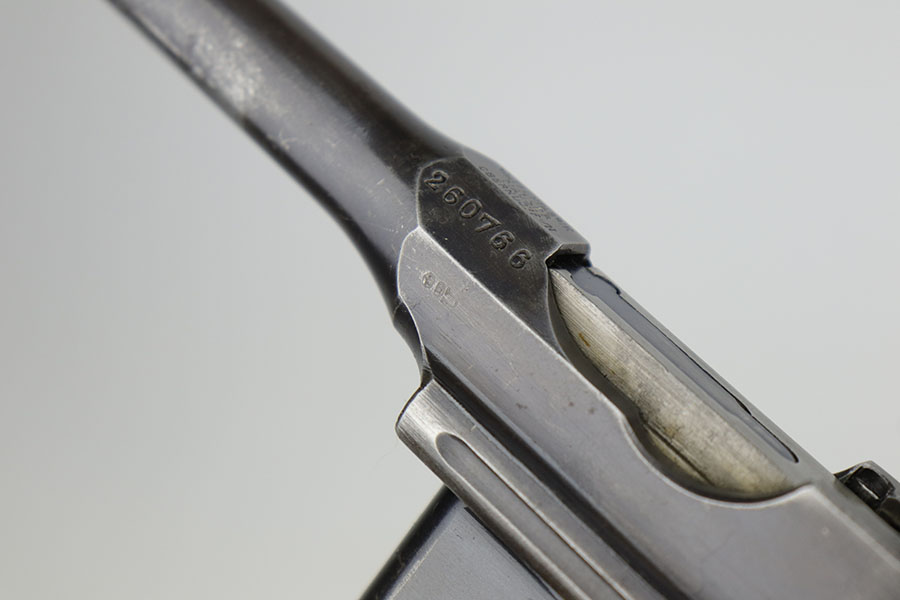 10/2/20 – This is an interesting and complete Mauser C96 Broomhandle rig with an original stock, unit marking on front of magazine well, harness and cleaning rod. The pistol has all original finish with a fair amount of thinning on the barrel from the stock and more on the mag well and grip frame. Small parts still retain most of the beautiful fire blue. Both the original grips are matching numbered to the gun. The stock is period original but mismatched to the pistol. The unit marking on the frame reads “Lw.R.82.Mg”, which is the 82nd Landwehr Infantry Regiment. That unit fought against the American Expeditionary Forces in the Battle of Saint-Mihiel, which is potentially where this gun was captured. Our consignor bought this gun in the 1970s directly from the vet that brought it back, and it has been in his possession ever since. Its sister pistol is also listed now, likely made in the factory on the same day over 100 years ago. The vet that captured this one was named Alex Kurmes and he was a medic. The harness on this gun is 1918 dated and in very good condition aside from the hole in the bottom of the cleaning rod pouch.