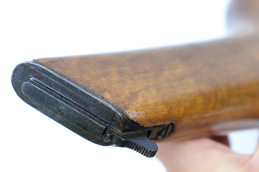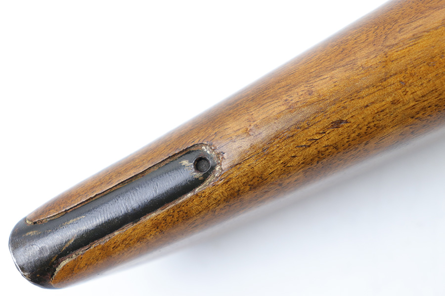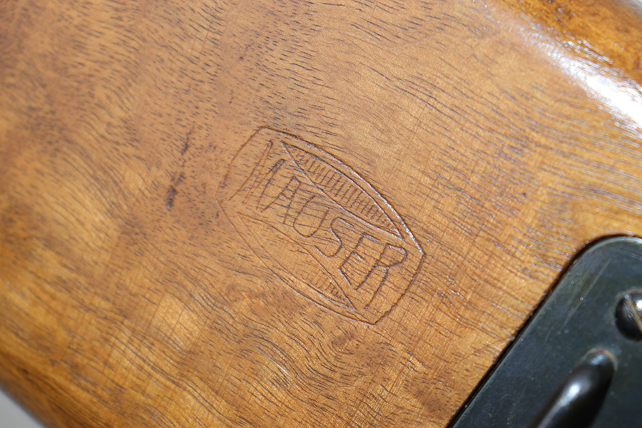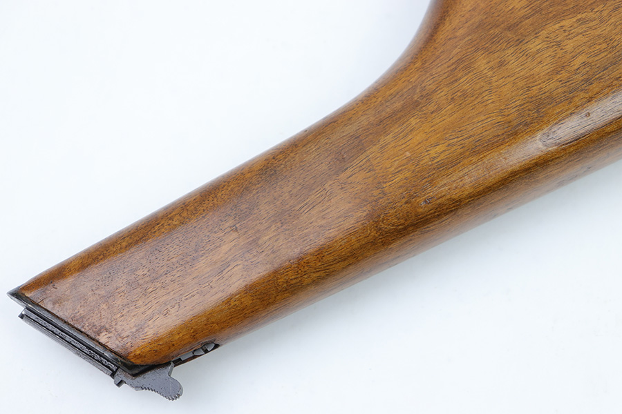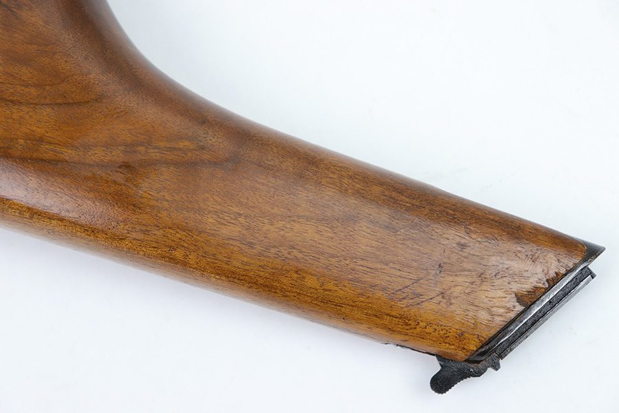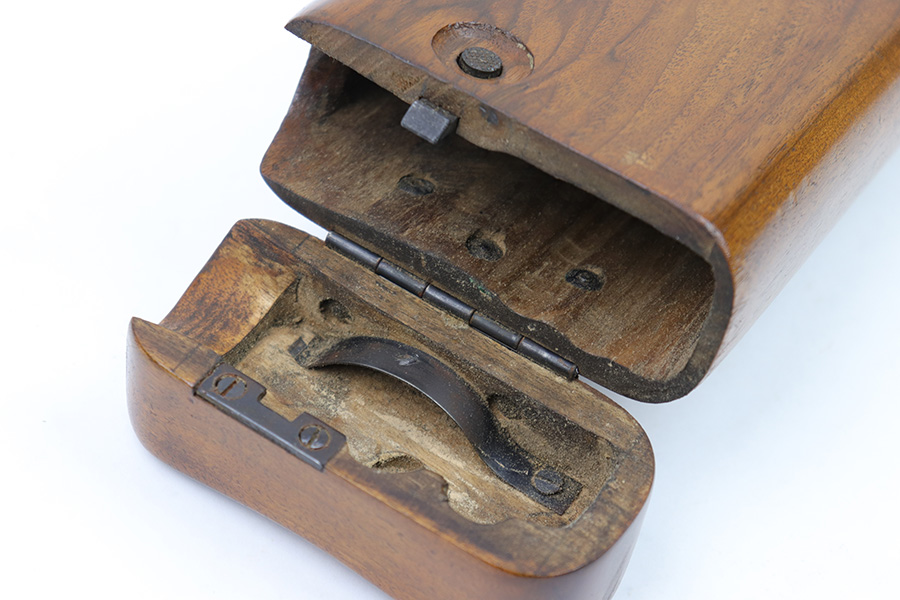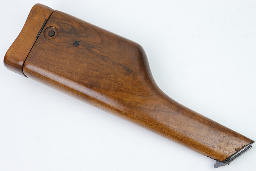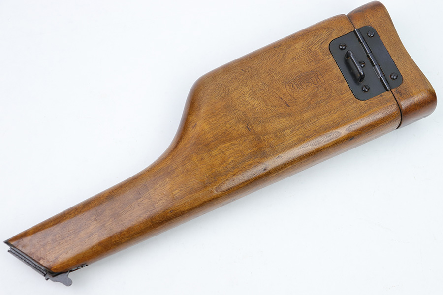 2/2/23 – This is an original Mauser C96 Broomhandle commercial holster / stock attachment. The wood has no cracks and is overall in great condition. There’s an original Mauser banner stamp on one side, as shown. The metal attachment piece has some mild surface wear but no rust or pitting. There’s no markings or stamps on the metal. There is some very mild chipping of the wood near where the wood meets the metal attachment piece on one side. The lid opens and shuts freely without issue and locks properly.