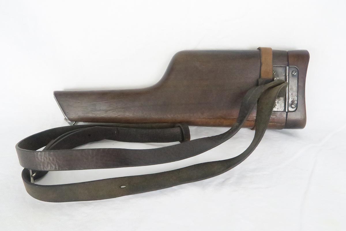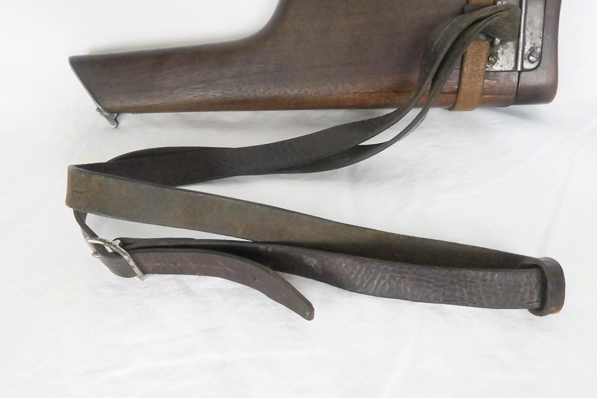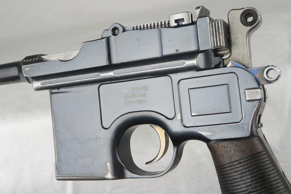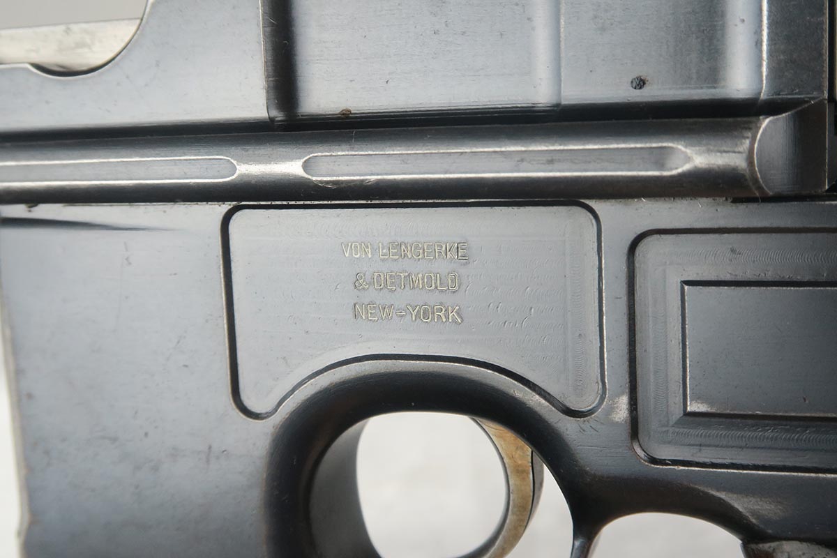 12/11/17 – This is a nice pre-war Mauser C96 Broomhandle rig, produced for the commercial market prior to WWI. It is all original and correct, with matching grips and about 85% blue remaining. The wear is generally found on the high edges, straps and barrel, likely from being in the stock. The stock is original and numbered to the pistol, and is in decent condition but does show two thin cracks that a previous owner attempted to repair. The leather on the stock is original and in good condition, with no tears. The pistol shows proper features for a pre-war commercial, such as 7.63mm, 50-1000 meter tangent sight, hole through safety knob, small ring hammer, 6 groove rifling in the bore, and serial in proper range. This serial dates to a 1905 manufacture date, and the left side frame is proofed VON LENGERKE & DETMOLD, NEW-YORK. This is likely a retailer the pistol was sold for/by, and not the same as an import mark. The bore shows minor frost and freckling but is pretty good overall, and would fire just fine.