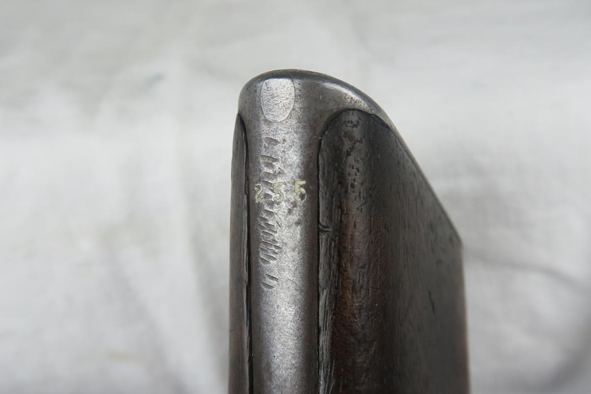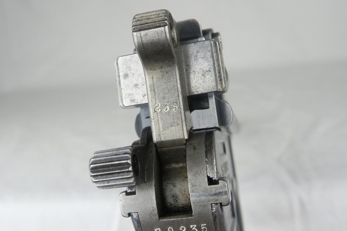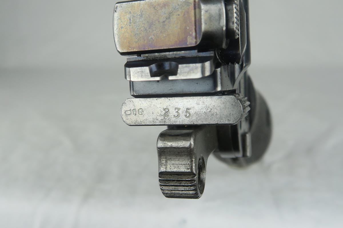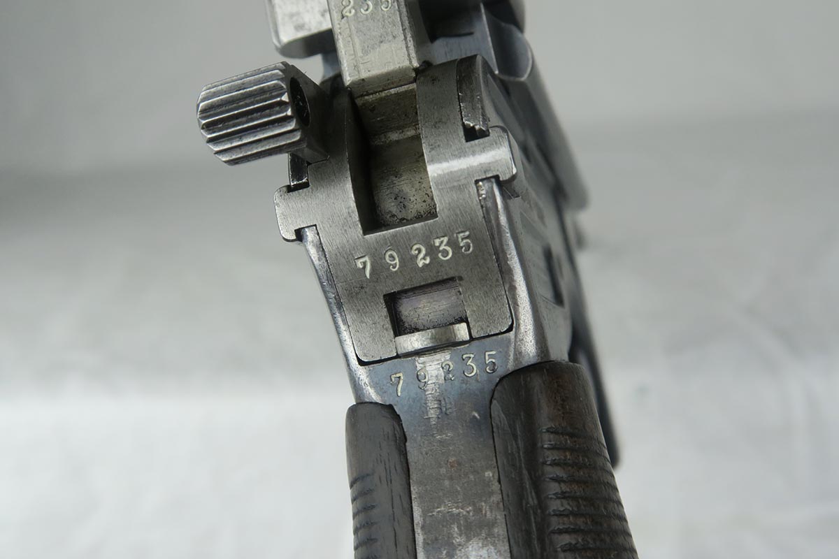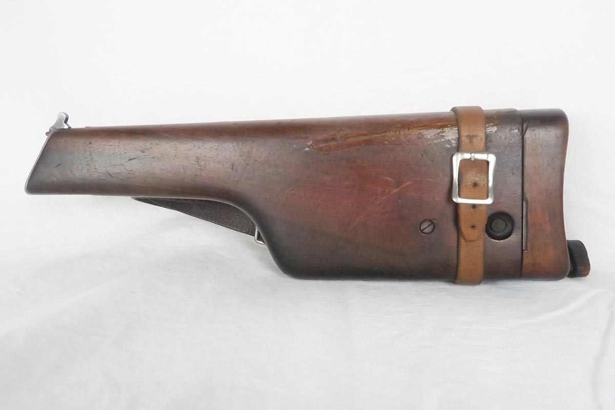 12/11/17 – This is a nice pre-war Mauser C96 Broomhandle rig, produced for the commercial market prior to WWI. It is all original and correct, with matching grips and about 85% blue remaining. The wear is generally found on the high edges, straps and barrel, likely from being in the stock. The stock is original and numbered to the pistol, and is in decent condition but does show two thin cracks that a previous owner attempted to repair. The leather on the stock is original and in good condition, with no tears. The pistol shows proper features for a pre-war commercial, such as 7.63mm, 50-1000 meter tangent sight, hole through safety knob, small ring hammer, 6 groove rifling in the bore, and serial in proper range. This serial dates to a 1905 manufacture date, and the left side frame is proofed VON LENGERKE & DETMOLD, NEW-YORK. This is likely a retailer the pistol was sold for/by, and not the same as an import mark. The bore shows minor frost and freckling but is pretty good overall, and would fire just fine.