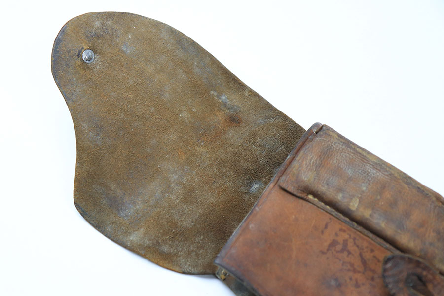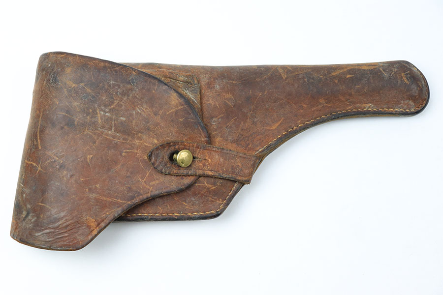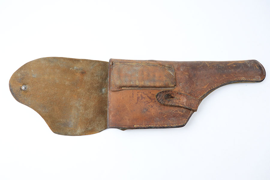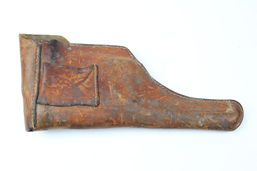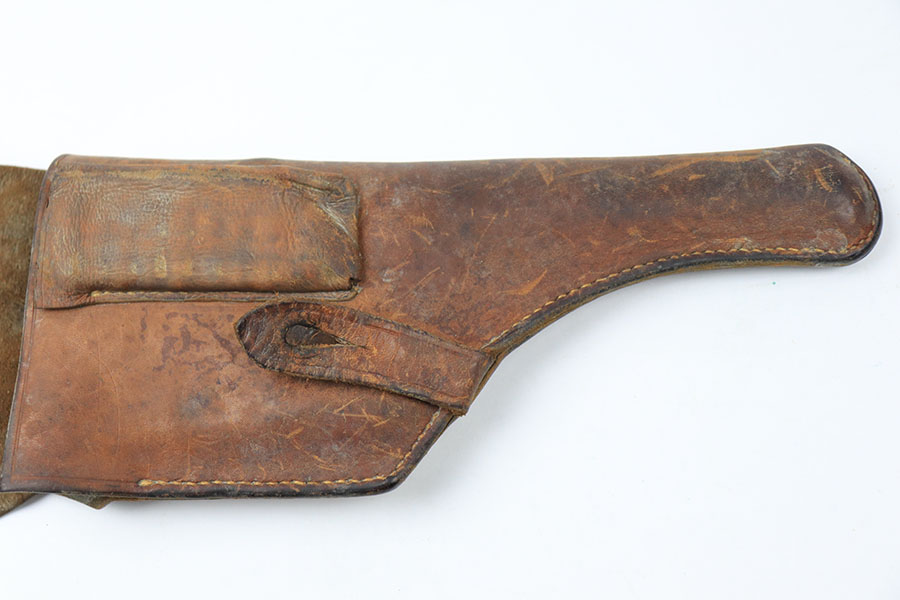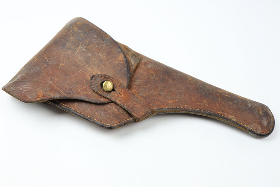 9/30/21 – This is an unmarked holster for a Mauser C96 Broomhandle pistol. The holster has a brass closure knob and no markings or stamps. The exterior leather has light surface scuffs throughout and typical signs of previous use and aging. There are no stitching issues.
