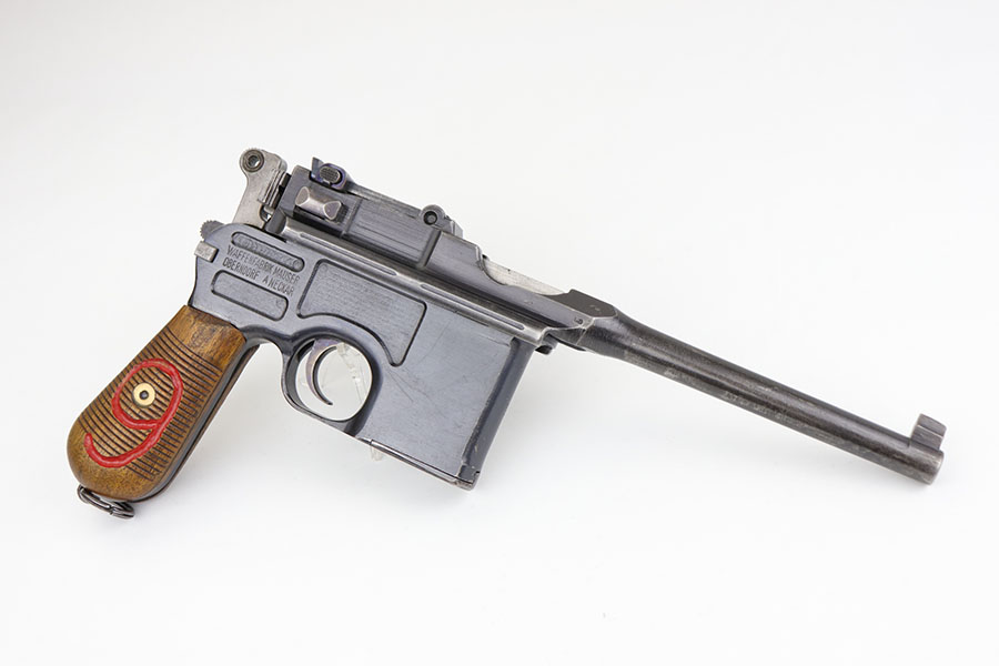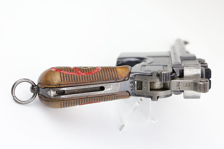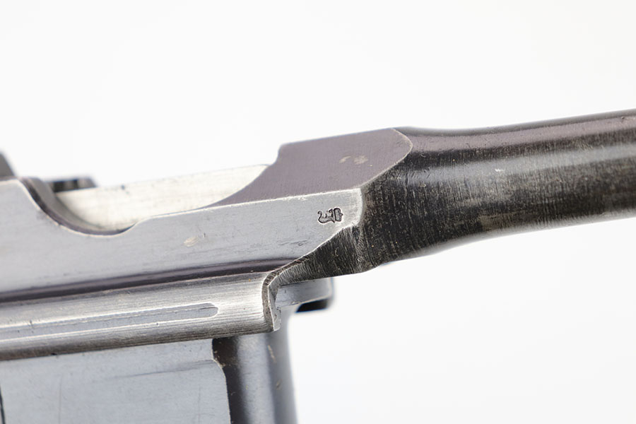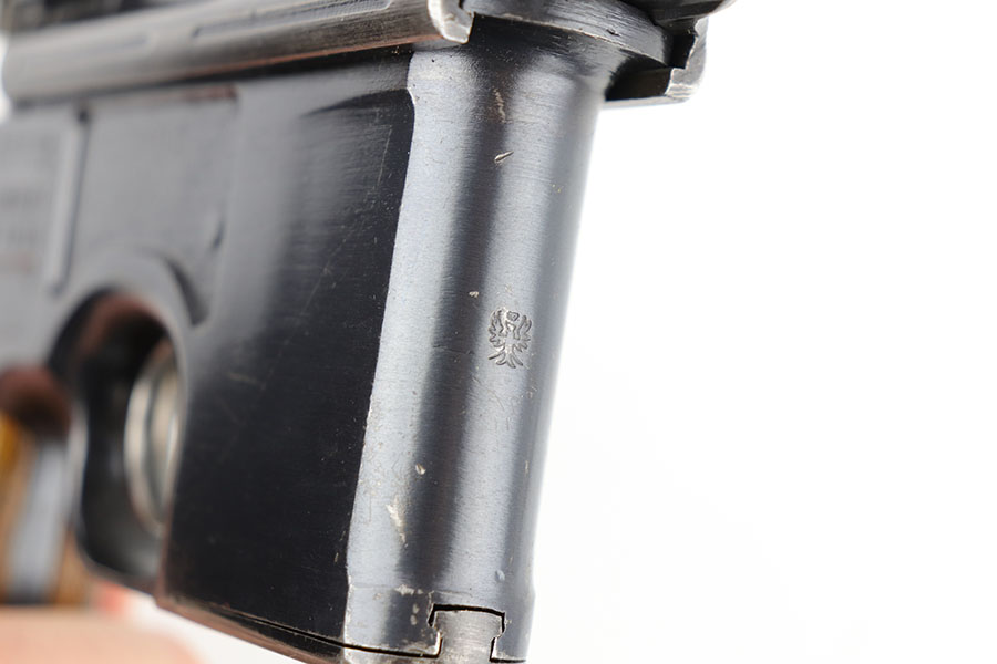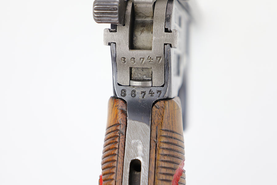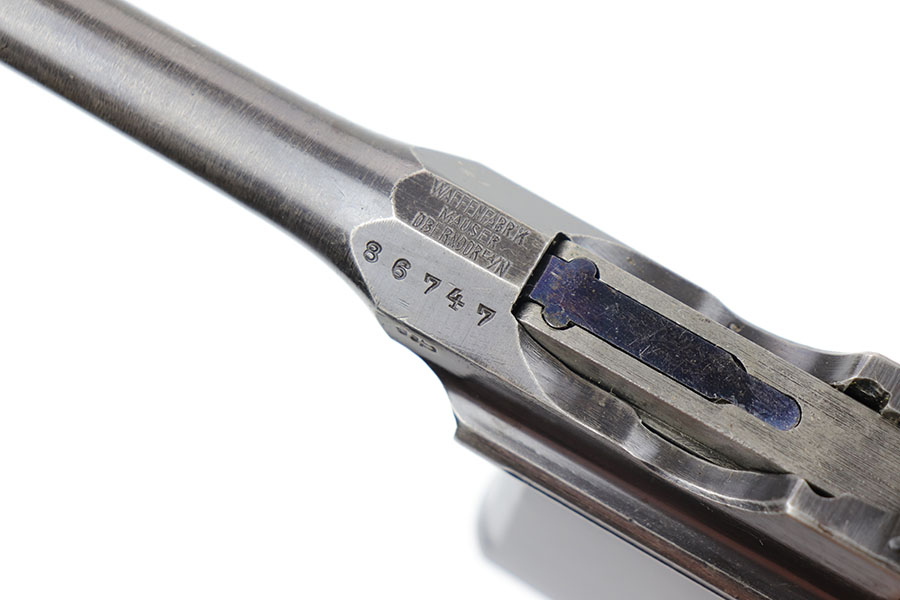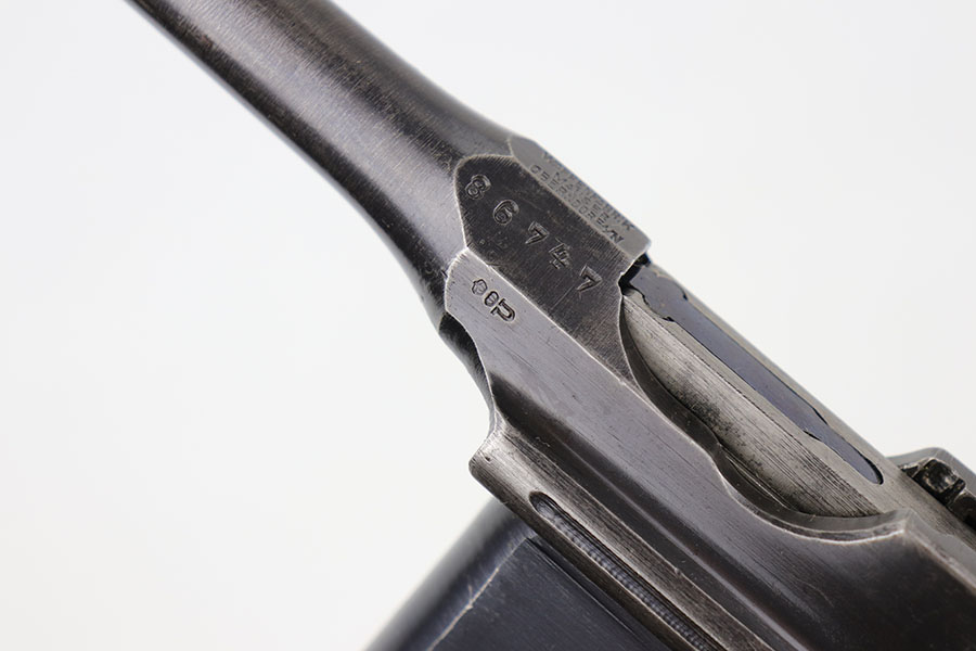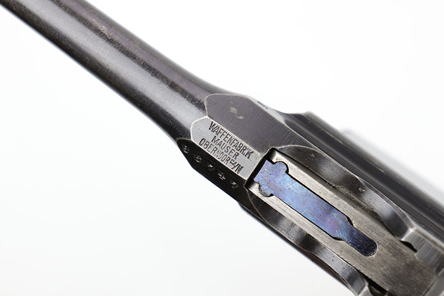 4/5/21 – This is a nice example of an all original ‘Red 9’ Mauser C96. Unlike its commercial counterparts, “Red 9” Broomhandles were chambered in the more common 9mm Para caliber, which was used by the German Army and were marked with a large 9 on the grips which was then filled with red or orange paint to help German soldiers differentiate its caliber from the standard .30 mauser cartridge. Only about 130,000 of these very collectible guns were made, with only about 100,000 being accepted by the army and issued to the troops. Considered to be a substitute for a light carbine, they became very popular in trench warfare and were used by some of the Germany’s elite crack troops. The gun has about 90% of the original blue with most of the wear on the barrel, likely from rubbing against the inside of a stock. Pistol has a nice profile view though. Imperial proof on front of magazine. Small parts on the pistol show brilliant fire blue still. The grips are unmarked internally, with the large red 9 externally. Unfortunately, pistol bore wasn’t cared for very well, as there is frost and freckling through the grooves.