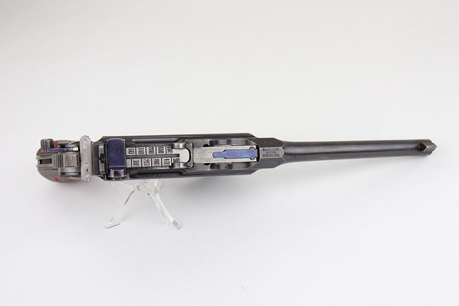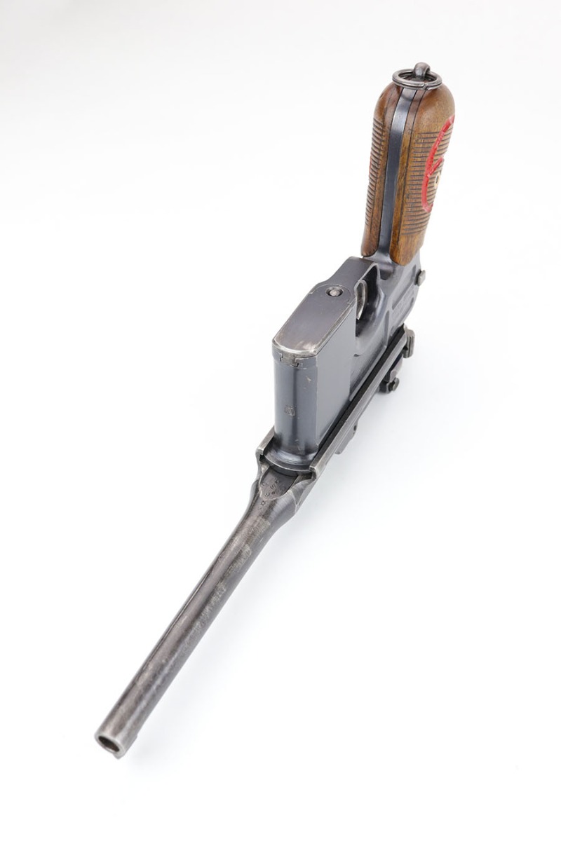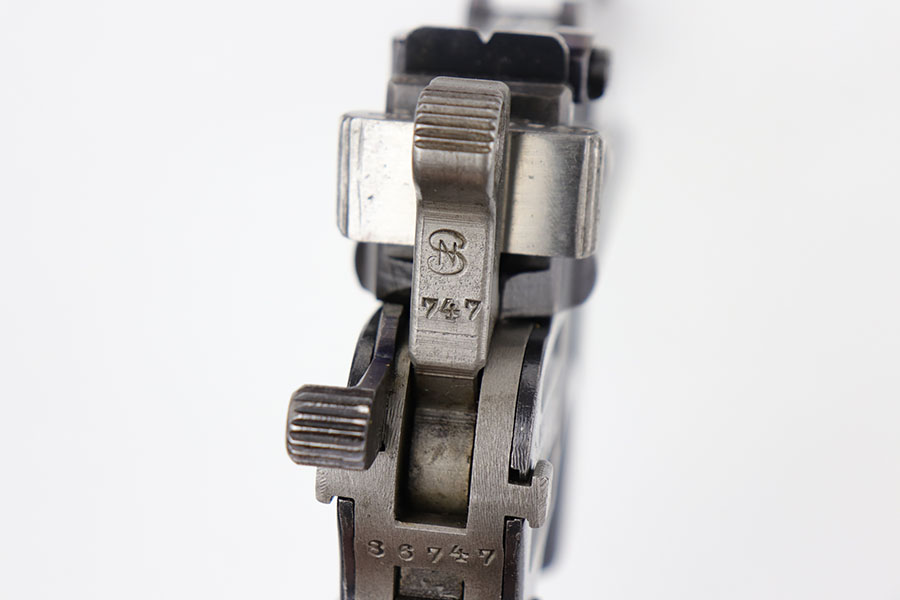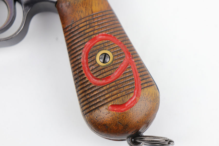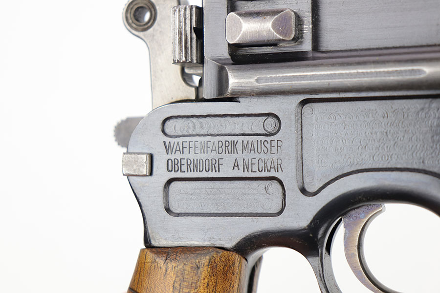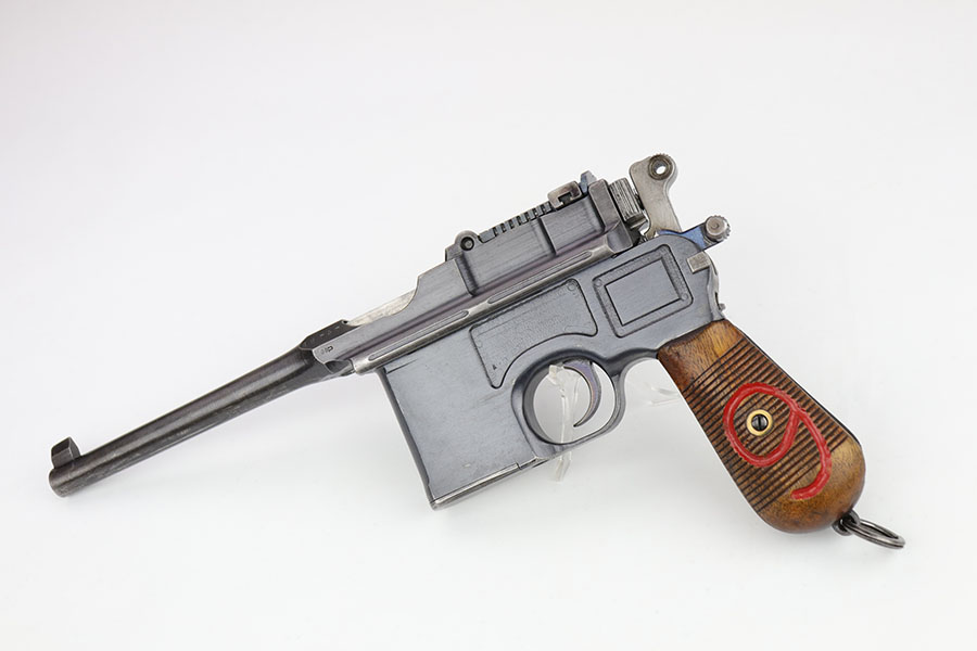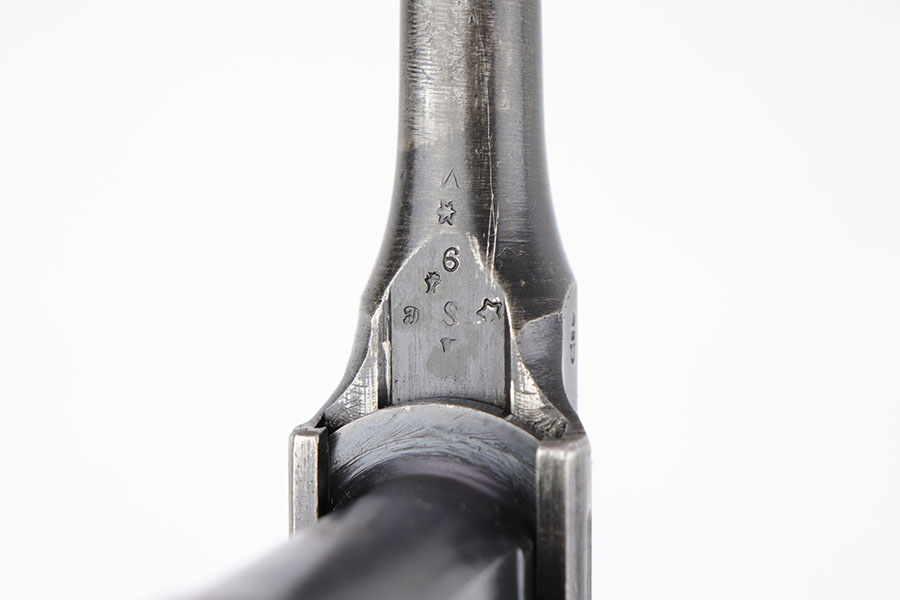 4/5/21 – This is a nice example of an all original ‘Red 9’ Mauser C96. Unlike its commercial counterparts, “Red 9” Broomhandles were chambered in the more common 9mm Para caliber, which was used by the German Army and were marked with a large 9 on the grips which was then filled with red or orange paint to help German soldiers differentiate its caliber from the standard .30 mauser cartridge. Only about 130,000 of these very collectible guns were made, with only about 100,000 being accepted by the army and issued to the troops. Considered to be a substitute for a light carbine, they became very popular in trench warfare and were used by some of the Germany’s elite crack troops. The gun has about 90% of the original blue with most of the wear on the barrel, likely from rubbing against the inside of a stock. Pistol has a nice profile view though. Imperial proof on front of magazine. Small parts on the pistol show brilliant fire blue still. The grips are unmarked internally, with the large red 9 externally. Unfortunately, pistol bore wasn’t cared for very well, as there is frost and freckling through the grooves.