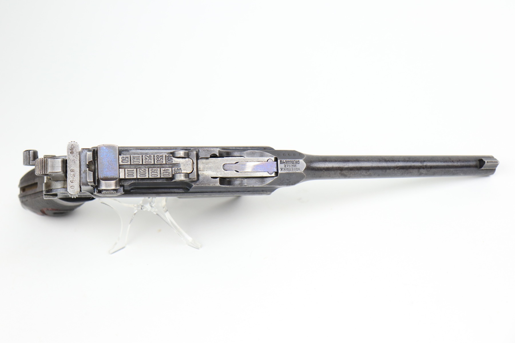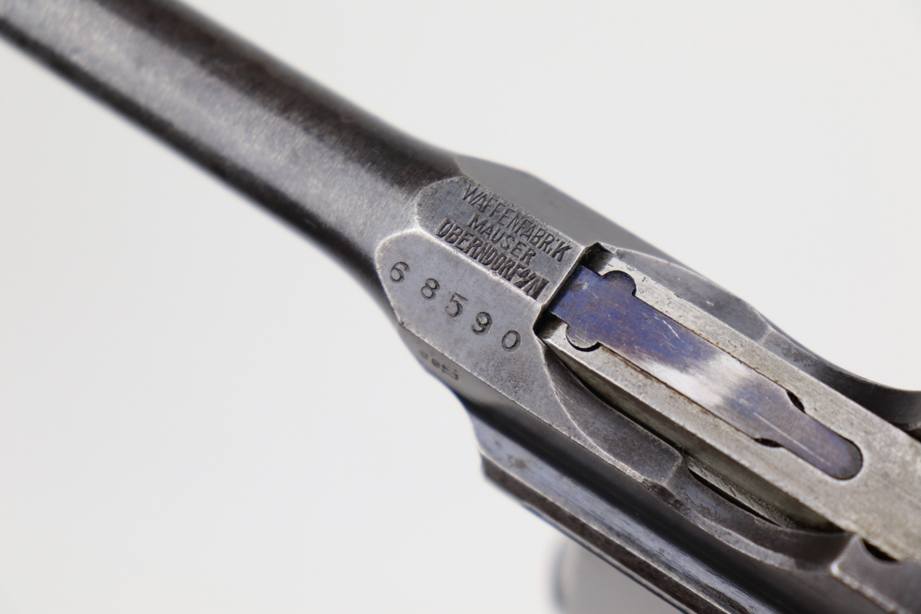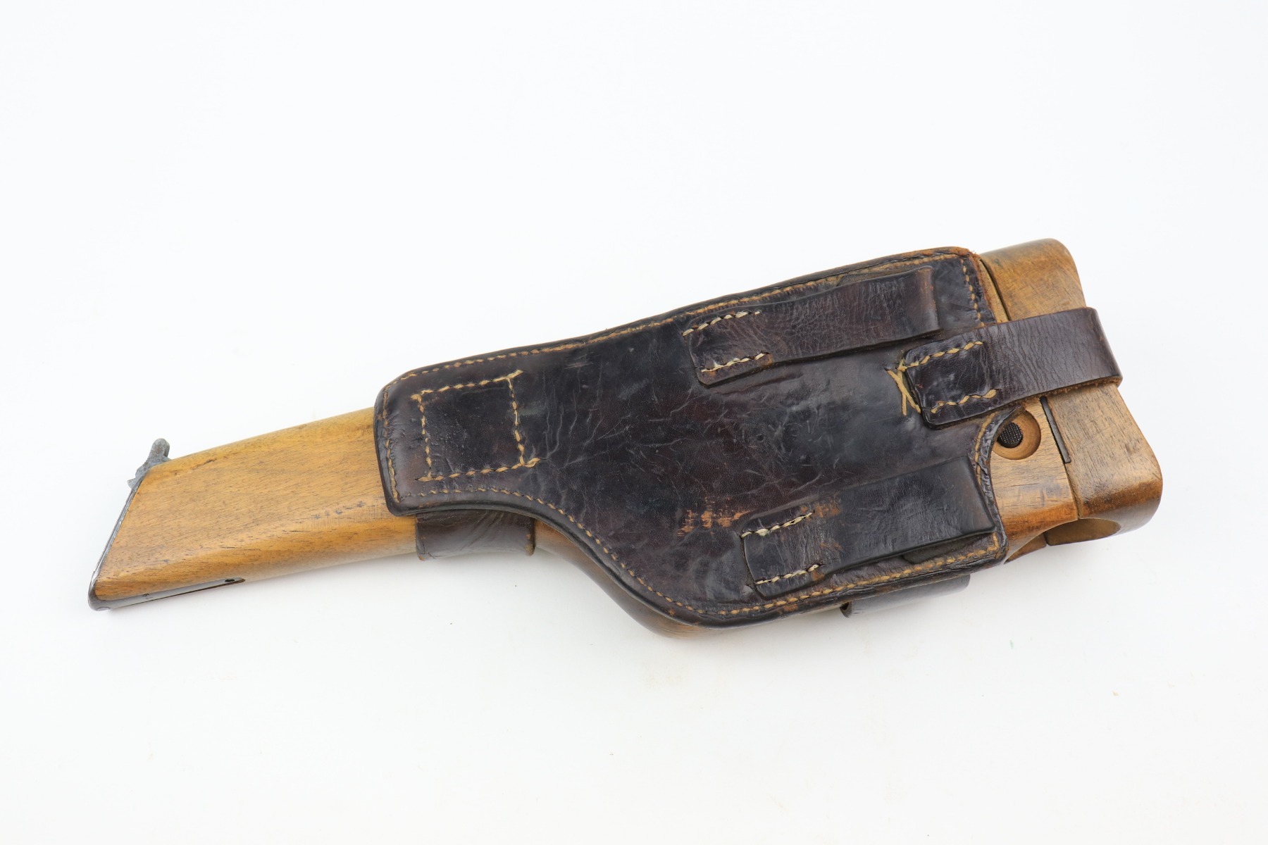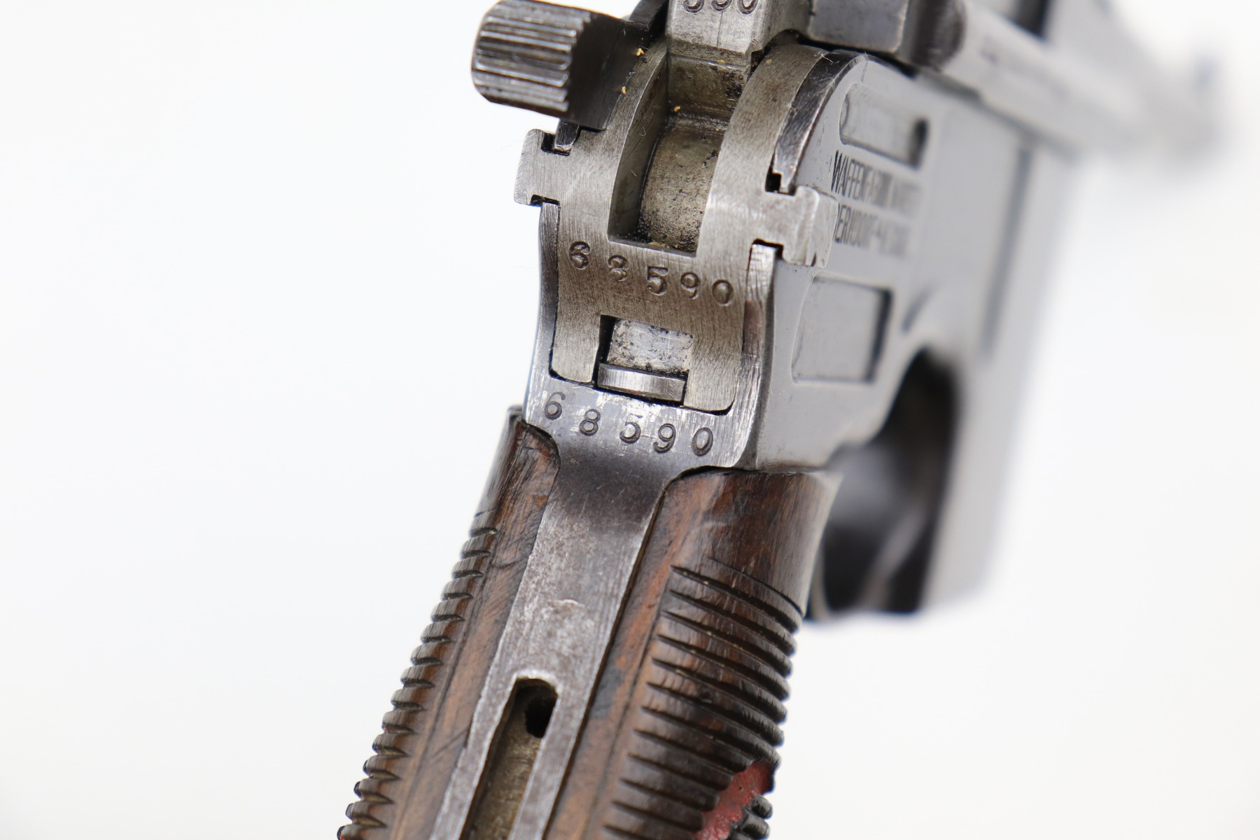 1/11/21 – This is a nice example of a Mauser C96 Broomhandle, chambered in 9mm. It is often referred to as the “Red 9”. Unlike its commercial counterparts, “Red 9” Broomhandles were chambered in the more common 9mm Para caliber, which was used by the German Army and were marked with a large 9 on the grips which was then filled with red or orange paint to help German soldiers differentiate its caliber from the standard .30 mauser cartridge. Only about 130,000 of these very collectible guns were made, with only about 100,000 being accepted by the army and issued to the troops. Considered to be a substitute for a light carbine, they became very popular in trench warfare and were used by some of the Germany’s elite crack troops. It is all matching and the gun rates about 80%. There is wear on the high edges and thinning on the barrel and sides of the gun. There is spotty oxidation throughout. Light scratch on the right side of the slide. It comes with nice Red 9 grips that match each other but do not match the gun. They are very close, though, in the 68k serial range. The rifling in the bore is a bit worn and there is pin-pricking throughout. The rig comes with a mismatched period-correct stock and period-correct leather harness.
