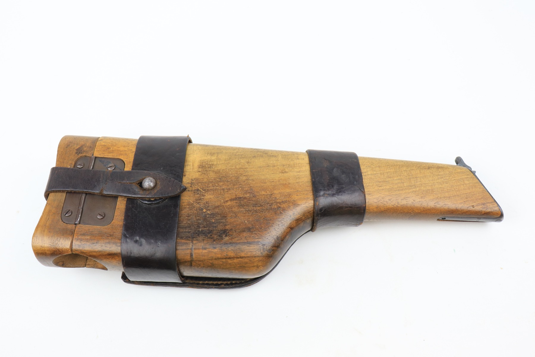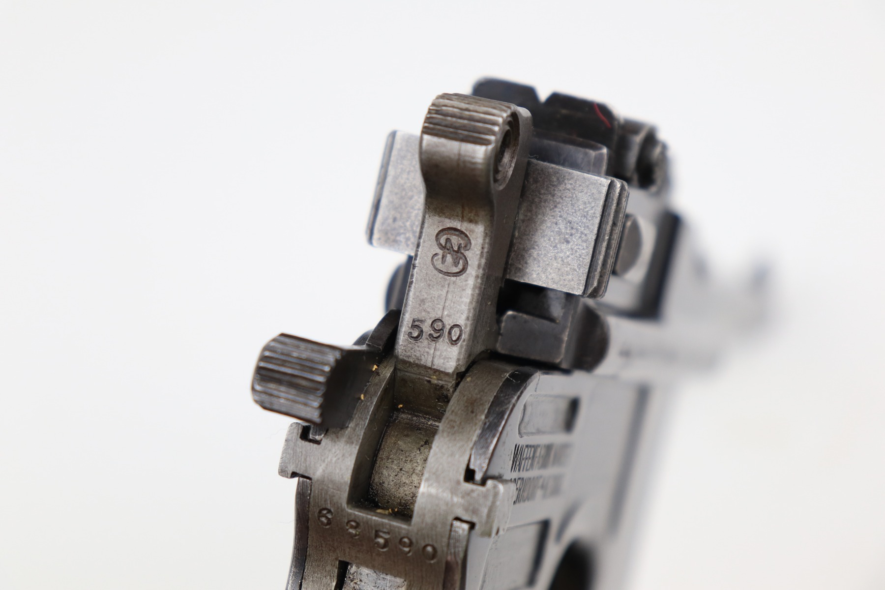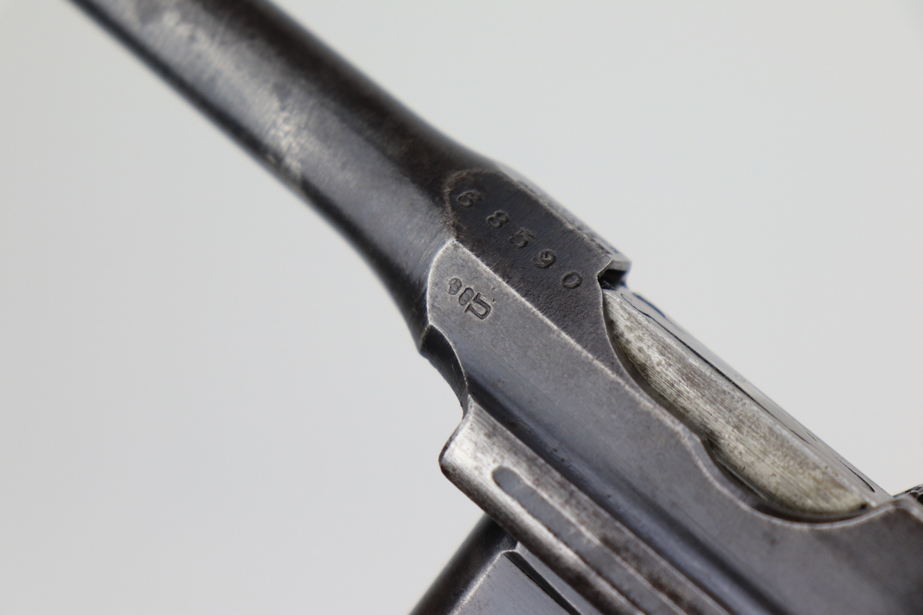1/11/21 – This is a nice example of a Mauser C96 Broomhandle, chambered in 9mm. It is often referred to as the “Red 9”. Unlike its commercial counterparts, “Red 9” Broomhandles were chambered in the more common 9mm Para caliber, which was used by the German Army and were marked with a large 9 on the grips which was then filled with red or orange paint to help German soldiers differentiate its caliber from the standard .30 mauser cartridge. Only about 130,000 of these very collectible guns were made, with only about 100,000 being accepted by the army and issued to the troops. Considered to be a substitute for a light carbine, they became very popular in trench warfare and were used by some of the Germany’s elite crack troops. It is all matching and the gun rates about 80%. There is wear on the high edges and thinning on the barrel and sides of the gun. There is spotty oxidation throughout. Light scratch on the right side of the slide. It comes with nice Red 9 grips that match each other but do not match the gun. They are very close, though, in the 68k serial range. The rifling in the bore is a bit worn and there is pin-pricking throughout. The rig comes with a mismatched period-correct stock and period-correct leather harness.