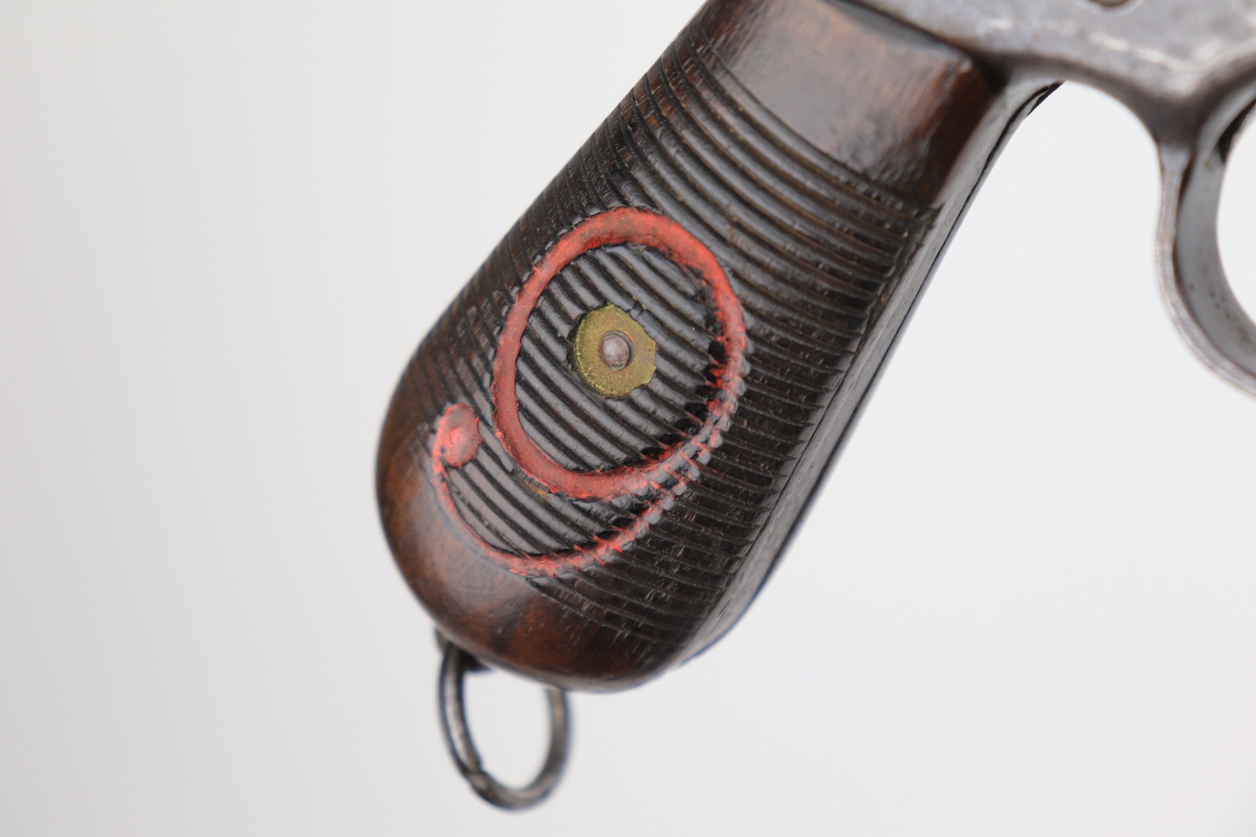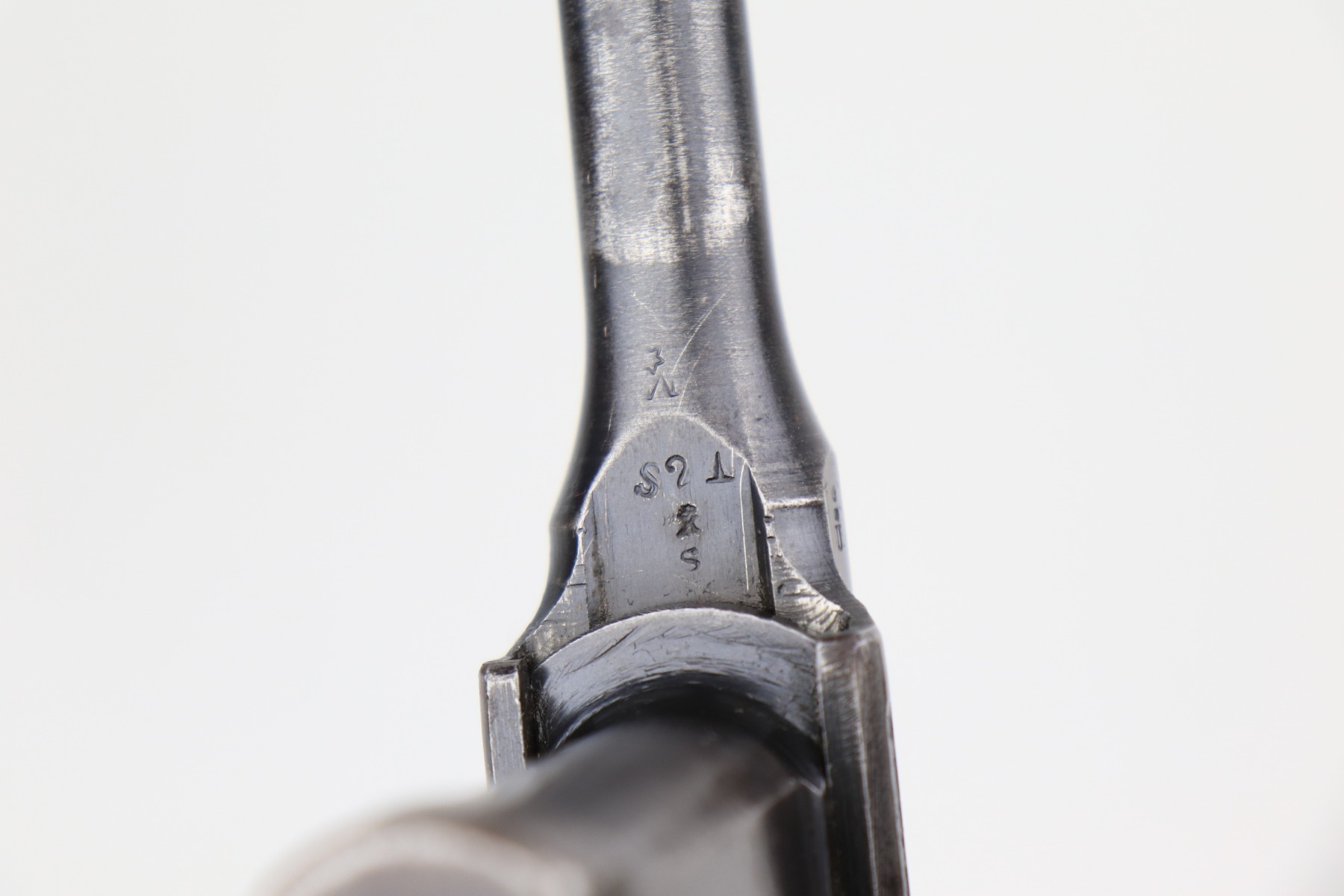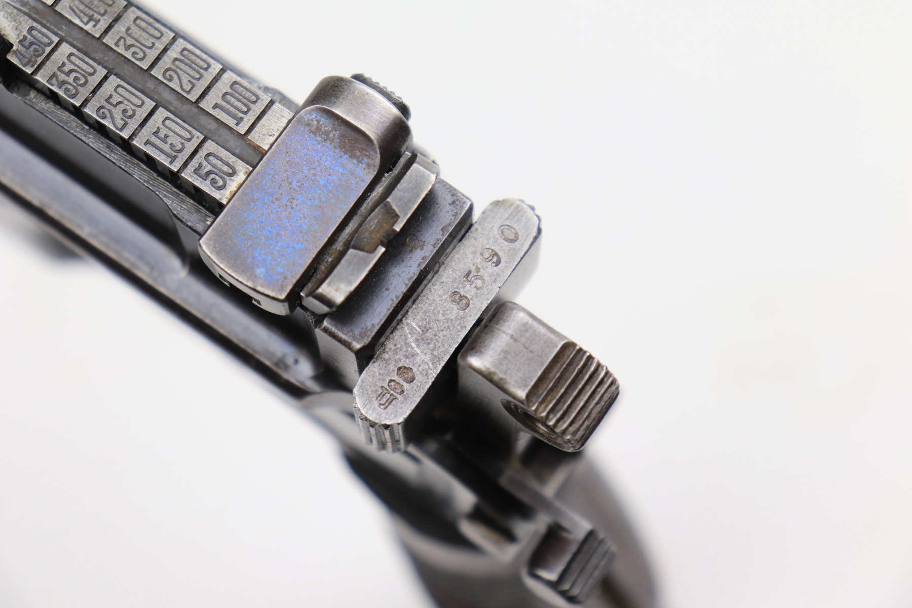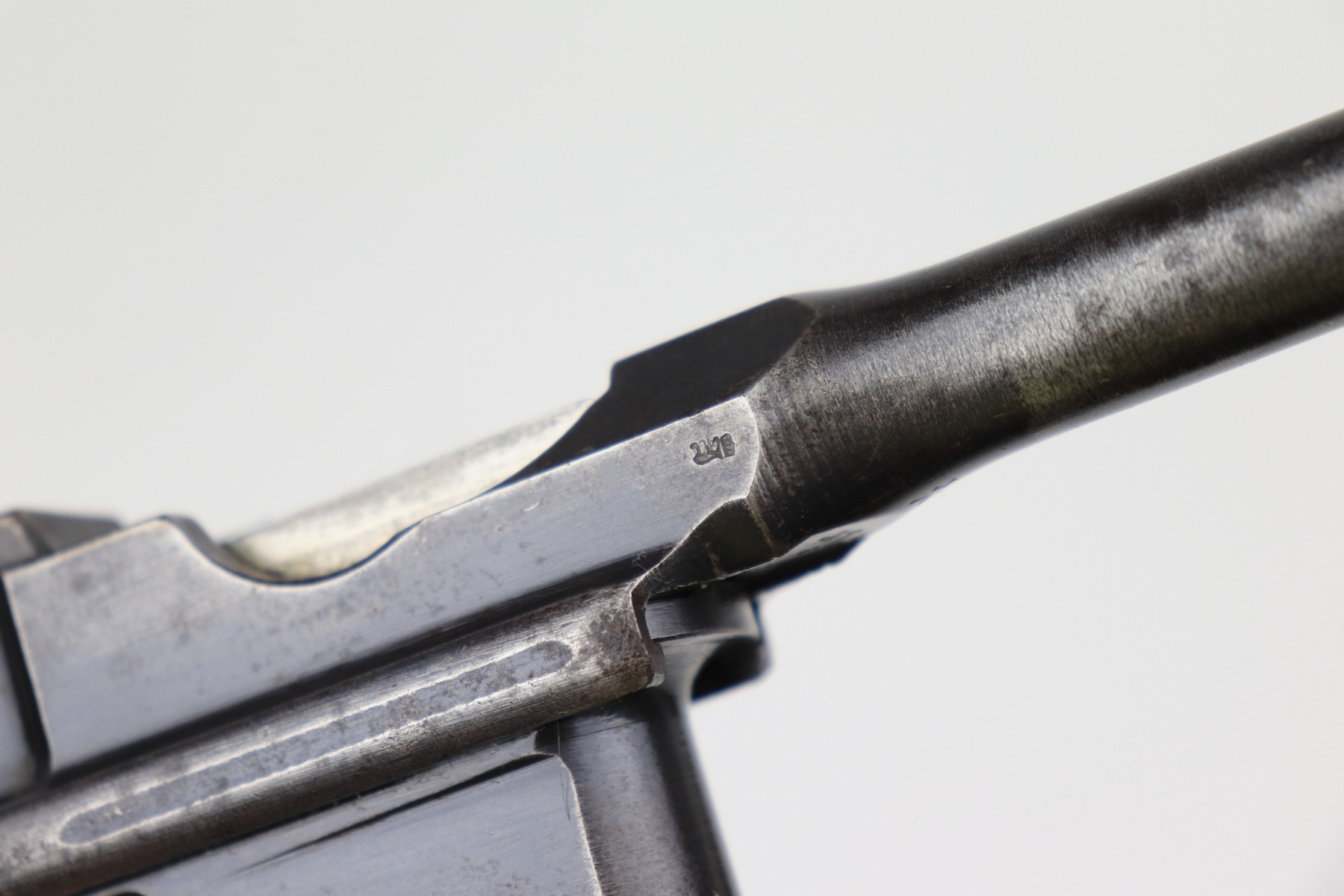 1/11/21 – This is a nice example of a Mauser C96 Broomhandle, chambered in 9mm. It is often referred to as the “Red 9”. Unlike its commercial counterparts, “Red 9” Broomhandles were chambered in the more common 9mm Para caliber, which was used by the German Army and were marked with a large 9 on the grips which was then filled with red or orange paint to help German soldiers differentiate its caliber from the standard .30 mauser cartridge. Only about 130,000 of these very collectible guns were made, with only about 100,000 being accepted by the army and issued to the troops. Considered to be a substitute for a light carbine, they became very popular in trench warfare and were used by some of the Germany’s elite crack troops. It is all matching and the gun rates about 80%. There is wear on the high edges and thinning on the barrel and sides of the gun. There is spotty oxidation throughout. Light scratch on the right side of the slide. It comes with nice Red 9 grips that match each other but do not match the gun. They are very close, though, in the 68k serial range. The rifling in the bore is a bit worn and there is pin-pricking throughout. The rig comes with a mismatched period-correct stock and period-correct leather harness.