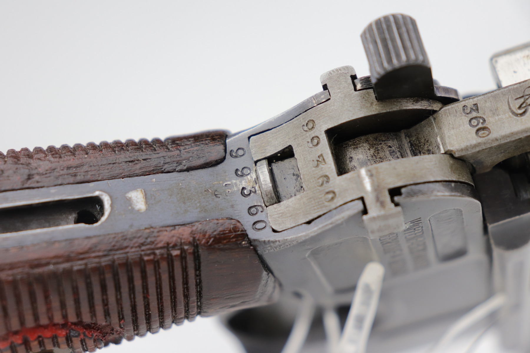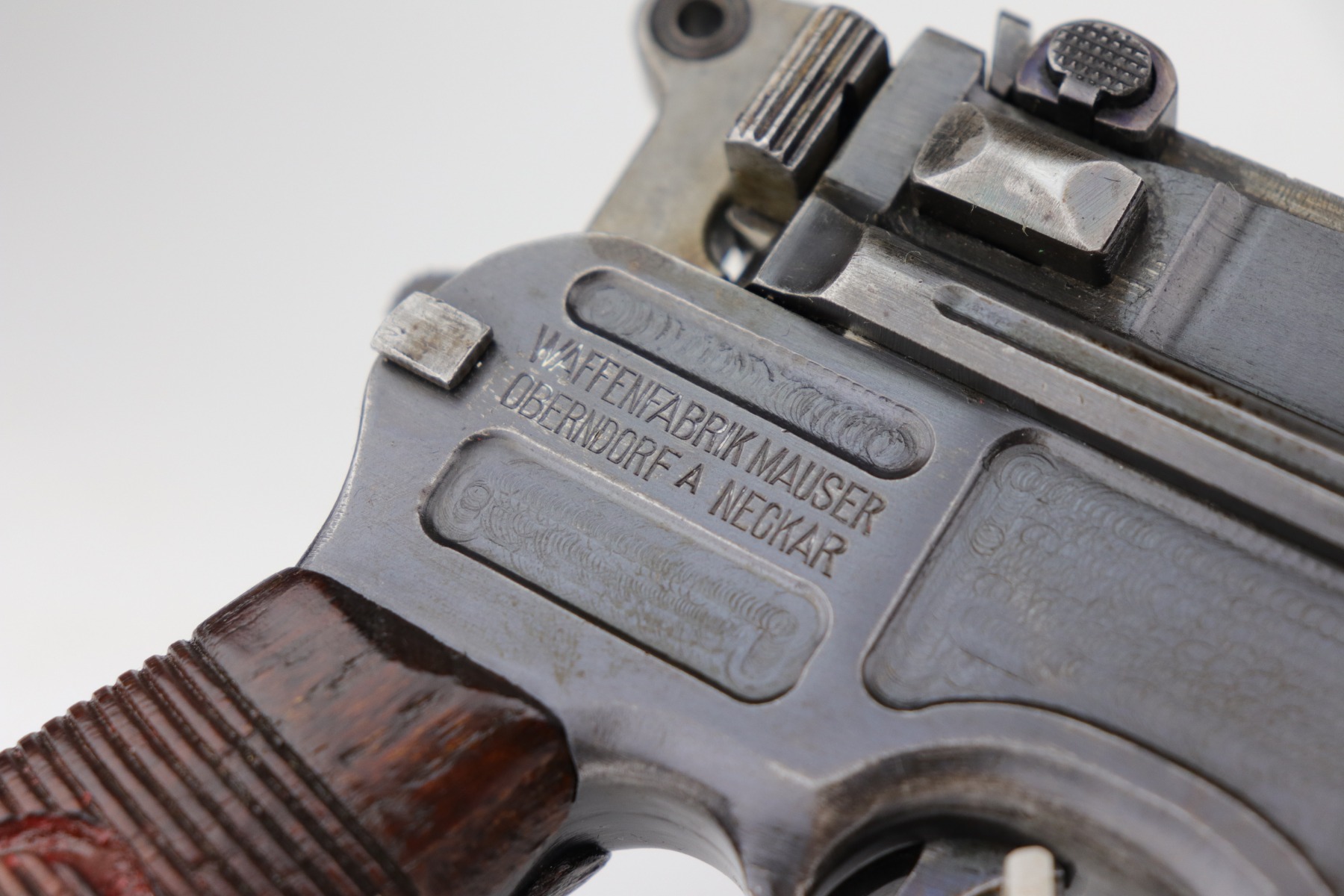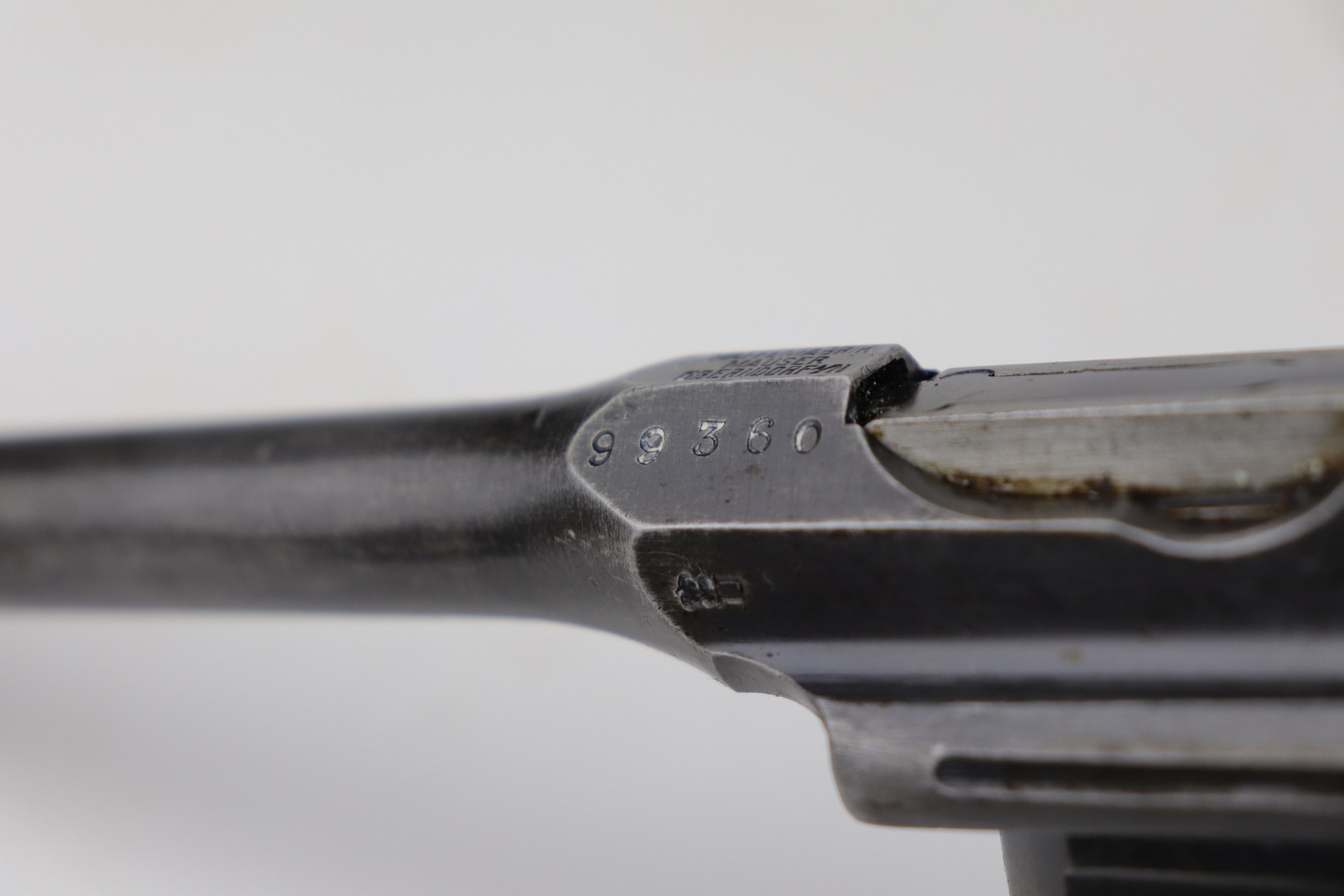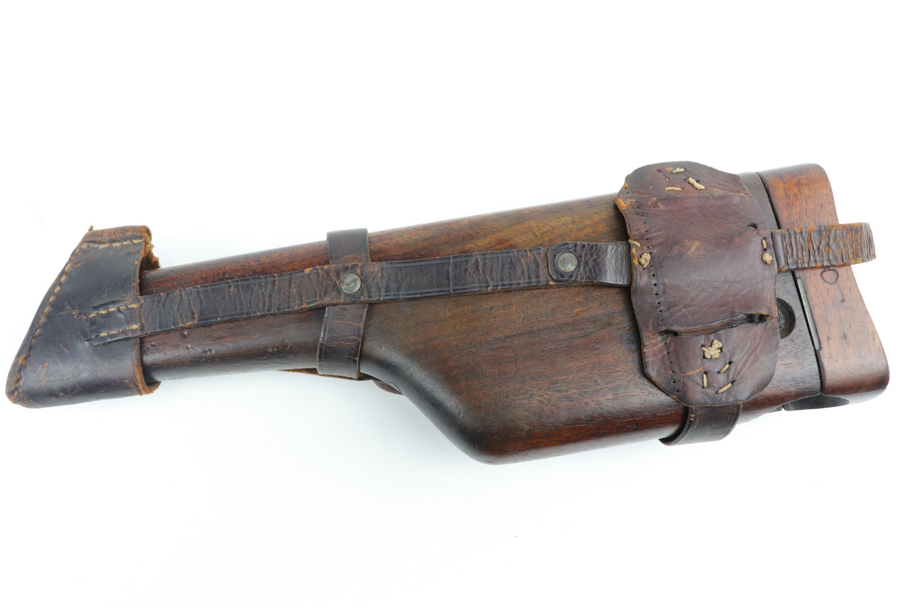 2/8/21 – This is a nice example of an all original ‘Red 9’ Mauser C96 Rig with stock and leather. Unlike its commercial counterparts, “Red 9” Broomhandles were chambered in the more common 9mm Para caliber, which was used by the German Army and were marked with a large 9 on the grips which was then filled with red or orange paint to help German soldiers differentiate its caliber from the standard .30 mauser cartridge. Only about 130,000 of these very collectible guns were made, with only about 100,000 being accepted by the army and issued to the troops. Considered to be a substitute for a light carbine, they became very popular in trench warfare and were used by some of the Germany’s elite crack troops. This one has retained roughly 85% of its bluing. Generally, there is minor wear on the high edges and thinning on the barrel and front edge of the frame. There is some light scratching on the underside of the frame. The grips are excellent and matching to the gun. The gun is all matching. Both the gun and stock are “Germany” export marked. The stock is matching to the gun. The stock has an Imperial proof and several markings that look like spades. It also comes with the original leather harness – the stitching on the back looks like it may have been repaired a long time ago. The rifling in the bore is worn and there is minor pitting throughout.