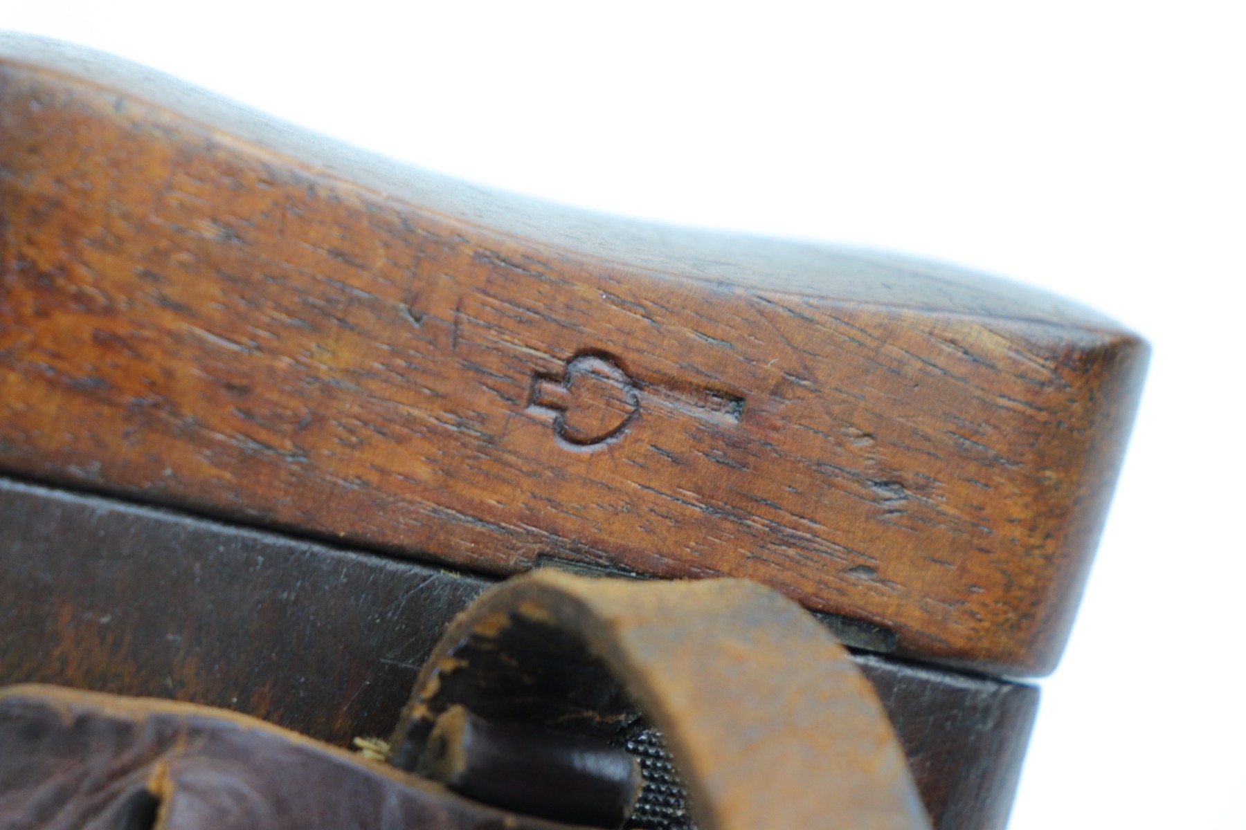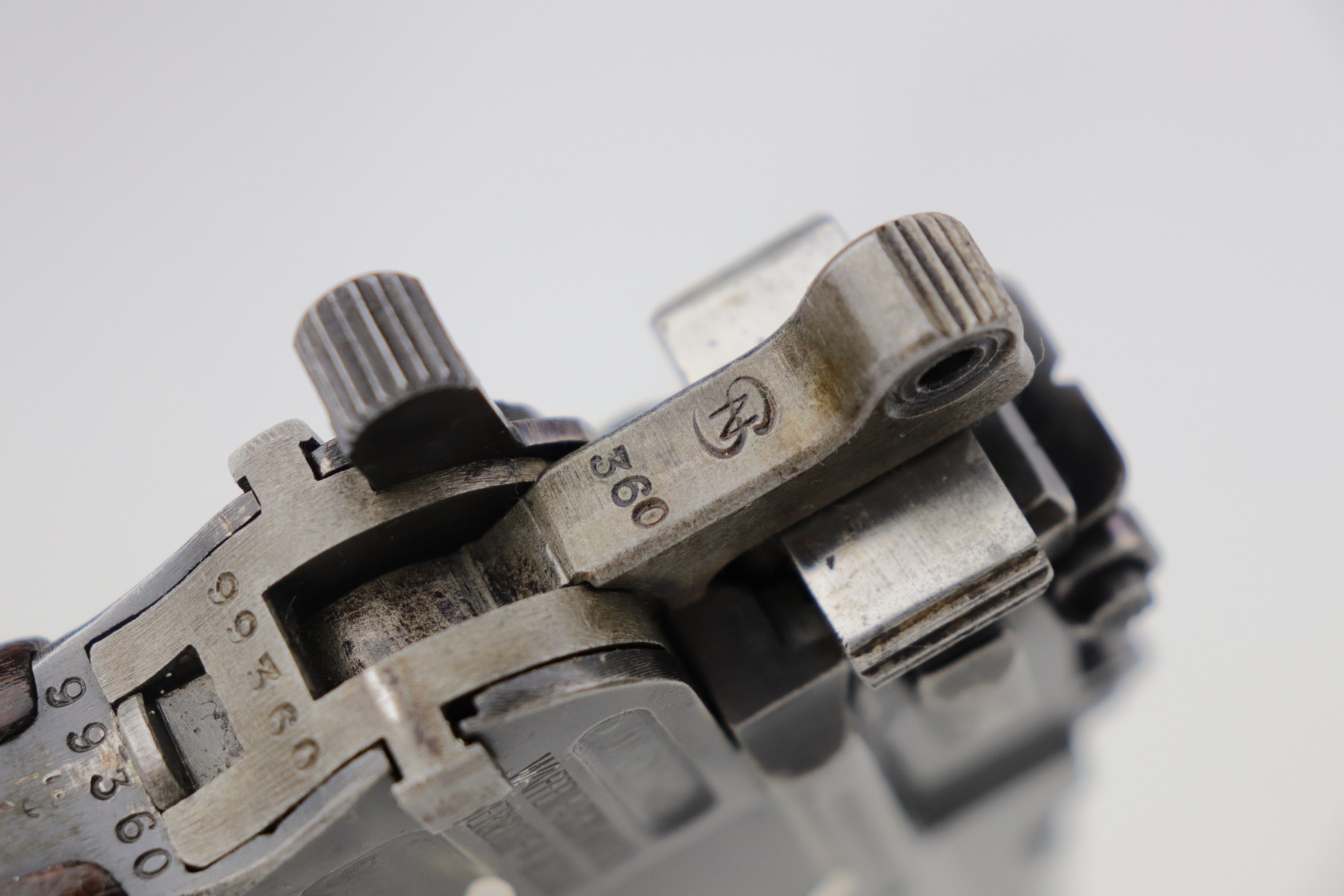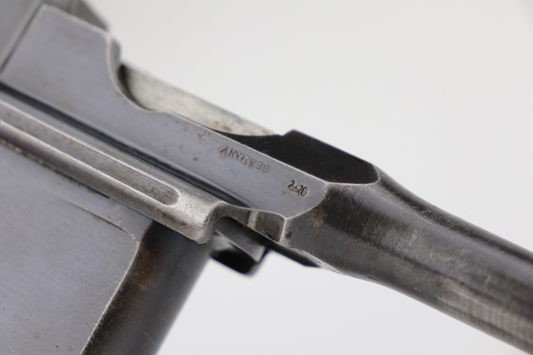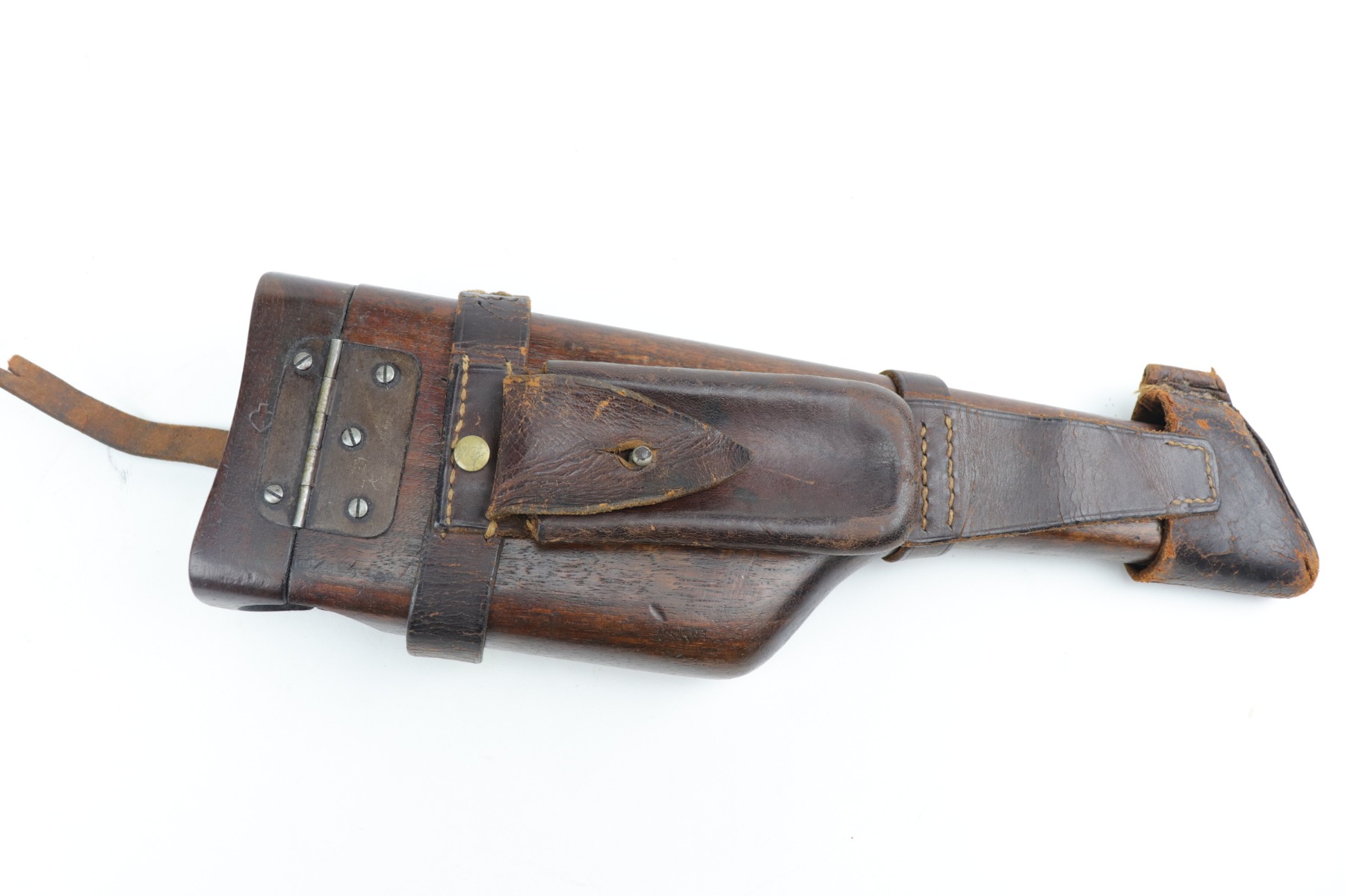 2/8/21 – This is a nice example of an all original ‘Red 9’ Mauser C96 Rig with stock and leather. Unlike its commercial counterparts, “Red 9” Broomhandles were chambered in the more common 9mm Para caliber, which was used by the German Army and were marked with a large 9 on the grips which was then filled with red or orange paint to help German soldiers differentiate its caliber from the standard .30 mauser cartridge. Only about 130,000 of these very collectible guns were made, with only about 100,000 being accepted by the army and issued to the troops. Considered to be a substitute for a light carbine, they became very popular in trench warfare and were used by some of the Germany’s elite crack troops. This one has retained roughly 85% of its bluing. Generally, there is minor wear on the high edges and thinning on the barrel and front edge of the frame. There is some light scratching on the underside of the frame. The grips are excellent and matching to the gun. The gun is all matching. Both the gun and stock are “Germany” export marked. The stock is matching to the gun. The stock has an Imperial proof and several markings that look like spades. It also comes with the original leather harness – the stitching on the back looks like it may have been repaired a long time ago. The rifling in the bore is worn and there is minor pitting throughout.