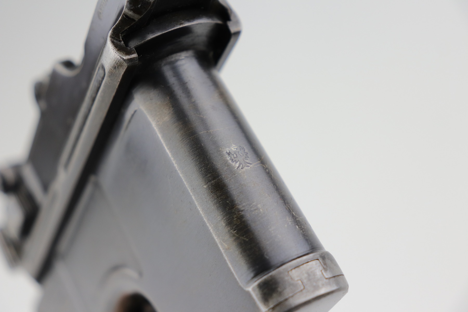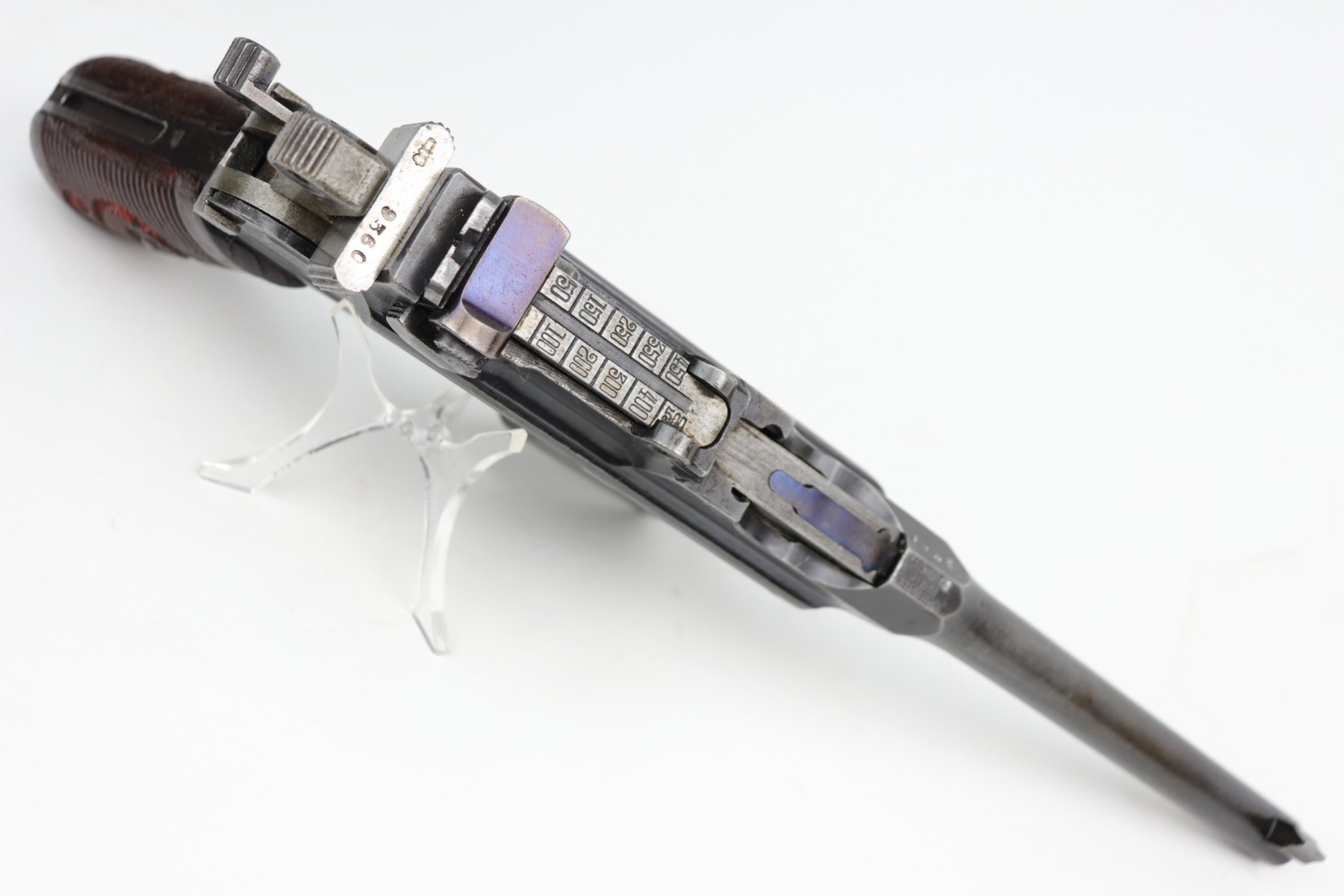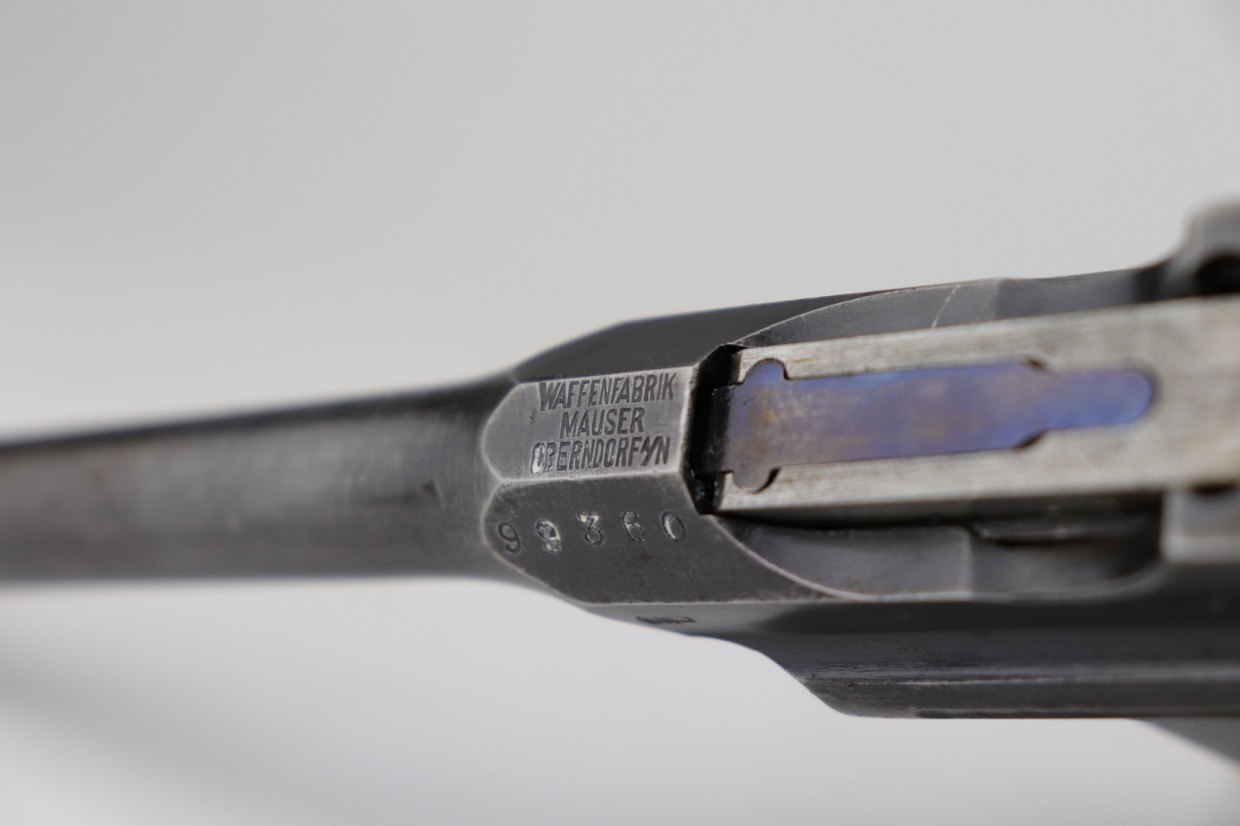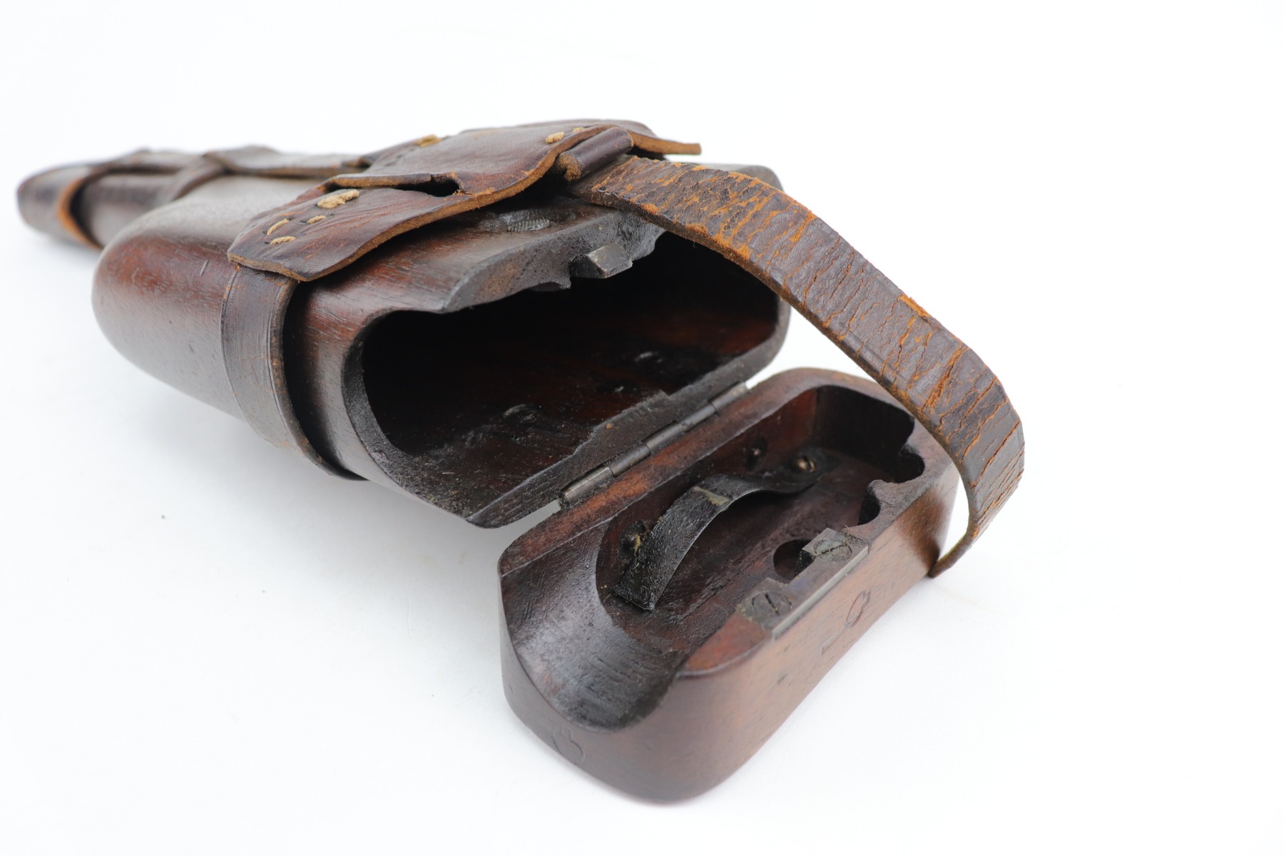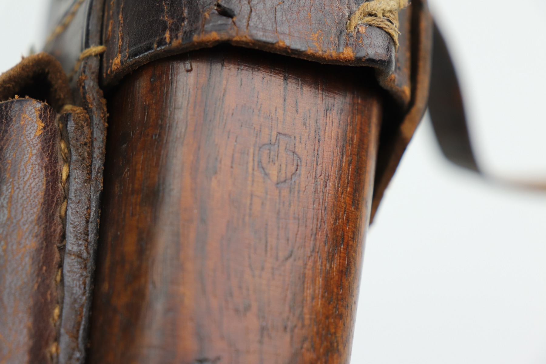 2/8/21 – This is a nice example of an all original ‘Red 9’ Mauser C96 Rig with stock and leather. Unlike its commercial counterparts, “Red 9” Broomhandles were chambered in the more common 9mm Para caliber, which was used by the German Army and were marked with a large 9 on the grips which was then filled with red or orange paint to help German soldiers differentiate its caliber from the standard .30 mauser cartridge. Only about 130,000 of these very collectible guns were made, with only about 100,000 being accepted by the army and issued to the troops. Considered to be a substitute for a light carbine, they became very popular in trench warfare and were used by some of the Germany’s elite crack troops. This one has retained roughly 85% of its bluing. Generally, there is minor wear on the high edges and thinning on the barrel and front edge of the frame. There is some light scratching on the underside of the frame. The grips are excellent and matching to the gun. The gun is all matching. Both the gun and stock are “Germany” export marked. The stock is matching to the gun. The stock has an Imperial proof and several markings that look like spades. It also comes with the original leather harness – the stitching on the back looks like it may have been repaired a long time ago. The rifling in the bore is worn and there is minor pitting throughout.