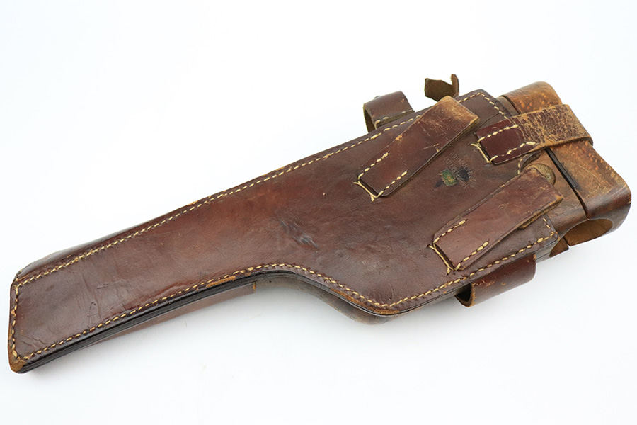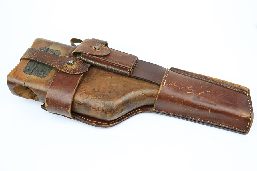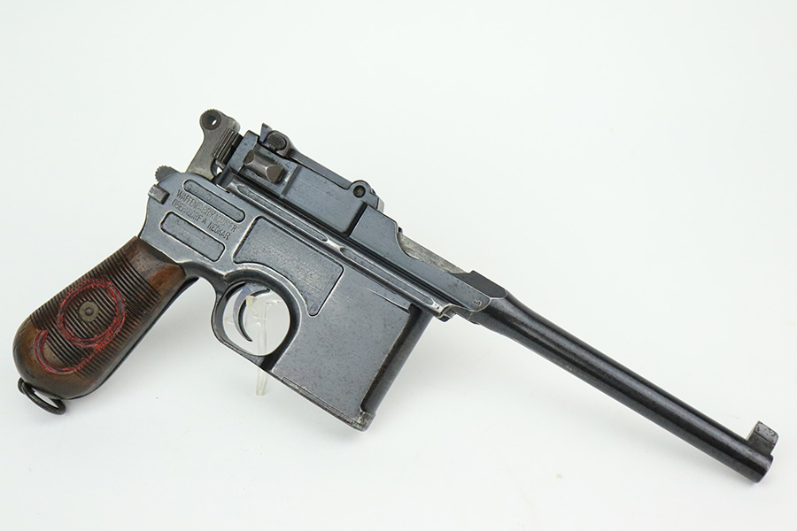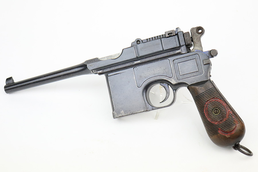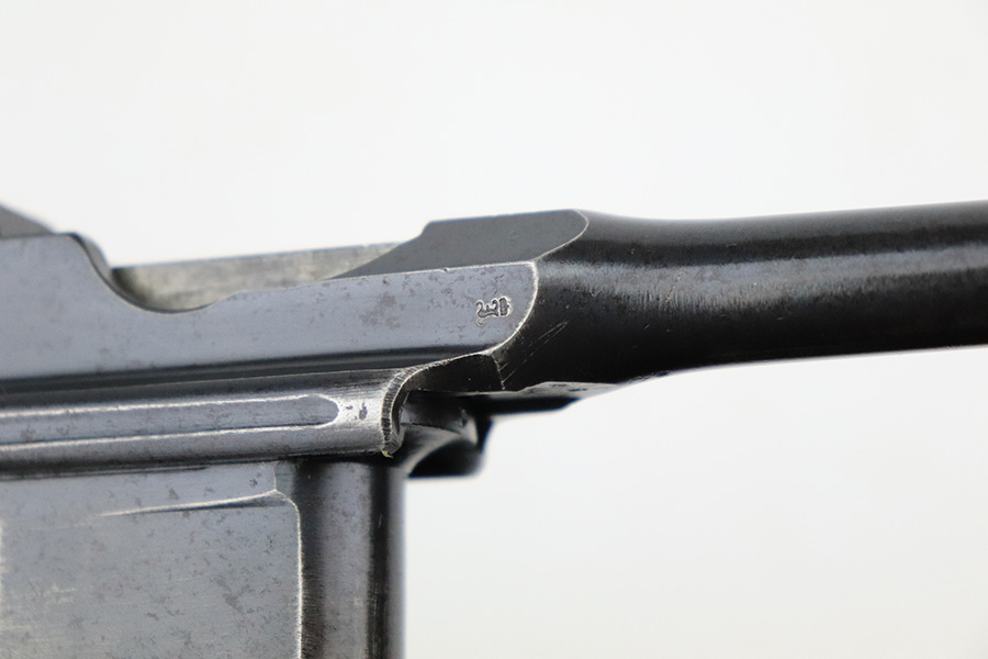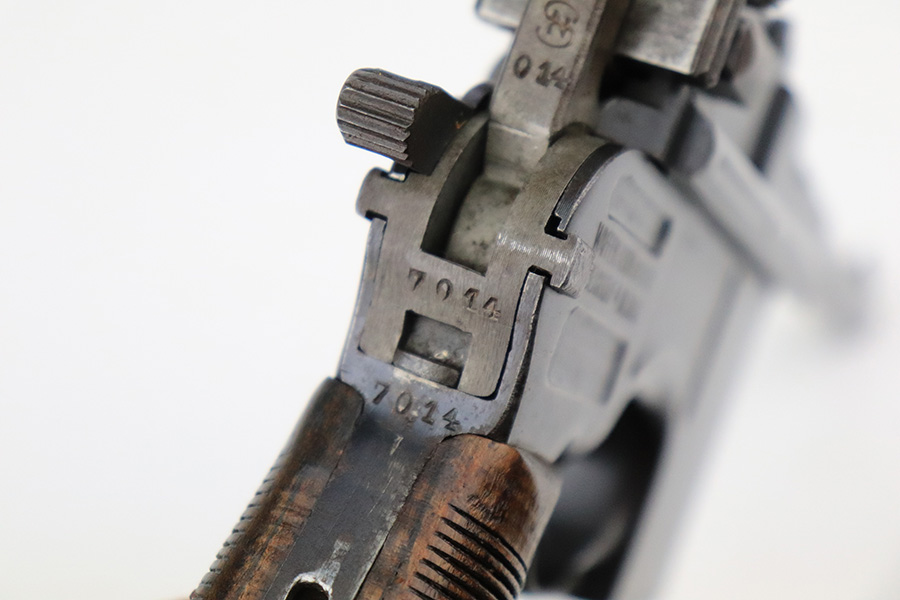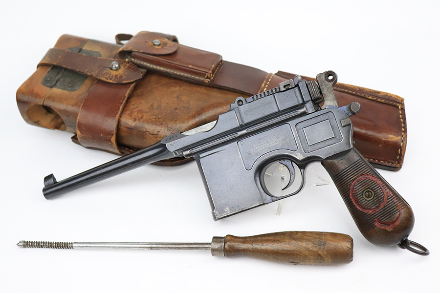7/19/22 – This is a complete Mauser C96 Broomhandle “Red 9” pistol rig from 1916, including harness, cleaning rod and matching numbered stock. Unlike its commercial counterparts, “red 9” broomhandles were chambered in more common 9mm Para caliber, which was used by the german army and were marked with a large 9 on the grips which was then filled with red or orange paint to help German soldiers differentiate its caliber from the standard .30 mauser cartridge. Only about 130,000 of these very collectible guns were made, with only about 100,000 being accepted by the army and issued to the troops. Considered to be a substitute for a light carbine, they became very popular in trench warfare and were used by some of the Germany’s elite crack troops. This particular example is fairly early, one of the first ~7,000 issued/produced. It has matching numbers throughout, including the original grips. The bluing shows high edge wear but there isn’t a ton of finish loss overall. There is scattered oxidation on most of the pistol though. The bore has strong rifling but some freckling in the grooves. The original stock is included and matches the serial of the pistol. It has a fairly crisp imperial proof, as well. There is a repaired crack along one edge, and the stock was lightly sanded during the repair. The harness is maker marked by Hohmann & Sohn. It’s in fairly good condition, though the closure strap for the cleaning rod has torn. It also appears the date on the back was cut out but we have on guess as to why. Otherwise, the loops and straps show cracking but the leather is in fairly good shape beyond that. Comes with an original cleaning rod.