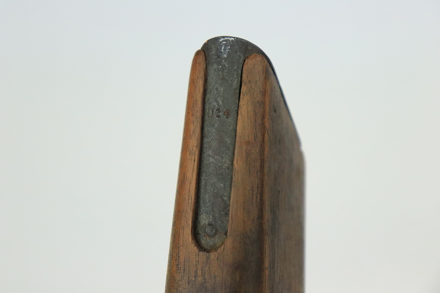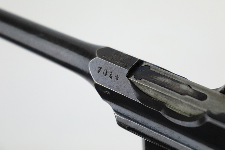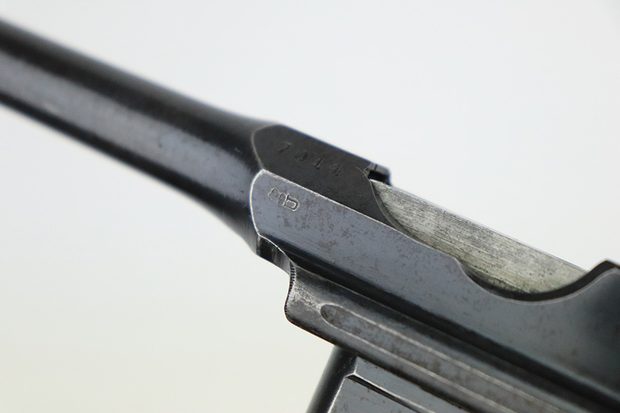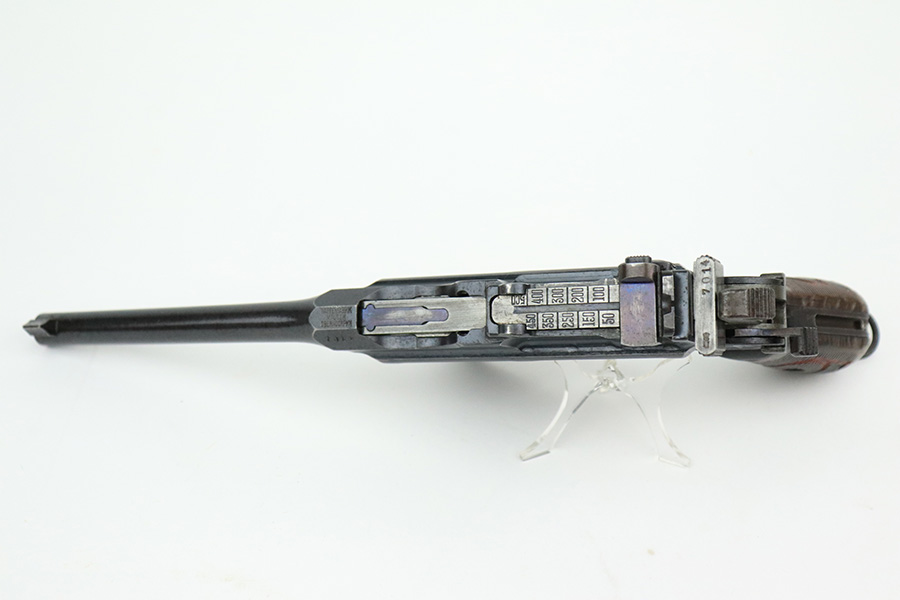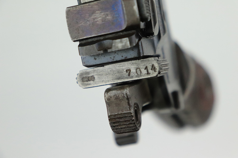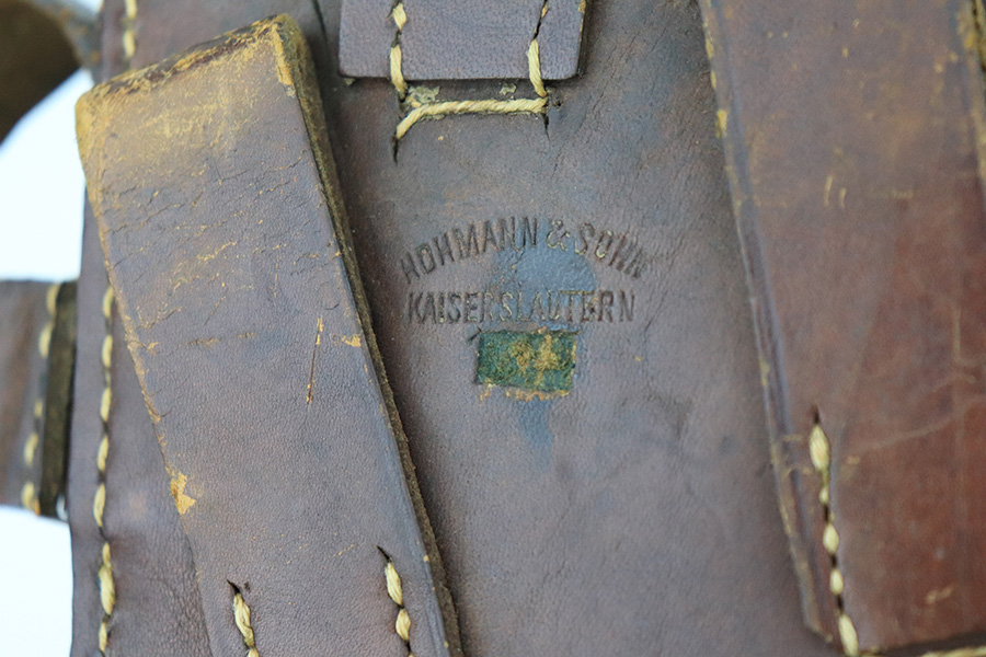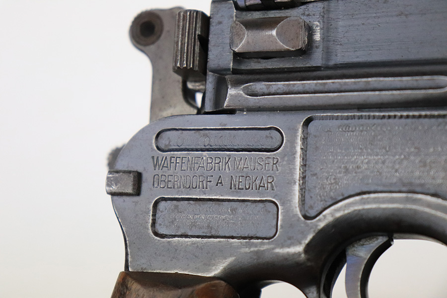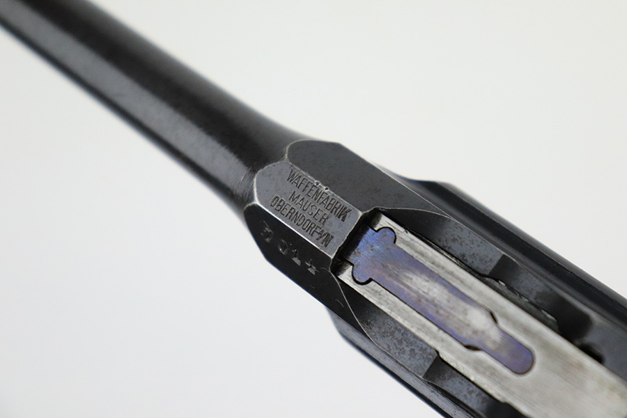 7/19/22 – This is a complete Mauser C96 Broomhandle “Red 9” pistol rig from 1916, including harness, cleaning rod and matching numbered stock. Unlike its commercial counterparts, “red 9” broomhandles were chambered in more common 9mm Para caliber, which was used by the german army and were marked with a large 9 on the grips which was then filled with red or orange paint to help German soldiers differentiate its caliber from the standard .30 mauser cartridge. Only about 130,000 of these very collectible guns were made, with only about 100,000 being accepted by the army and issued to the troops. Considered to be a substitute for a light carbine, they became very popular in trench warfare and were used by some of the Germany’s elite crack troops. This particular example is fairly early, one of the first ~7,000 issued/produced. It has matching numbers throughout, including the original grips. The bluing shows high edge wear but there isn’t a ton of finish loss overall. There is scattered oxidation on most of the pistol though. The bore has strong rifling but some freckling in the grooves. The original stock is included and matches the serial of the pistol. It has a fairly crisp imperial proof, as well. There is a repaired crack along one edge, and the stock was lightly sanded during the repair. The harness is maker marked by Hohmann & Sohn. It’s in fairly good condition, though the closure strap for the cleaning rod has torn. It also appears the date on the back was cut out but we have on guess as to why. Otherwise, the loops and straps show cracking but the leather is in fairly good shape beyond that. Comes with an original cleaning rod.