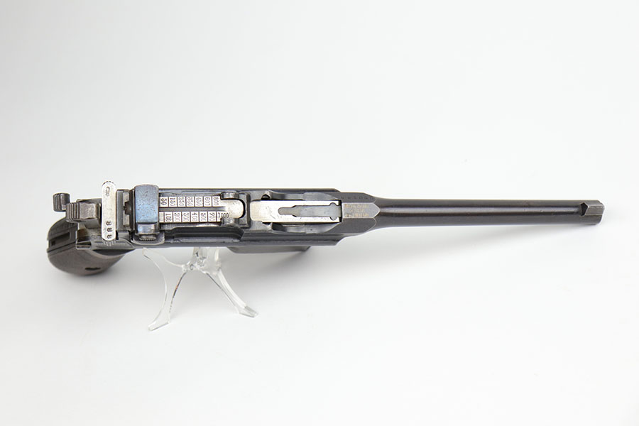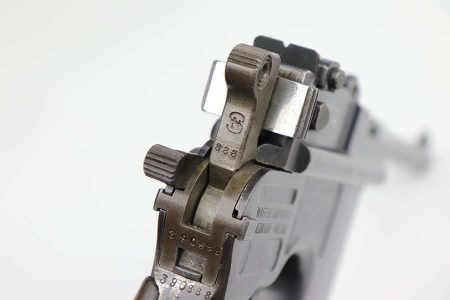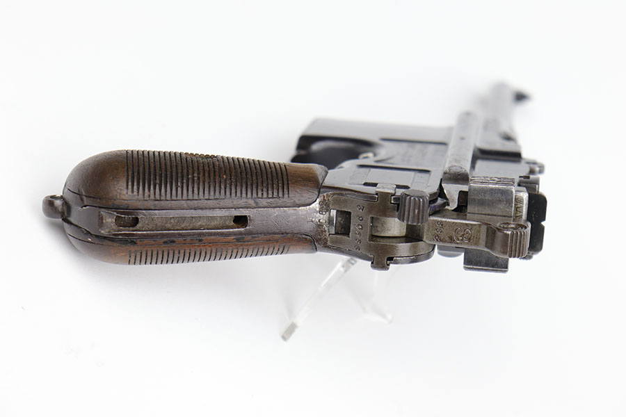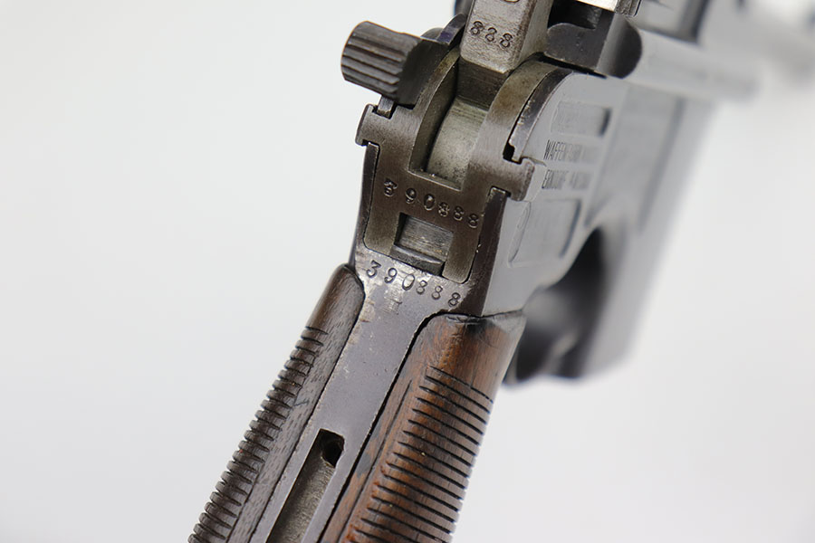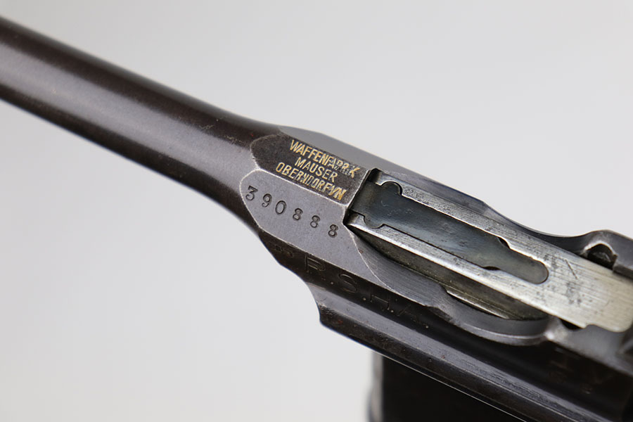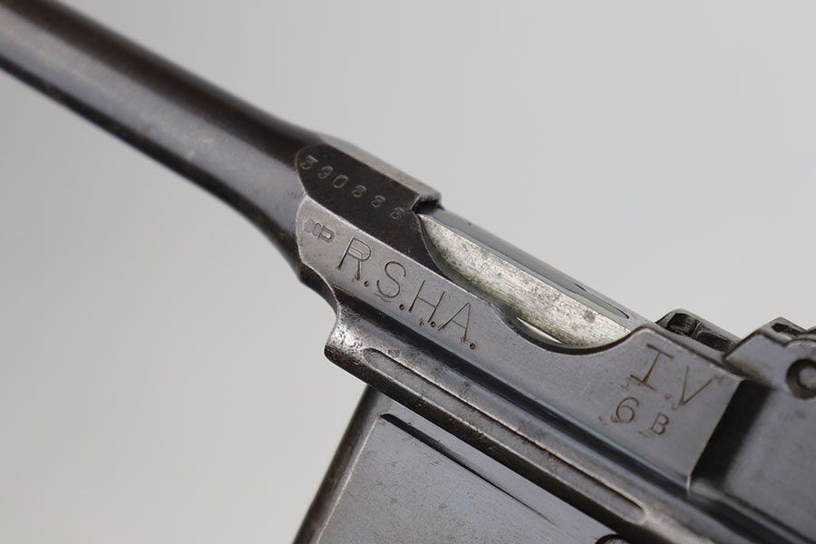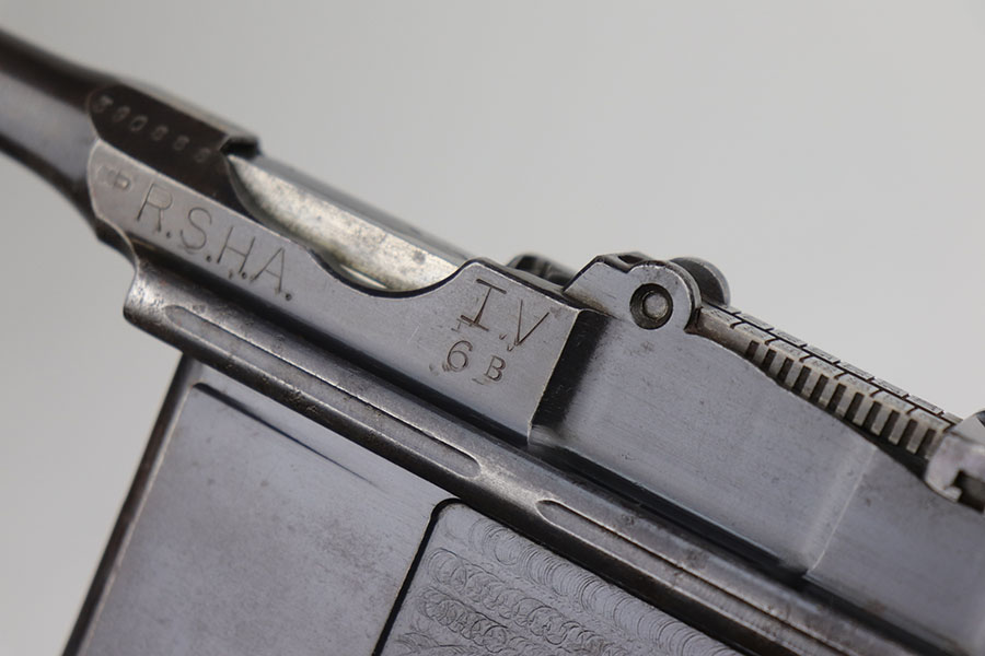 11/11/20 – This is a very interesting wartime commercial Mauser C96 with RSHA marking on receiver. The receiver is marked R.S.H.A next to ‘I.V. 6 B’. This would appear to indicate it went to a Gestapo division at the Reich Main Security Office. The ‘6B’ seems to indicate where it went within the division but we aren’t sure the specific meaning. The pistol is all matching and original, including the grips. The finish shows some patina on the barrel and magazine well, and some bluing loss on the rails and underside of the barrel. Bore is minty, hardly appears used. The grips have no cracks or chips. Some small parts still have excellent fire blue, also.