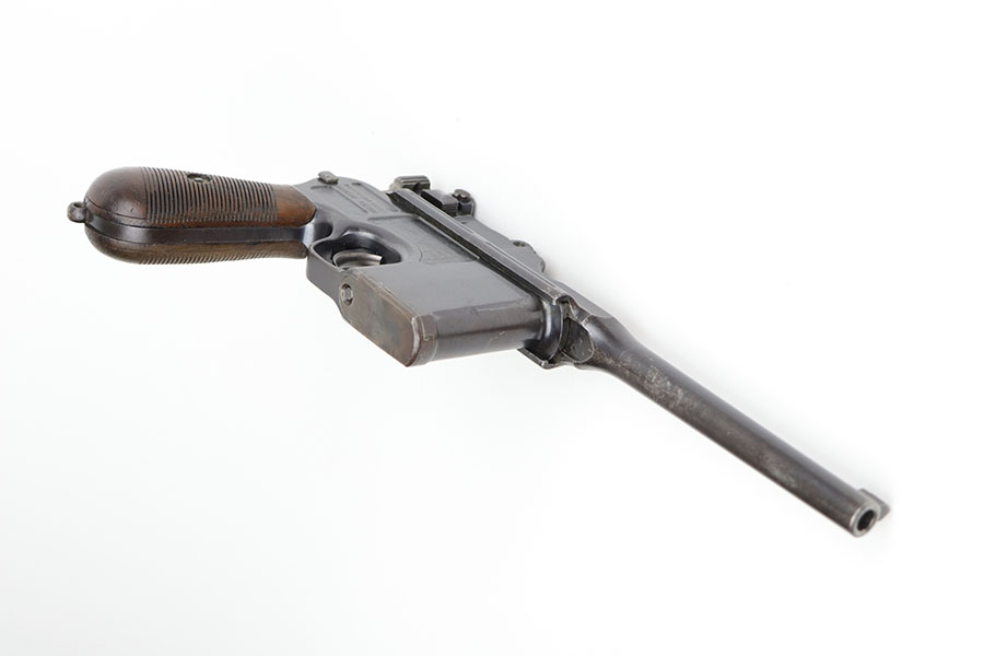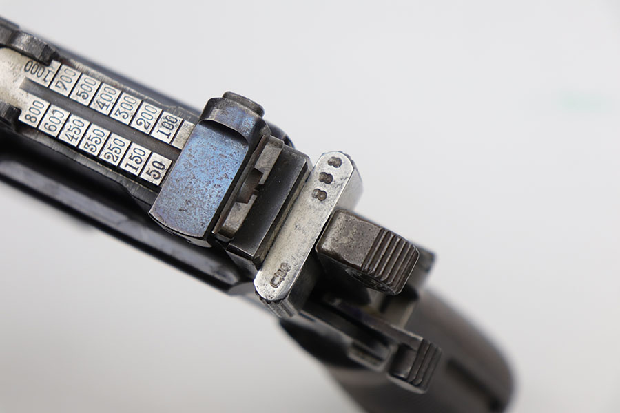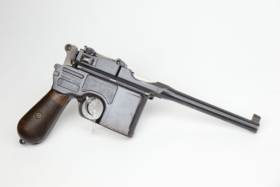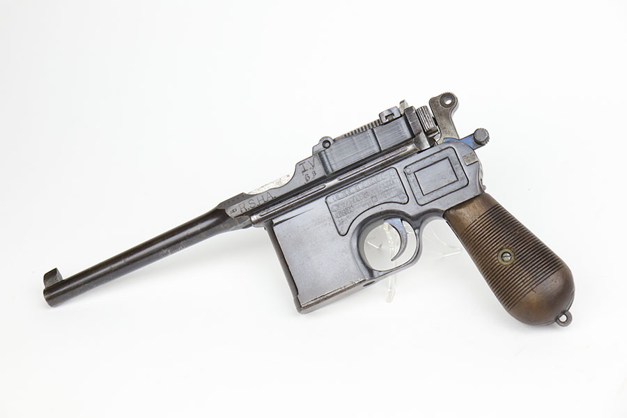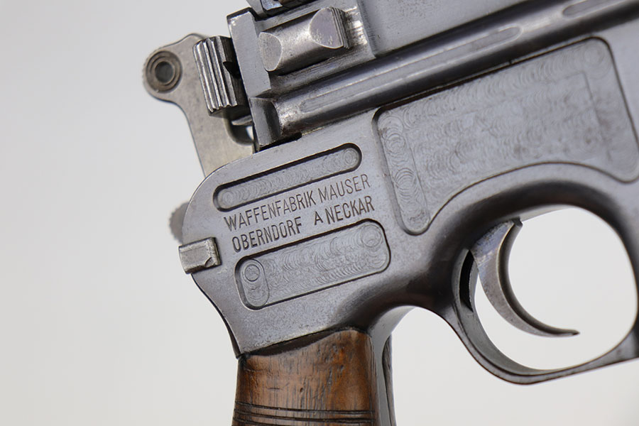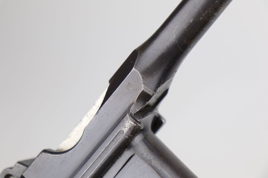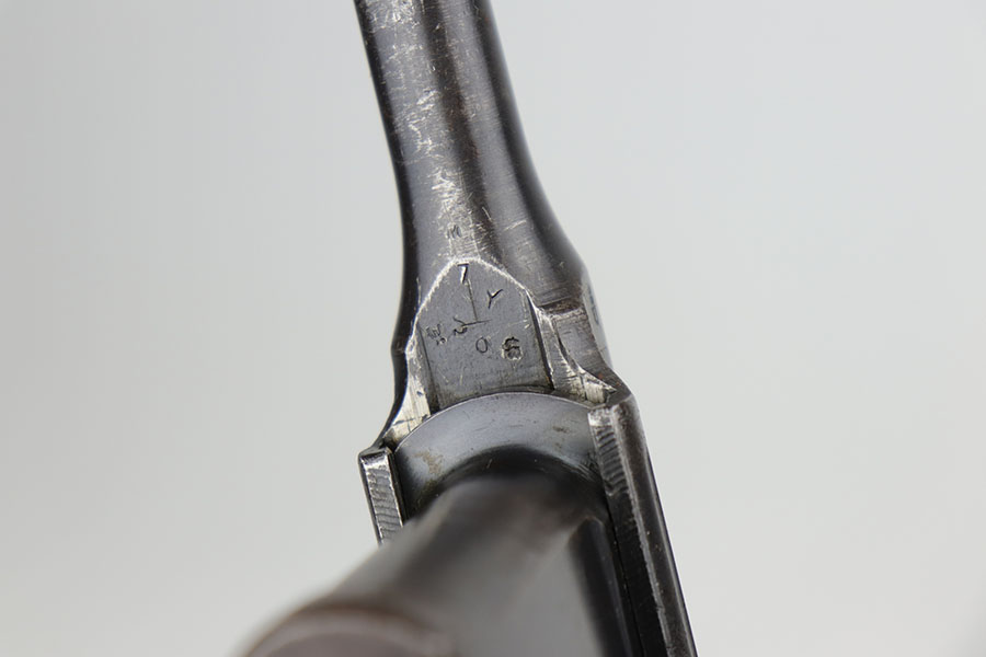 11/11/20 – This is a very interesting wartime commercial Mauser C96 with RSHA marking on receiver. The receiver is marked R.S.H.A next to ‘I.V. 6 B’. This would appear to indicate it went to a Gestapo division at the Reich Main Security Office. The ‘6B’ seems to indicate where it went within the division but we aren’t sure the specific meaning. The pistol is all matching and original, including the grips. The finish shows some patina on the barrel and magazine well, and some bluing loss on the rails and underside of the barrel. Bore is minty, hardly appears used. The grips have no cracks or chips. Some small parts still have excellent fire blue, also.