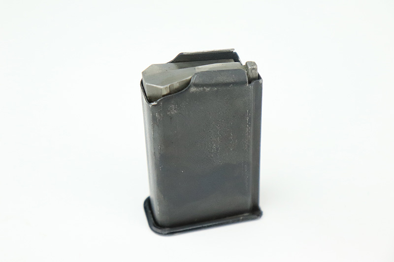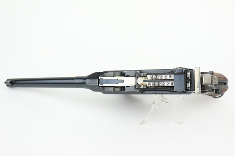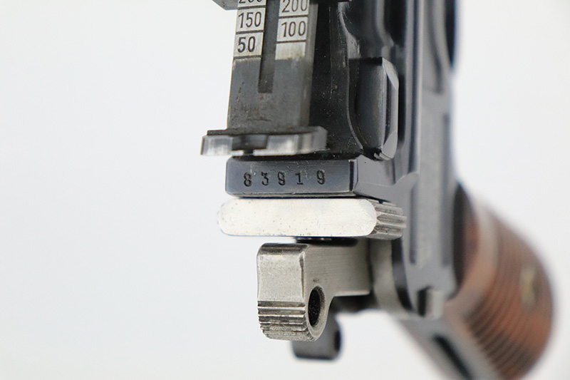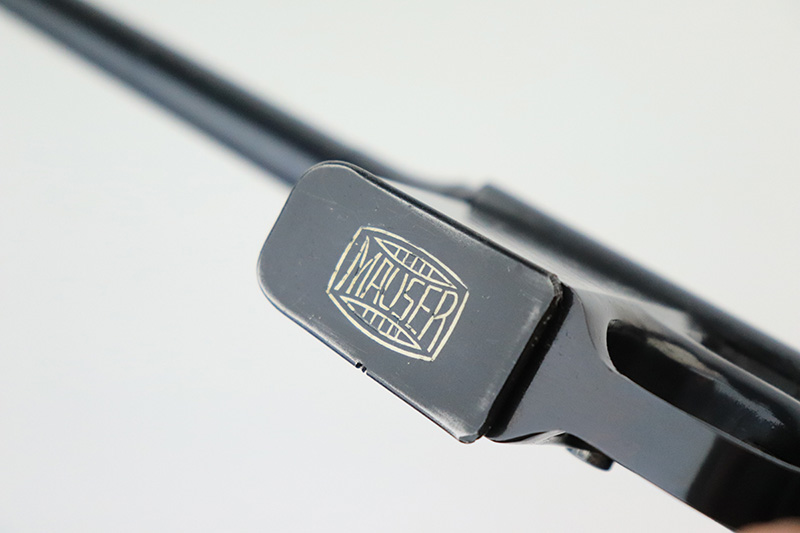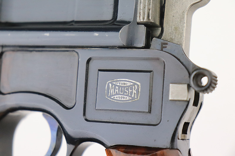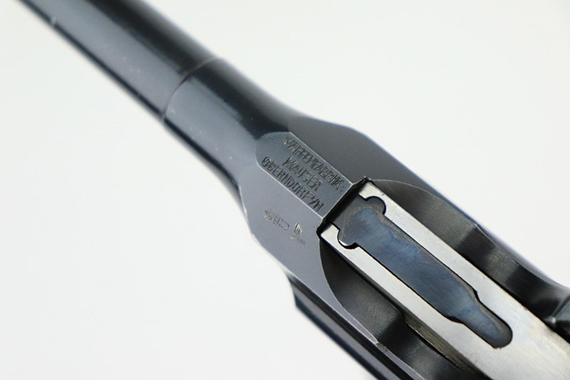 1/11/23 – This is a rare Mauser C96 – “Semi-Auto” Nazi Contract M712 Schnellfeuer. It’s a semi-Auto M712 Schnellfeuer rebuilt from original Nazi-contract parts kit. The Schnellfeuer barrel-extension, and internals retain their original finish and are matched. The left chamber flat on the barrel extention has Nazi acceptance mark beneath the Mauser Crown/U proof marks, indicating issue to the German military in WW2. The frame is a Mauser M1930 C96 frame that has had the Schnellfeuer’s detachable magazine well expertly affixed to it (tig-welded, machined, blued). The result is a semi-auto Schnellfeuer that shoots flawlessly and is legal to own at a third of the price of an original Nazi-Contract M712 and without the ATF transfer paperwork and fees. The bluing is excellent throughout with just a little wear on barrel and high edges from being in the stock. Bore is shiny with strong rifling but just a bit of freckling in the grooves.