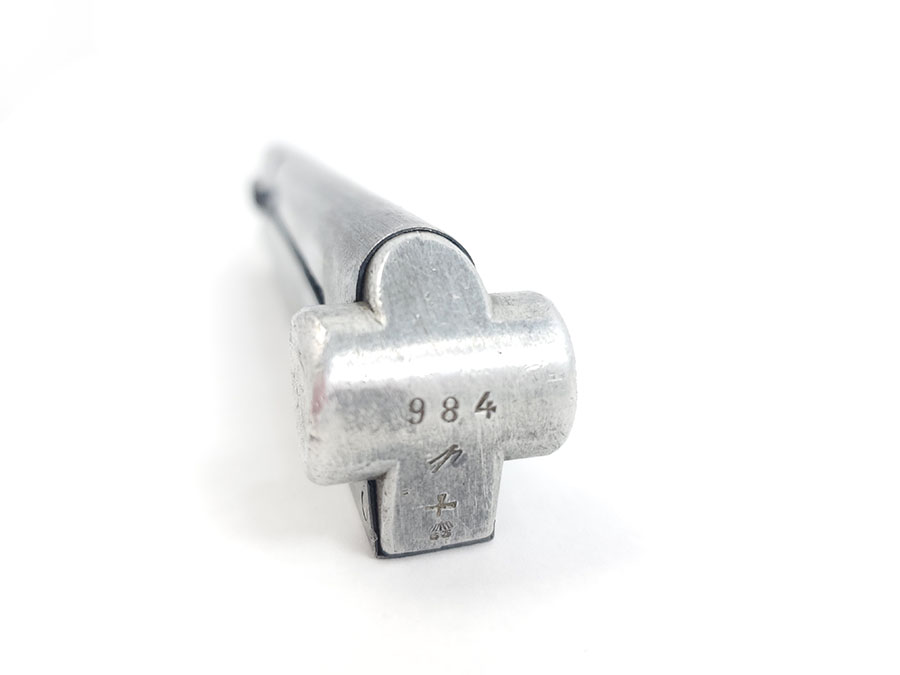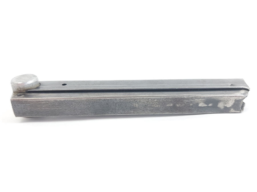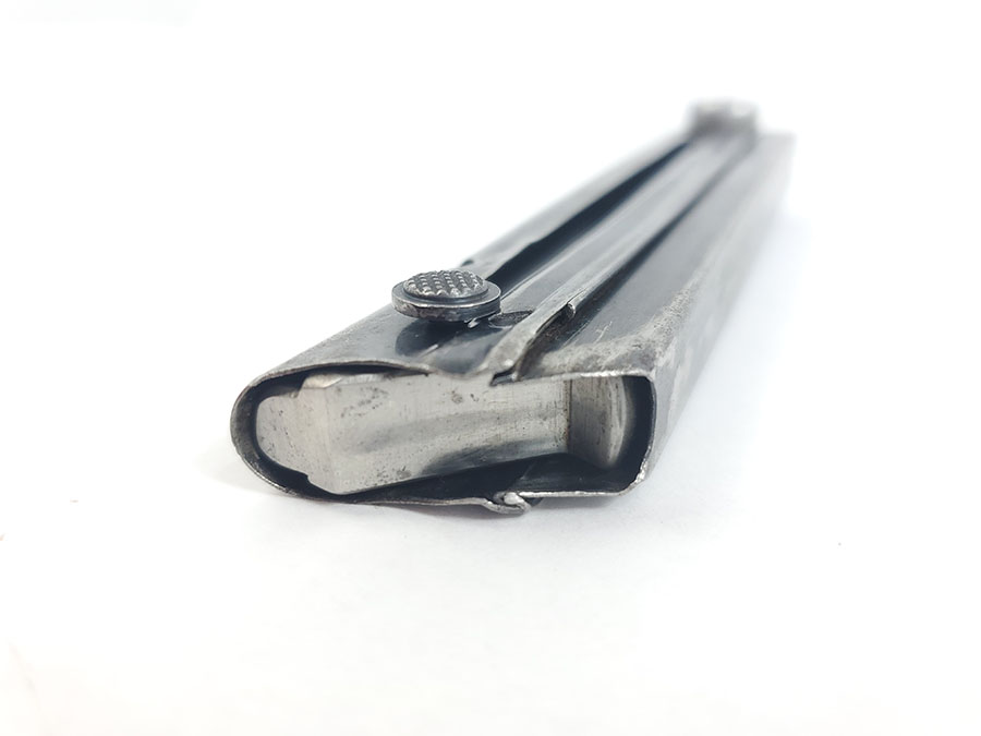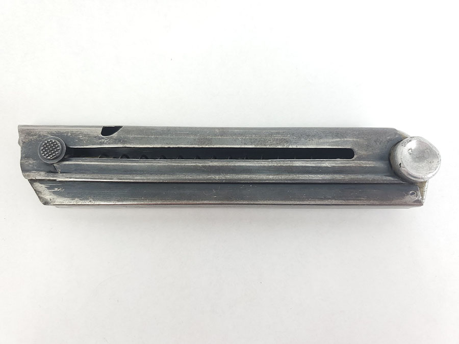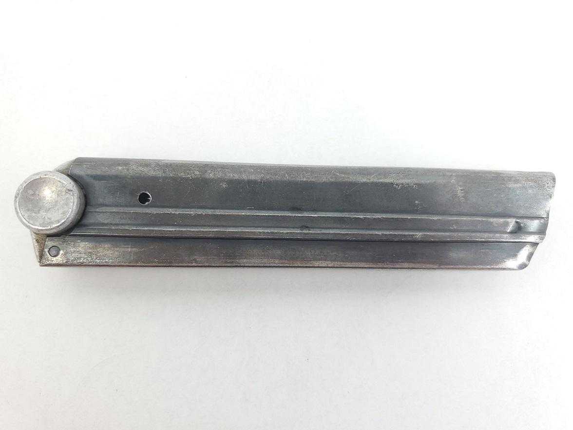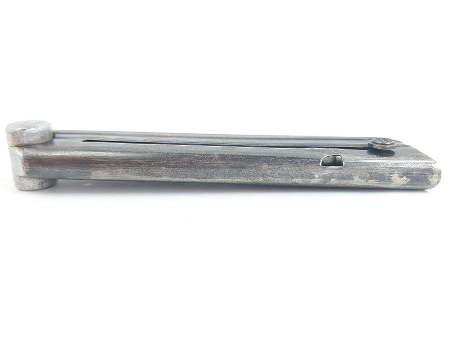6/5/20 – This is an original Mauser Luger magazine for a 1937 1st variation Luger. This is due to the blued frame and droop winged eagle/63 base. This is a “transitional” variation, as most droop 63 magazines do not have a blued frame. The base is in great condition, but the frame has some light bluing loss throughout, as shown. The spring is strong and fully functional.