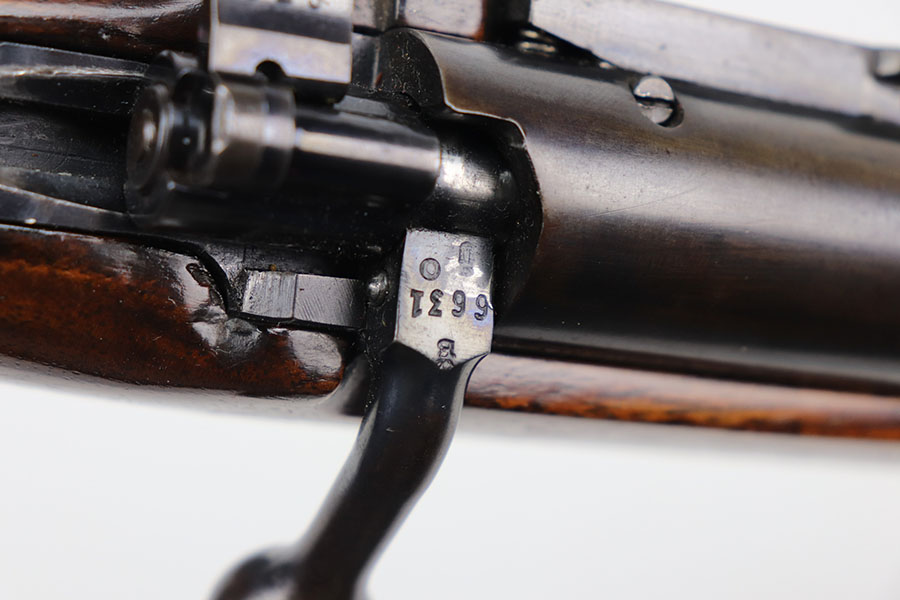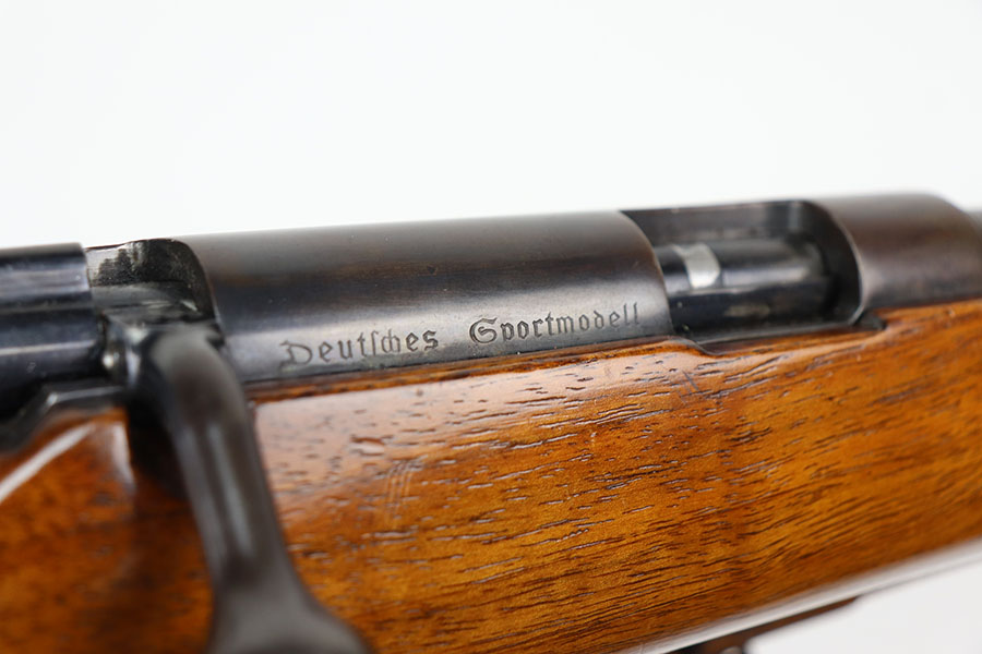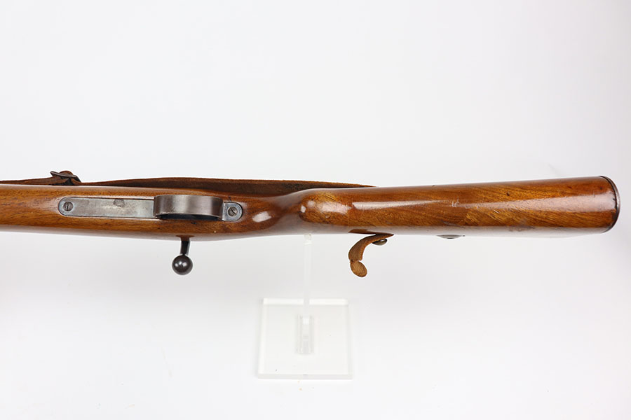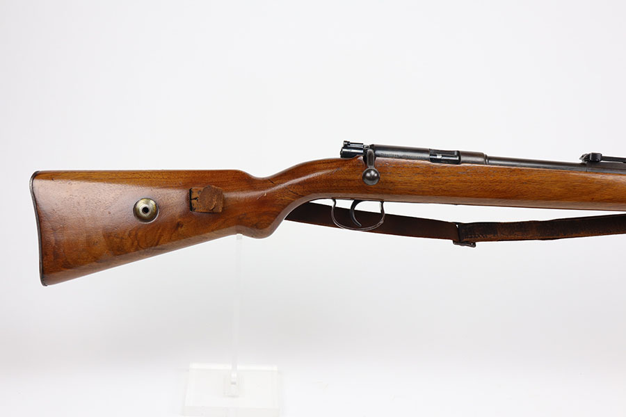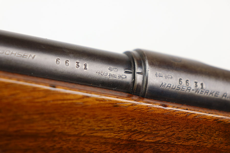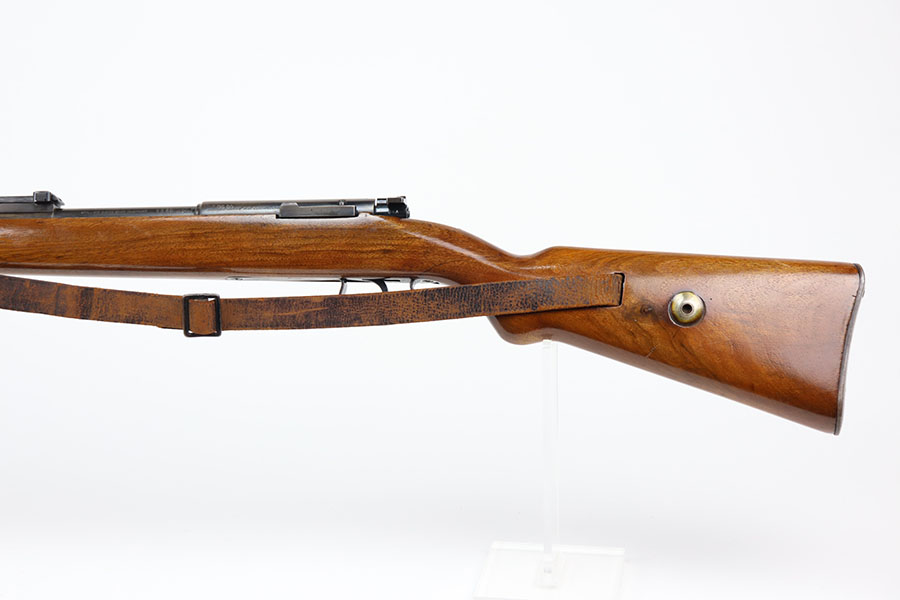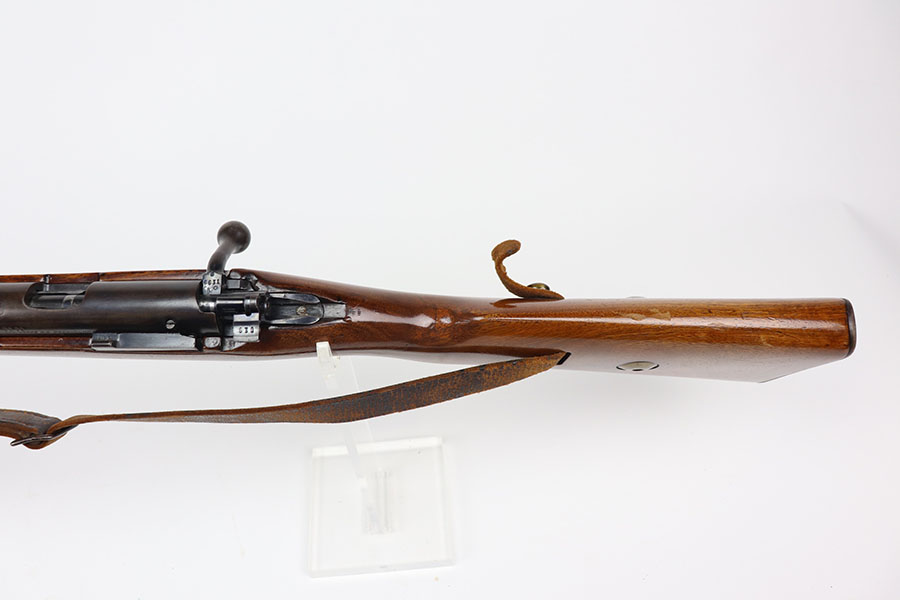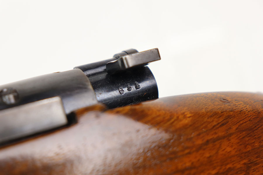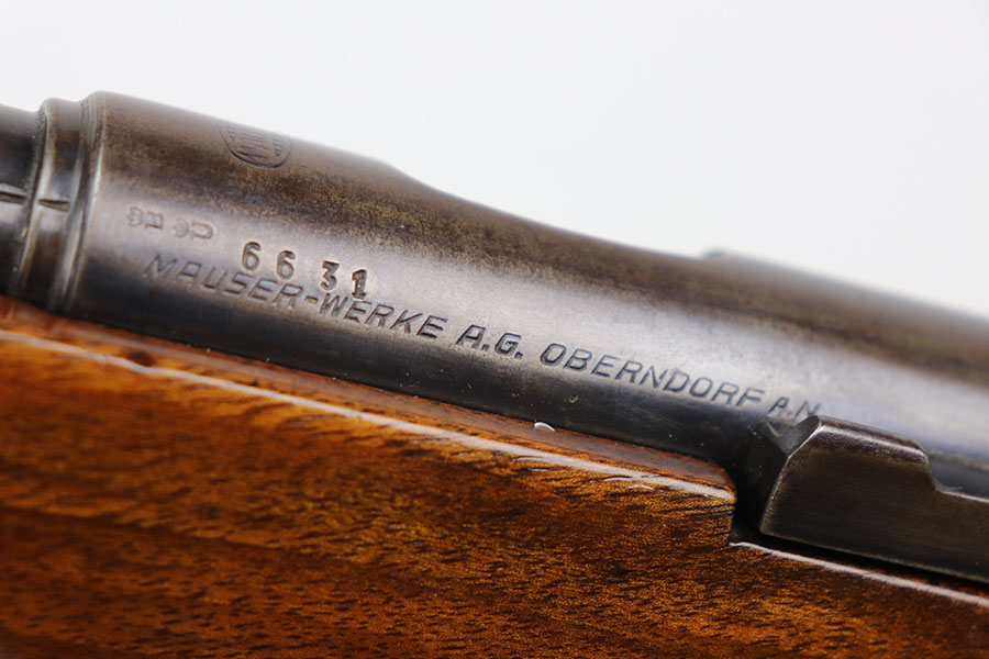 2/11/21 – This is a fairly uncommon Mauser DSM (Deutsches Sportmodell) training rifle. All matching and original rifle. Most of the bluing loss is on the trigger group, and receiver has some patina. Bore is minty in terms of rifling and brightness but there is a tiny ring near the muzzle that may be a slight bulge. The stock would be rated as excellent but it broke in transit to us and we had it professionally repaired, which can be seen around the wrist. Includes cleaning rod and sling.