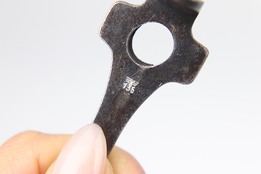 2/1/23 – This is a fairly scarce Mauser Luger tool from WW2, stamped with an eagle 135 military proof on the front metal. These tools are desirable as they were often issued with Black Widow Lugers towards the end of Luger production. The tool has a strong, crisp stamp and no other markings. There’s some dark surface patina and finish loss but no major issues. Great overall condition.