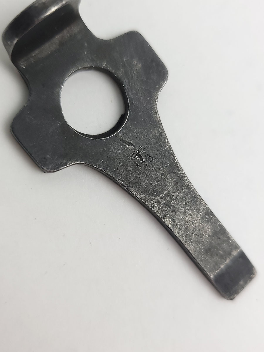 12/7/20 – This is an original Mauser luger tool with a scarce, desirable eagle/135 proof stamp. The proof stamp is faint on the front center of the tool, but is still somewhat visible – see photos. The tool is in great shape otherwise with no major wear, rust, or pitting.