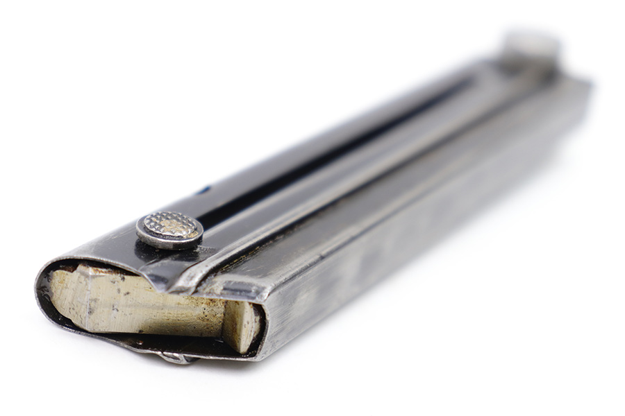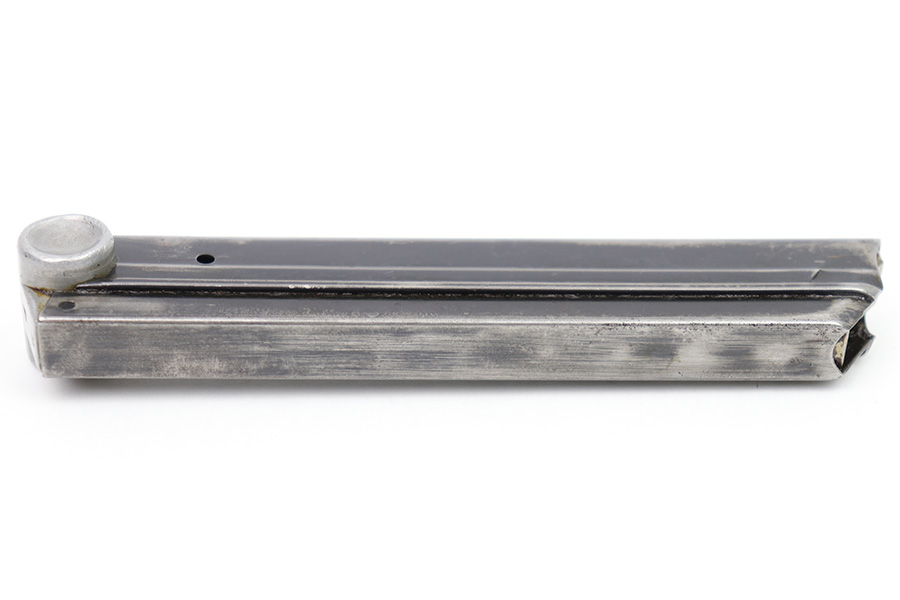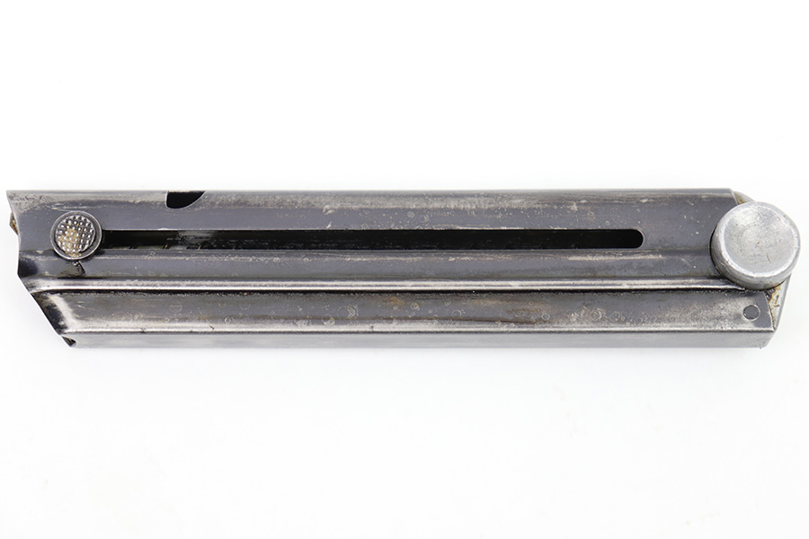 1/30/23 – This is an original WW2 production Mauser Luger magazine. The magazine has a blued tube and aluminum base. The base is serial numbered 3265h with a small eagle 63 military proof stamp. The tube has no markings or stamps but is in great overall condition with most of the original finish intact. There’s mild finish loss and thinning, mostly along the spine of the magazine. The spring is strong and fully functional.