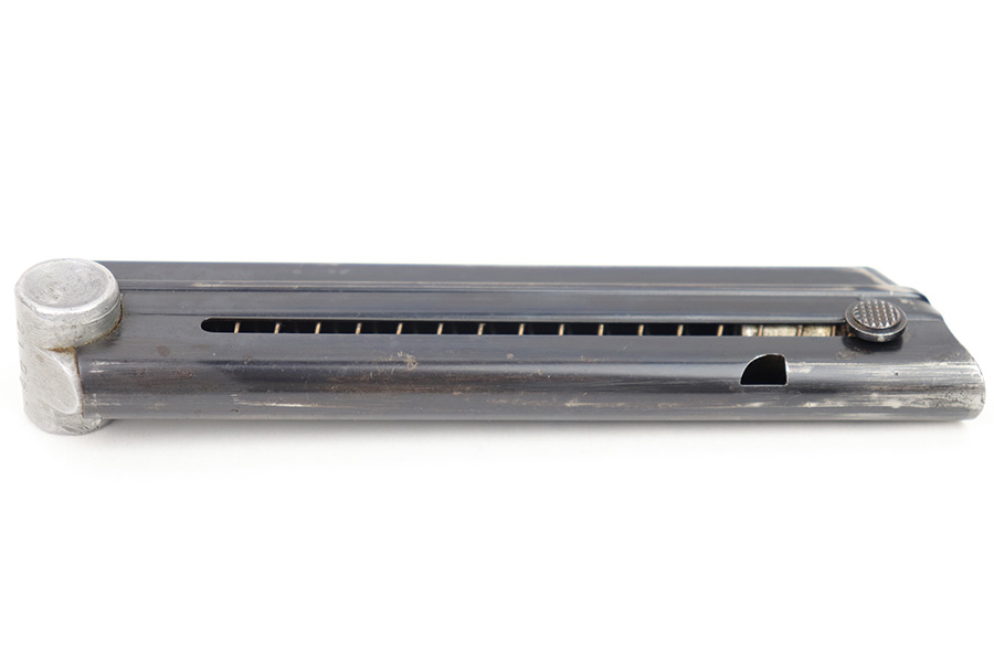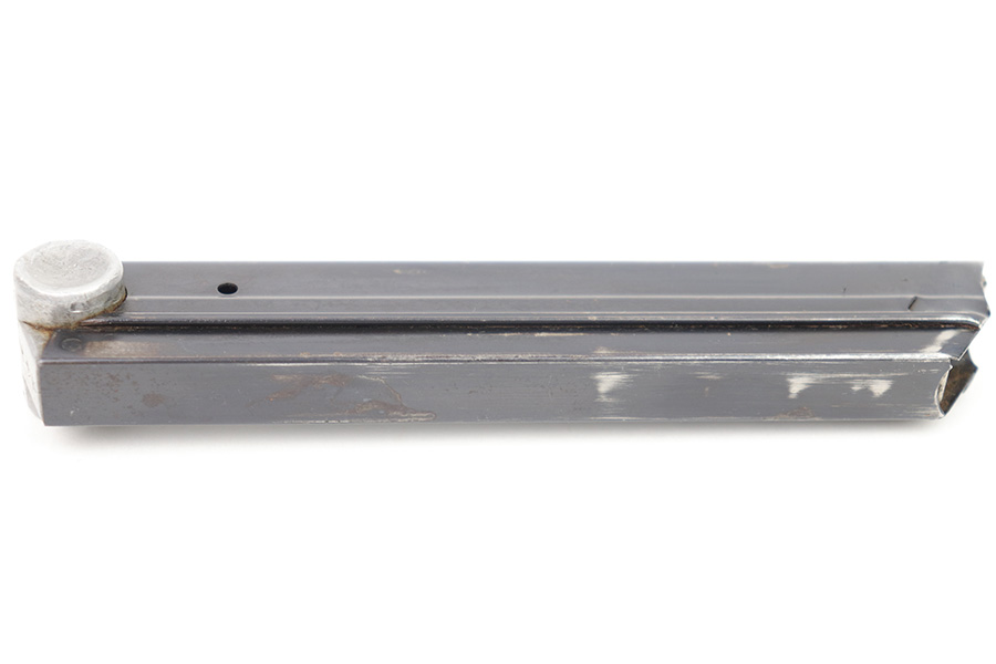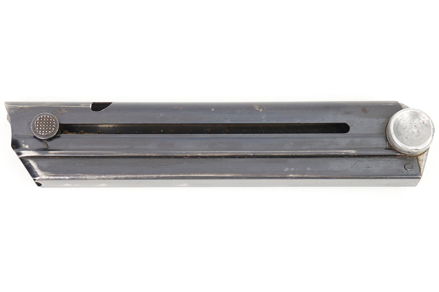 3/8/23 – This is an original Mauser Luger magazine from WW2. The blued tube is in great condition with some mild finish loss and surface patina. The aluminum base is serial numbered 2106 with a letter suffix, plus sign, and eagle 63 military proof stamp. The spring is strong and fully functional.