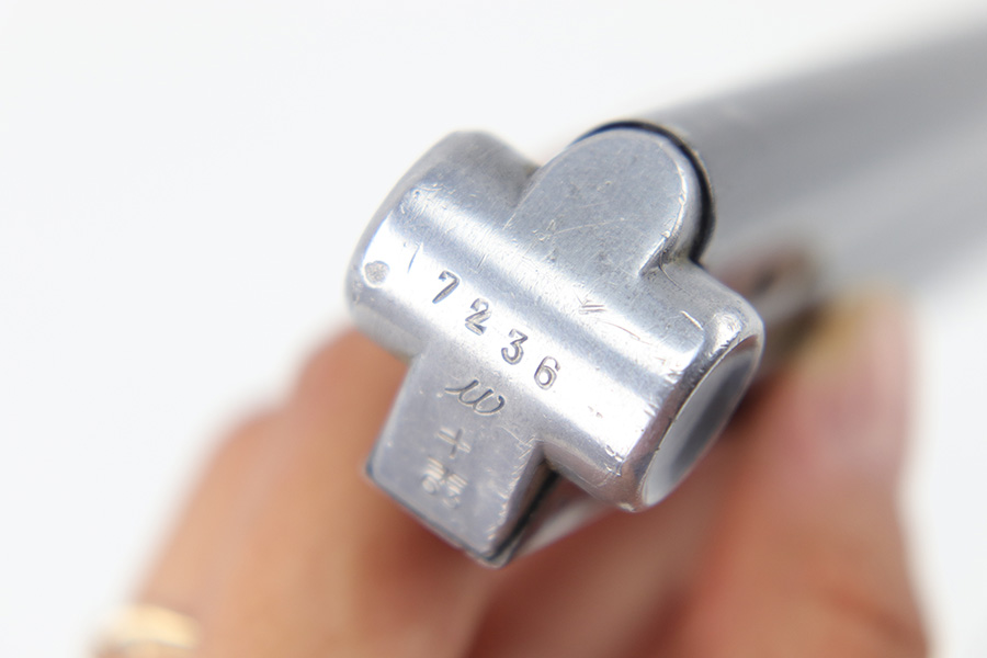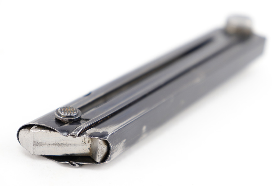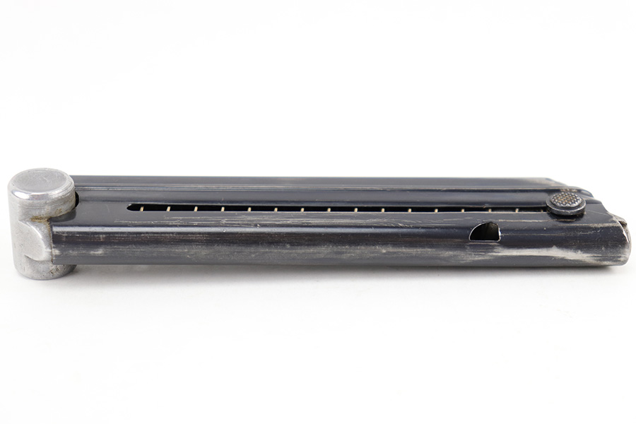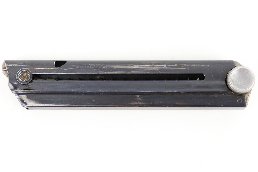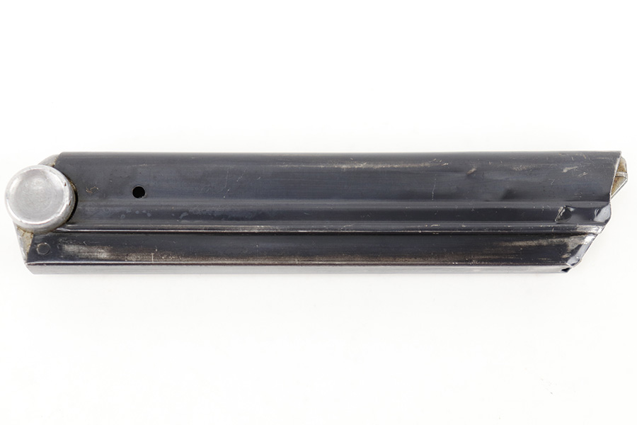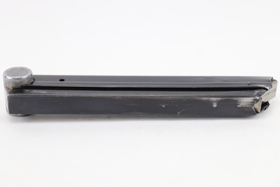 7/5/23 – This is an original WW2 production Mauser Luger magazine. The magazine has a blued tube with some mild finish loss and thinning throughout but no rust or pitting. The aluminum base is serial numbered 7236w with a “+” sign and eagle 63 military proof stamp. The spring is strong and fully functional.