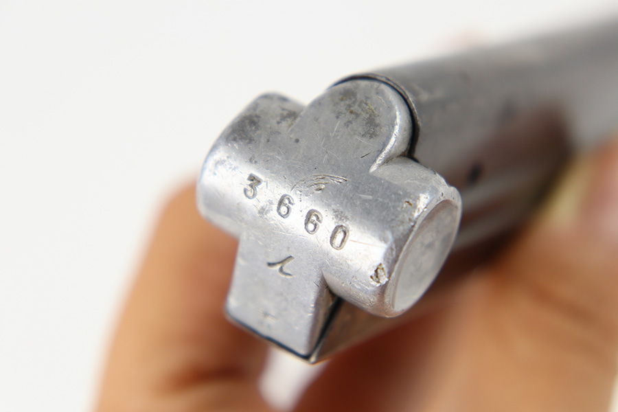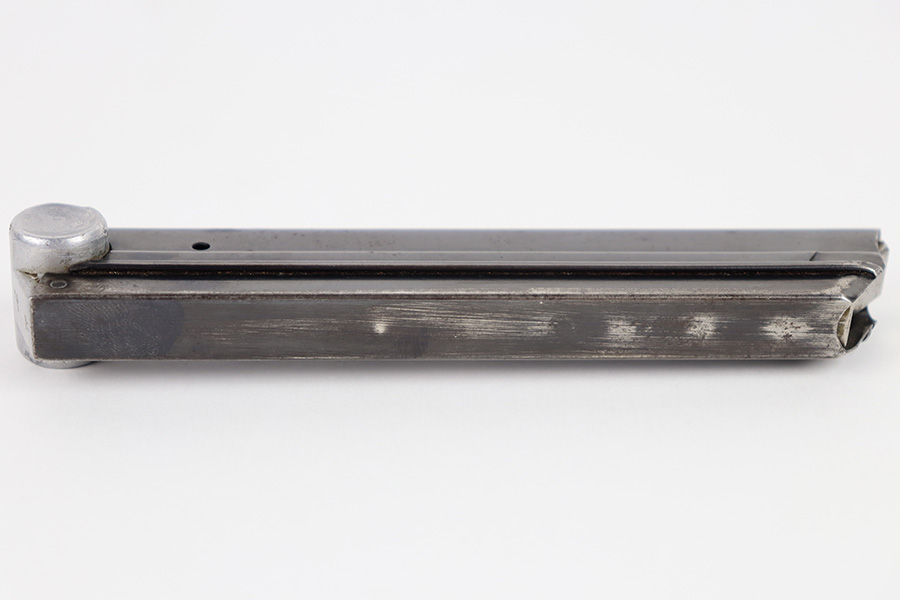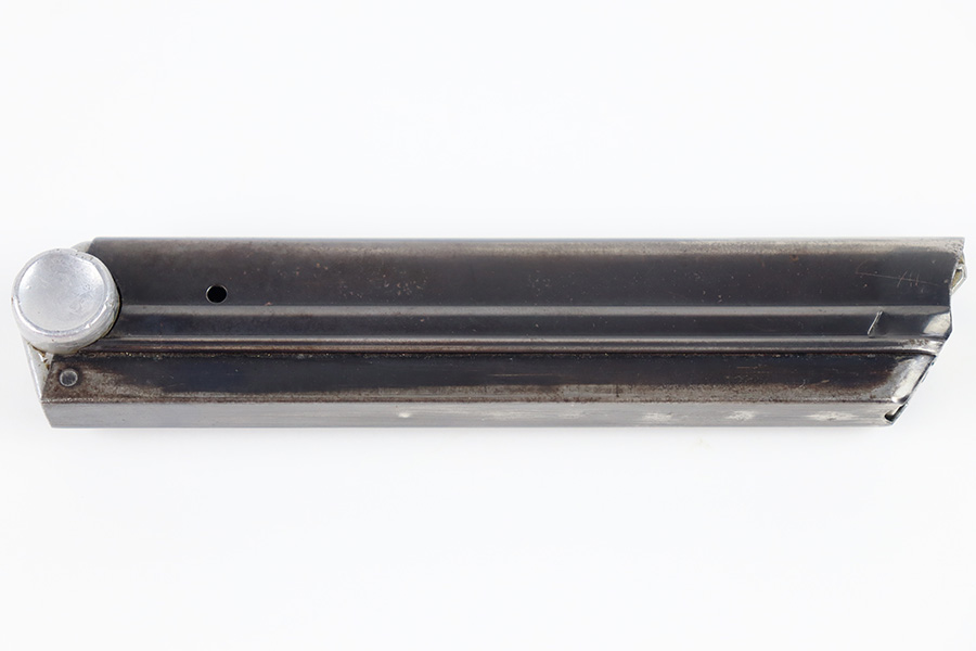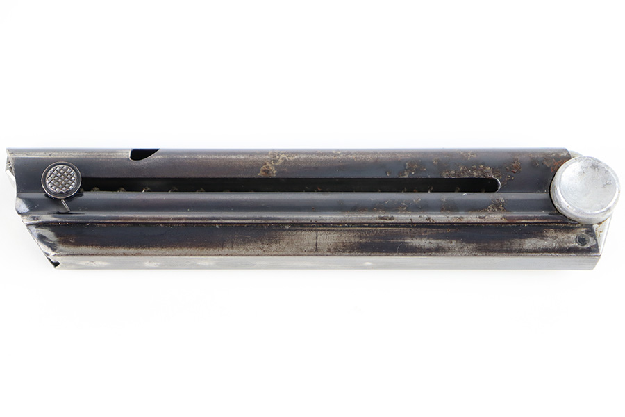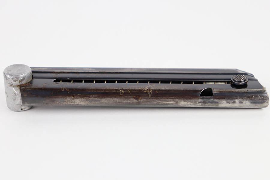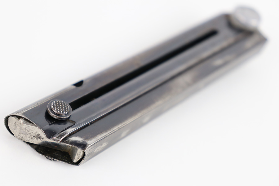9/27/23 – This is an original WW2 production Mauser Luger magazine. The magazine has a blued tube and aluminum base. Very good overall condition with some honest surface patina and natural aging on the blued tube. The aluminum base is serial numbered 3660 L, with a small eagle/63 military proof stamp. Strong, functional spring.