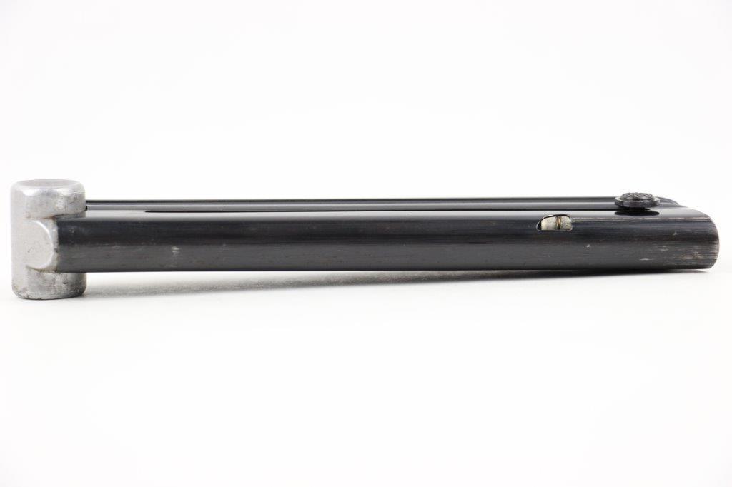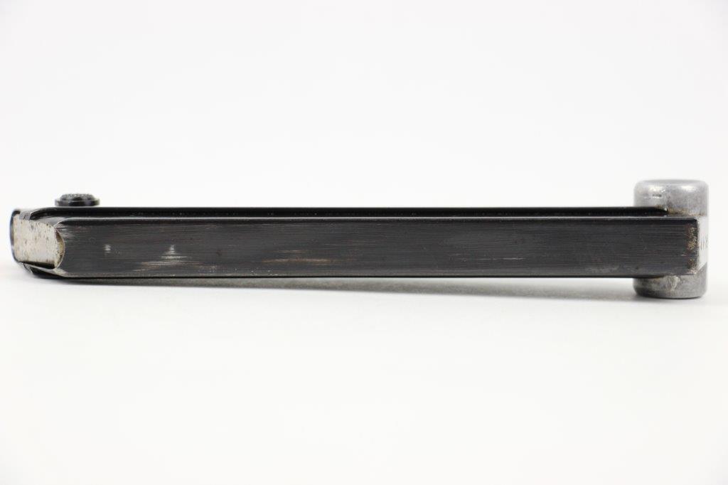 9/5/24 – This is an excellent condition, desirable variation Mauser Luger magazine. The magazine has a blued tube with minimal finish loss and no rust or pitting. The aluminum base is stamped with a 3 digit serial number (172), “n” letter suffix, plus sign, and stick winged eagle 63 military acceptance proof. Strong, fully functional spring.