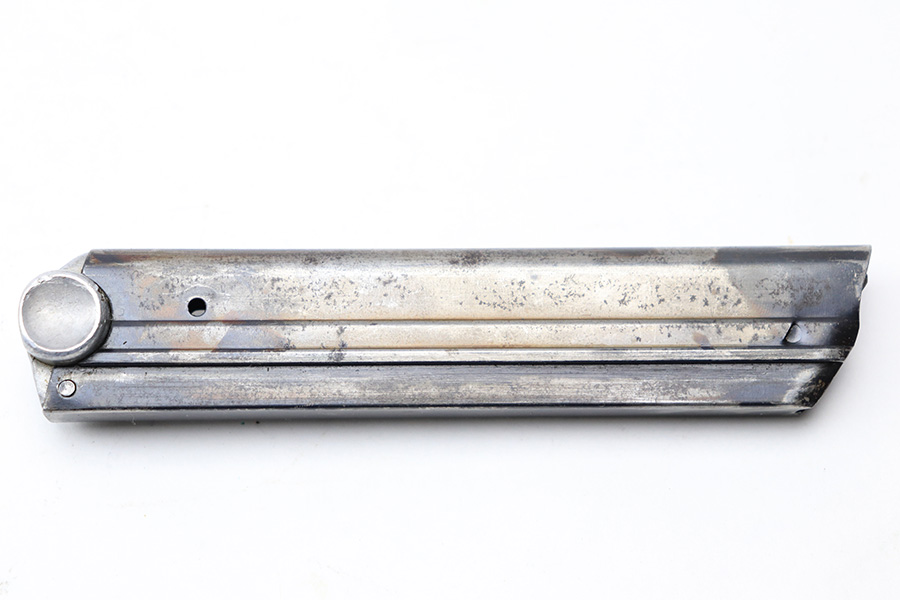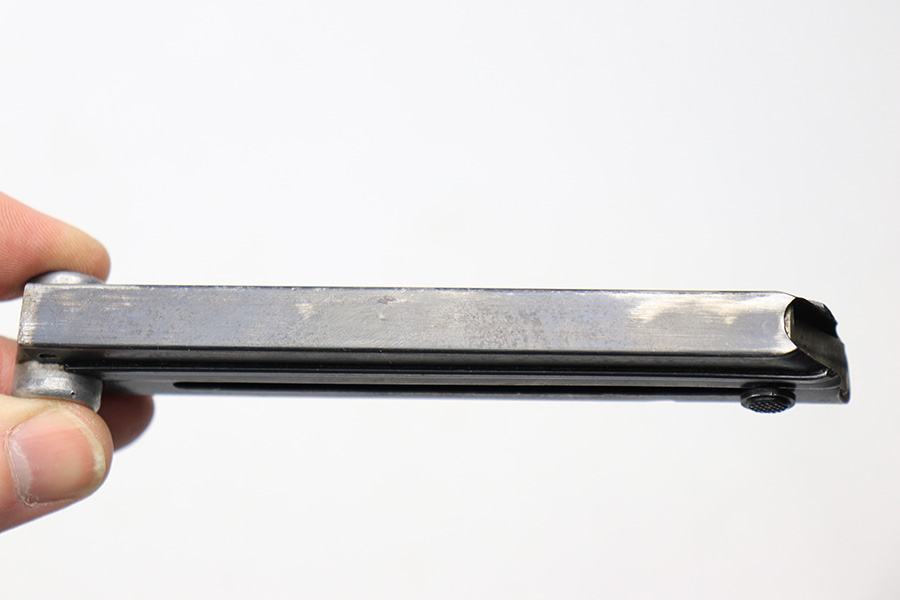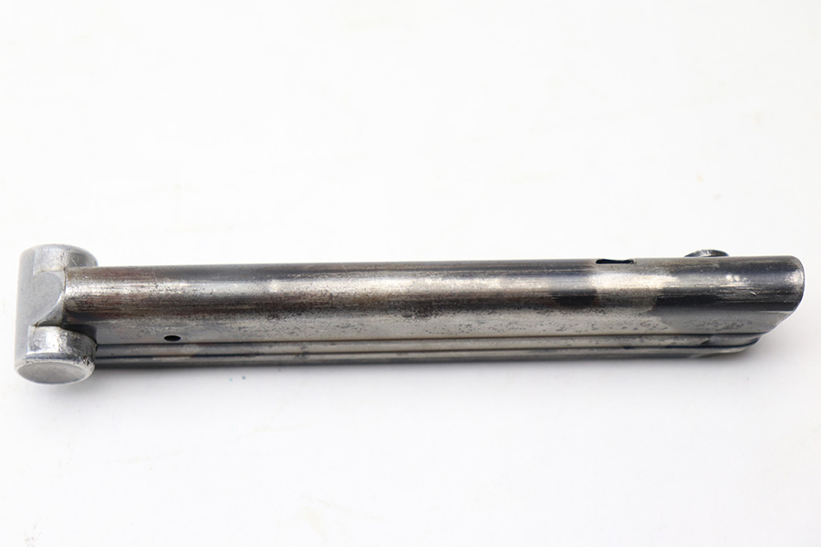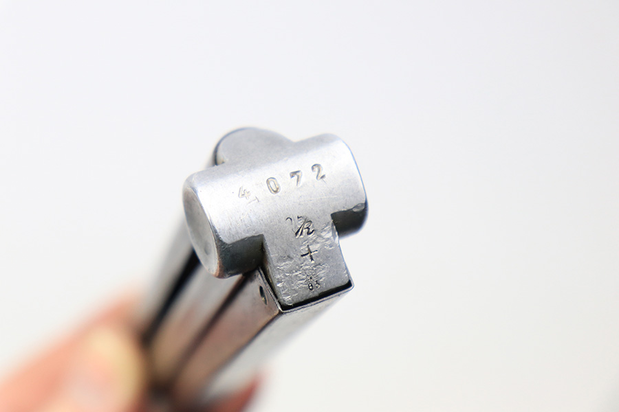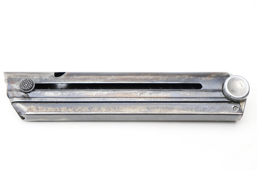 4/22/22 – This is an original Mauser Luger magazine from WW2. The magazine features a blued tube and aluminum base that’s serial numbered 4072k with a “+” sign and stick winged eagle 63 military proof. The tube has finish loss and patina throughout, as shown in photos. Price reduced accordingly. The spring is still strong and functional without issue.