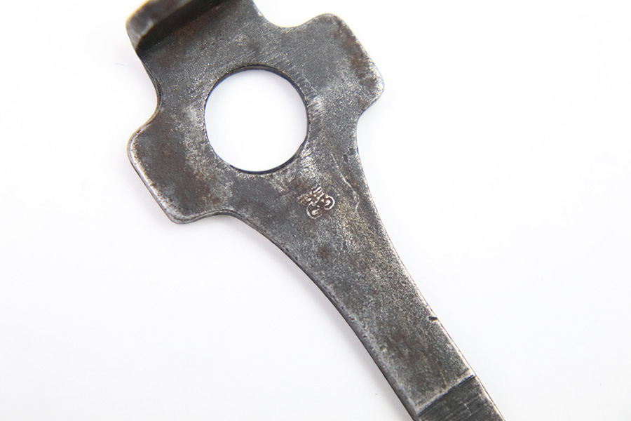 12/15/22 – This is an original WW2 Mauser Luger tool with an eagle 63 military acceptance proof stamp. The stamp is small and on the front metal as shown. There’s some surface patina, mild finish loss, and discoloration throughout the tool but the stamp is crisp and easily visible.