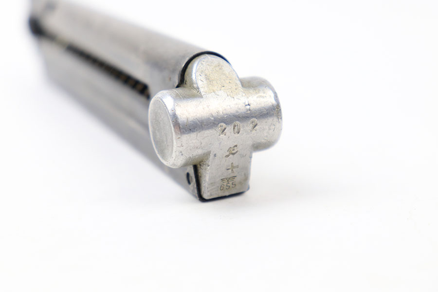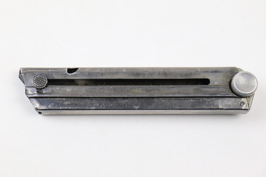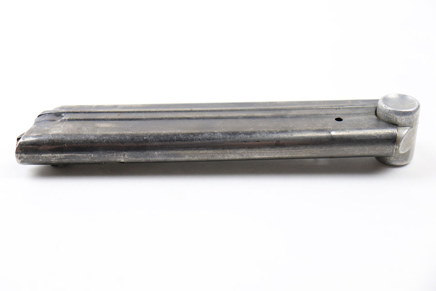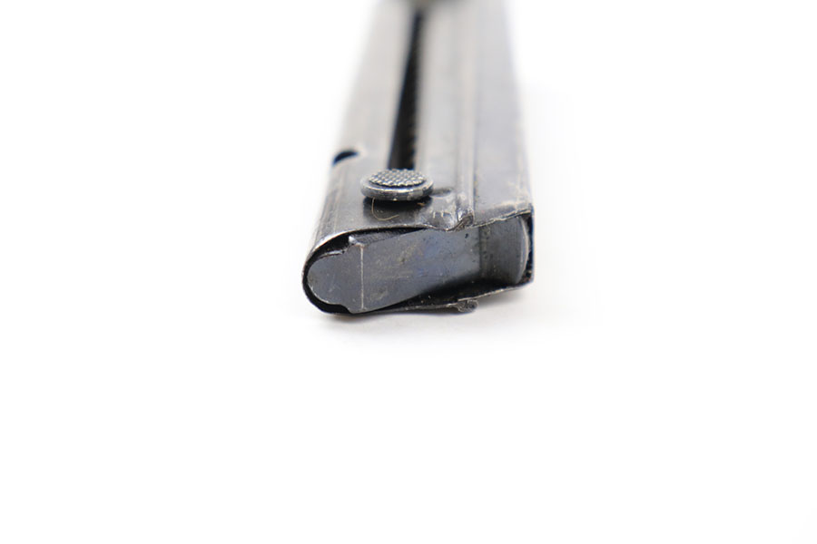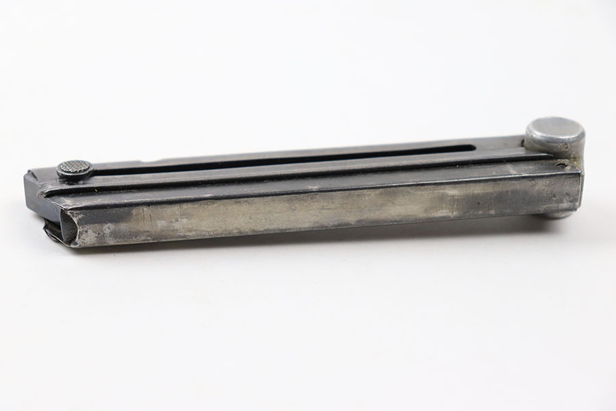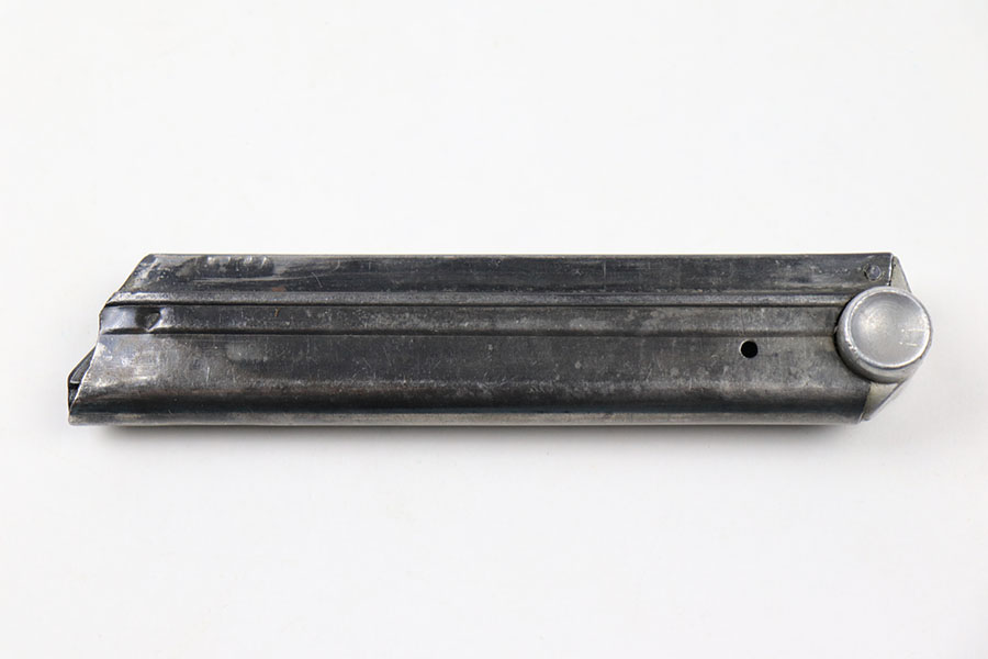 9/30/21 – This is a Mauser eagle 655 luger magazine from WW2. The magazine is in good overall condition with some thinning and mild patina throughout the tube. The base is serial numbered 202x with a plus sign and an eagle 655 proof stamp. Strong, fully functional spring.