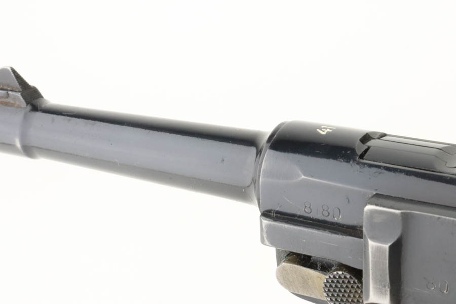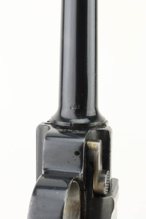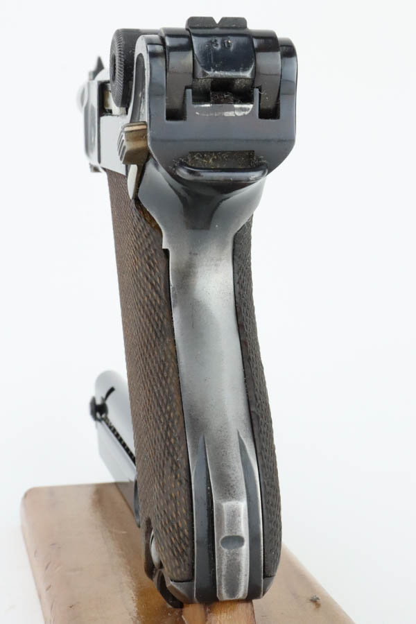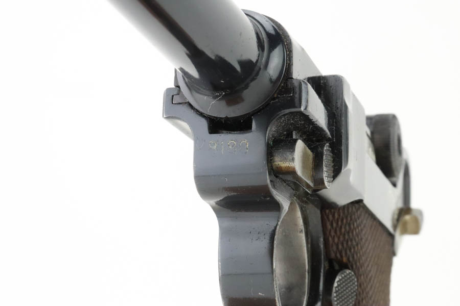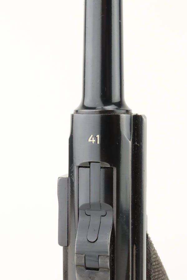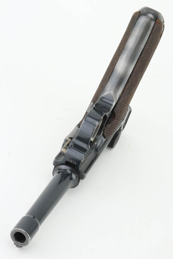 6/19/24 – This is a shooter-grade Luger, put together from Mauser and Erfurt parts. The chamber is dated 1941, and it has “Eagle 655” Nazi military acceptance proofs. Erfurt marked toggle. Several of the small parts are mismatched, and some of the parts have been re-numbered to match. The gun has been refinished with obvious wear on the grip straps. Fitted with mismatched wood grips – tiny chip on the left side. Comes with a reproduction magazine. The bore has good rifling with some light freckling in the grooves.