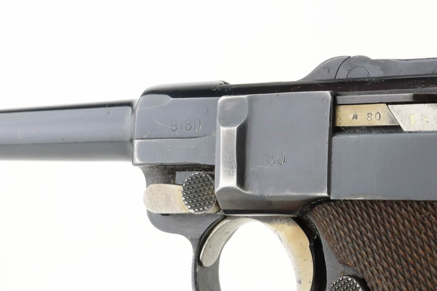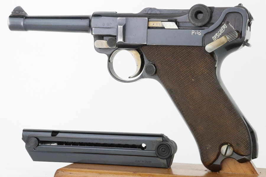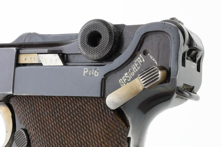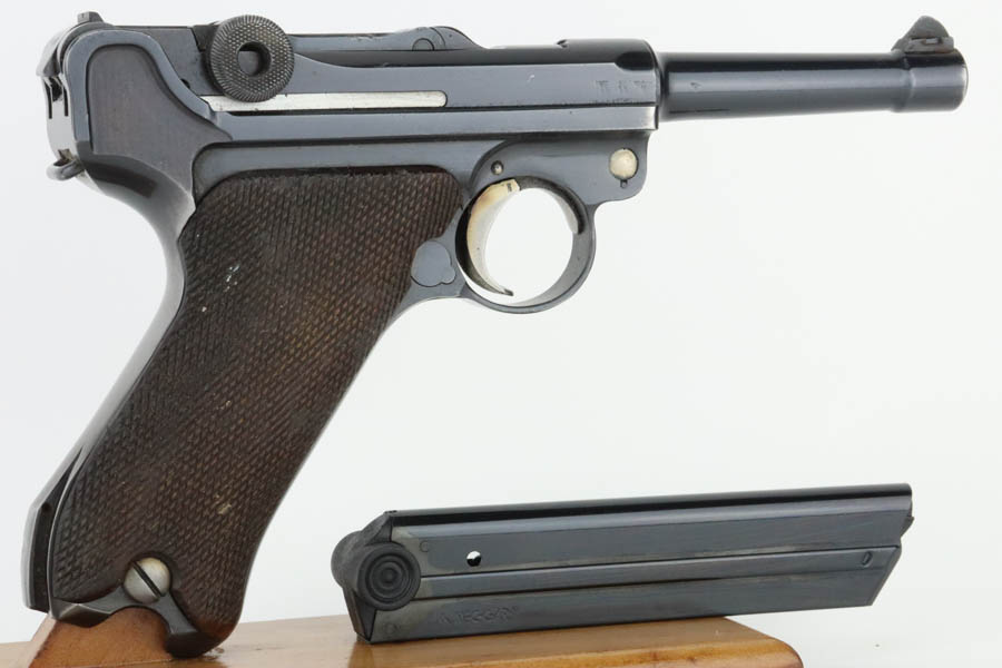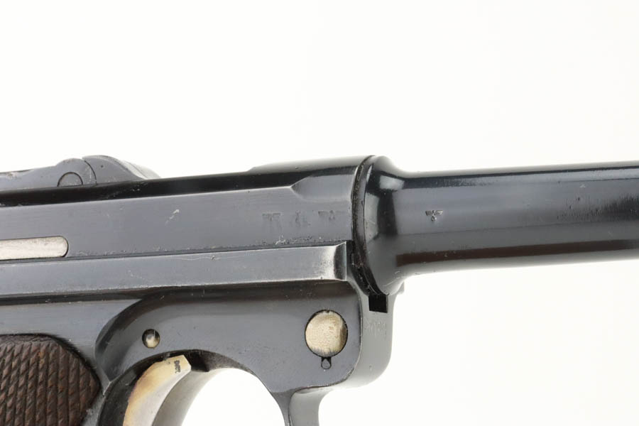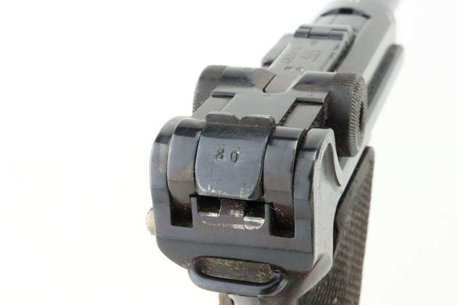 6/19/24 – This is a shooter-grade Luger, put together from Mauser and Erfurt parts. The chamber is dated 1941, and it has “Eagle 655” Nazi military acceptance proofs. Erfurt marked toggle. Several of the small parts are mismatched, and some of the parts have been re-numbered to match. The gun has been refinished with obvious wear on the grip straps. Fitted with mismatched wood grips – tiny chip on the left side. Comes with a reproduction magazine. The bore has good rifling with some light freckling in the grooves.