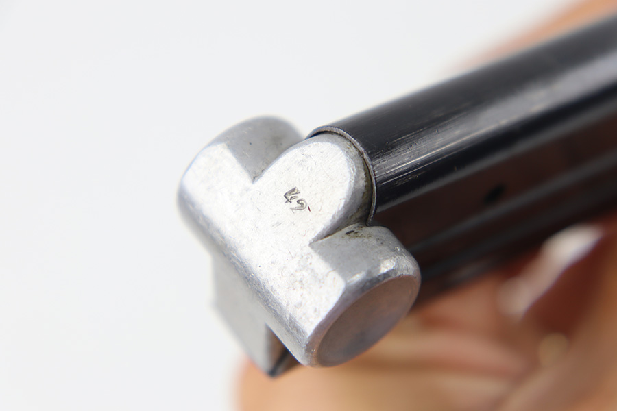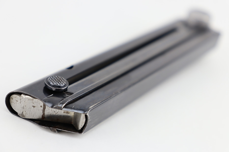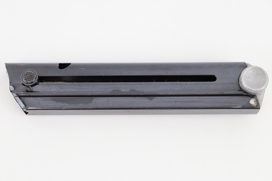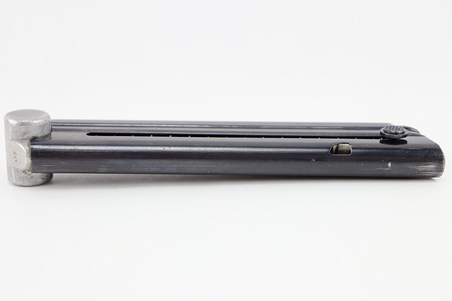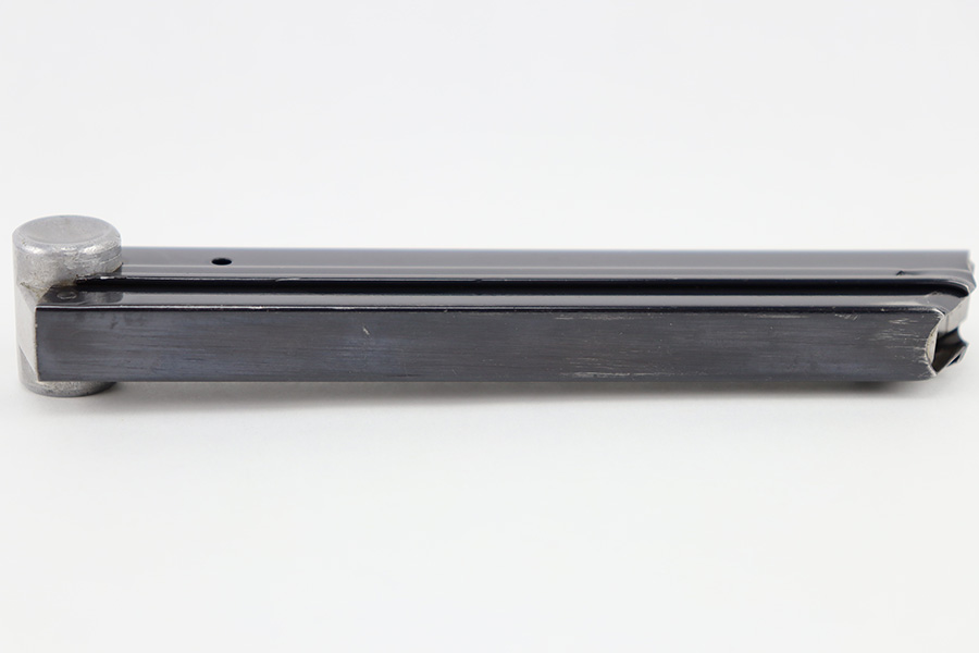 8/24/23 – This is an original Mauser field replacement (or armorer replacement) Luger magazine. The magazine has a blued tube and aluminum base. The base is stamped “42” which is a Mauser factory code. There are no other markings or stamps, and no serial number, making this is a very desirable example. The original blued finish is in excellent condition with minimal finish loss.