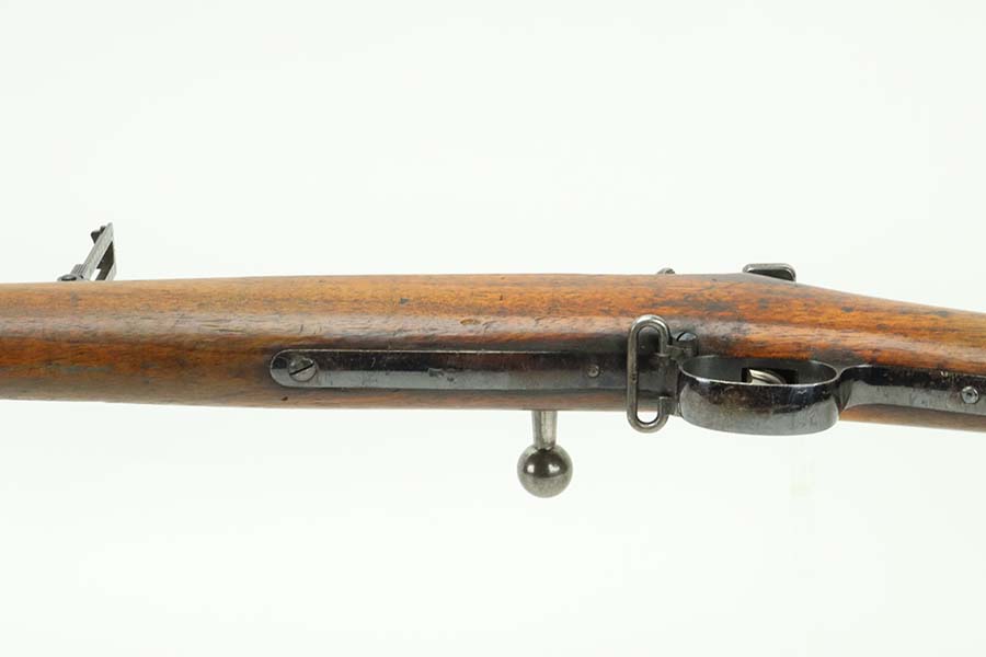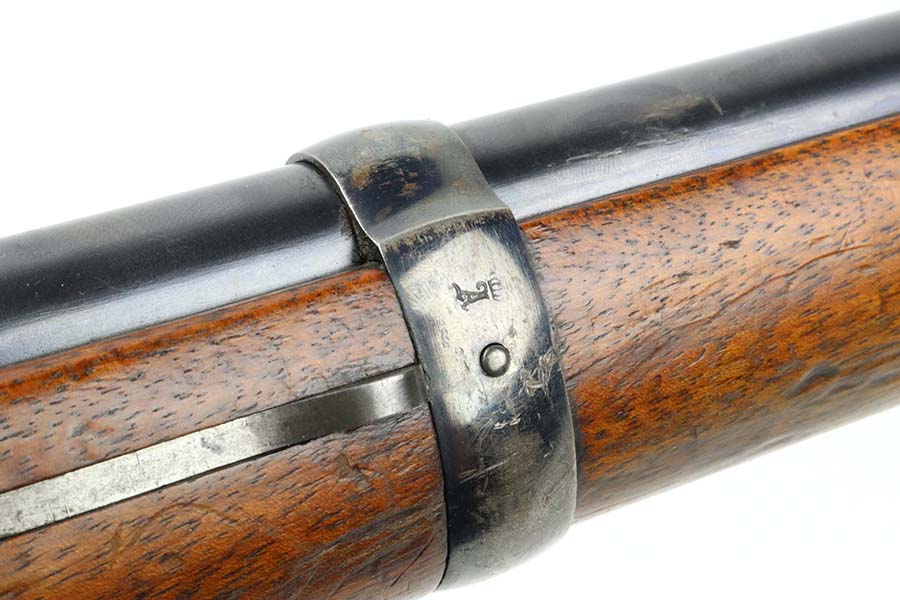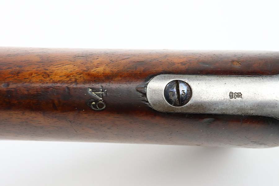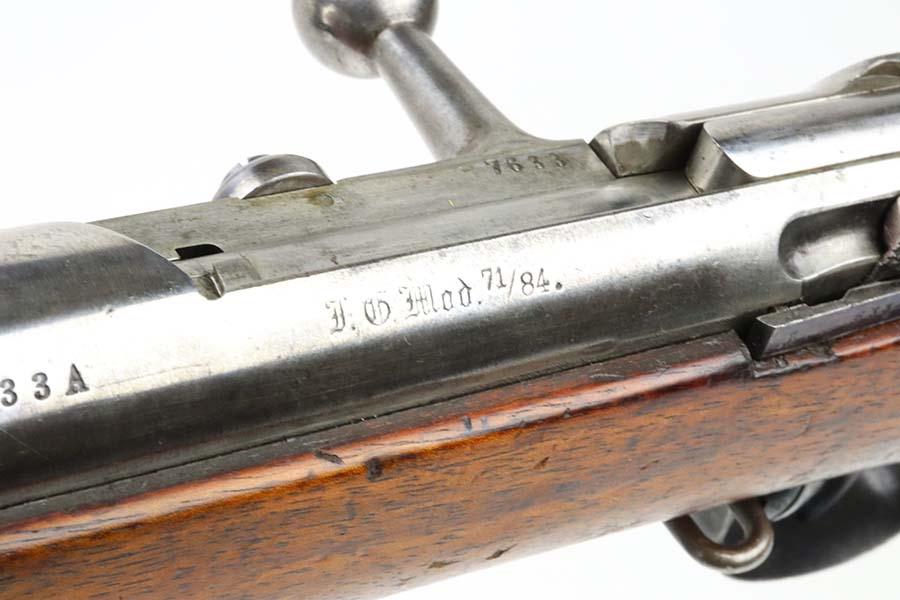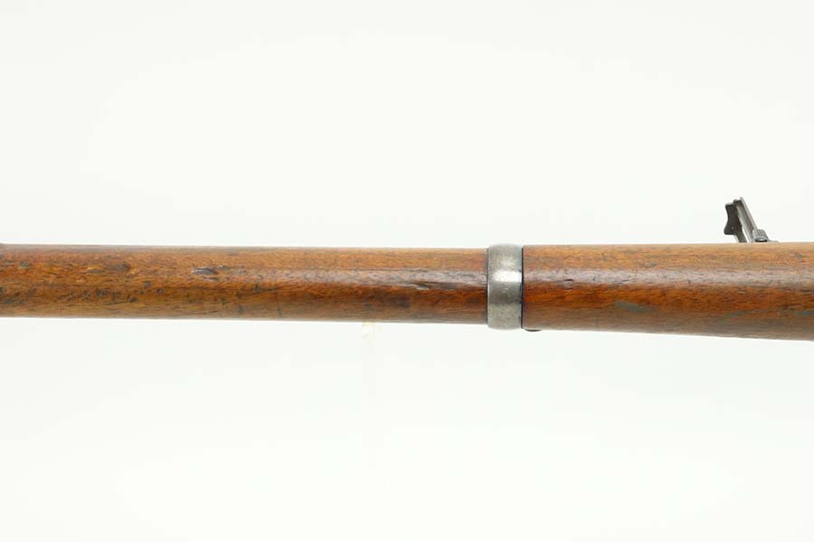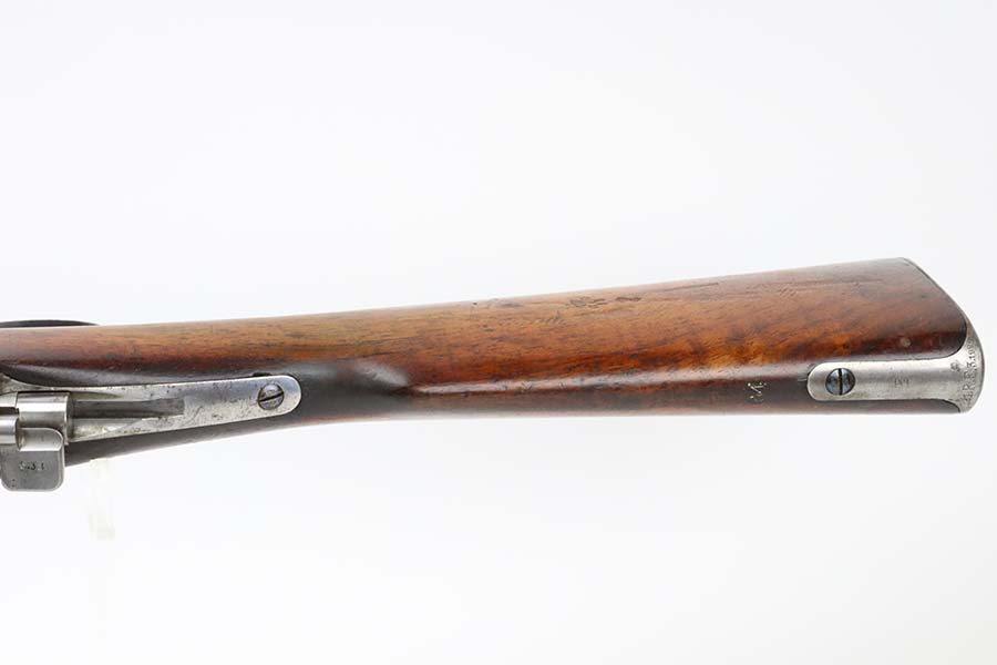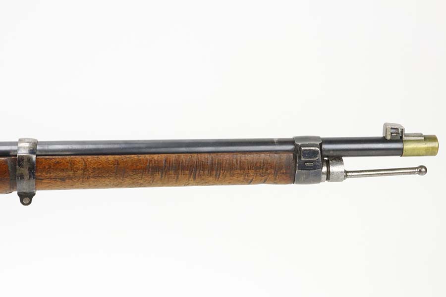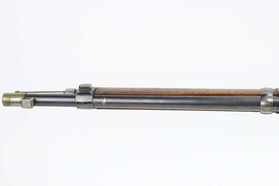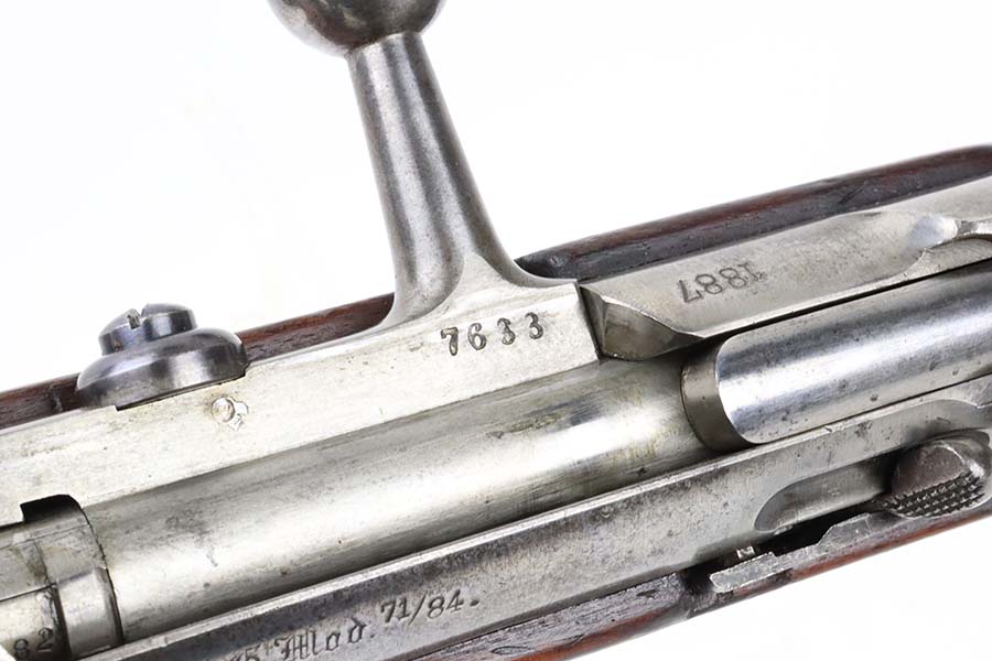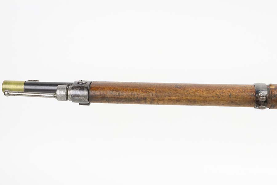3/27/24 – This is a very nice example of a Mauser Gewehr 71/84. This was the successor to the Model 1871. By altering the stock and action configuration it was possible to adapt the original platform for the use of the Austrian-designed, Kropatschek-style, tubular magazine. Operating the bolt depressed and raised a lifter/carrier that efficiently loaded cartridges into the chamber from the under-barrel magazine. The bolt head itself was redesigned. Now recessed, the extractor was also re-sited because of the altered mechanism. Like most other repeaters of the period, the Infanterie-Gewehr Modell 1871/84 as it was designated, incorporated a cut-off that would disable the carrier and allow the rifle to be fired single-shot. Sights on the 71/84 were a blade front that was drift-adjustable for windage and a ladder-style rear, graduated to 1,600 meters. This one is entirely matching, down to the screws. Unit marking on the butt plate. Its original finish rates about 90% with finish loss on the barrel bands and some areas of light scratchy wear here and there. Very nice stock. Great bore for its age. Comes with a brass muzzle cap.