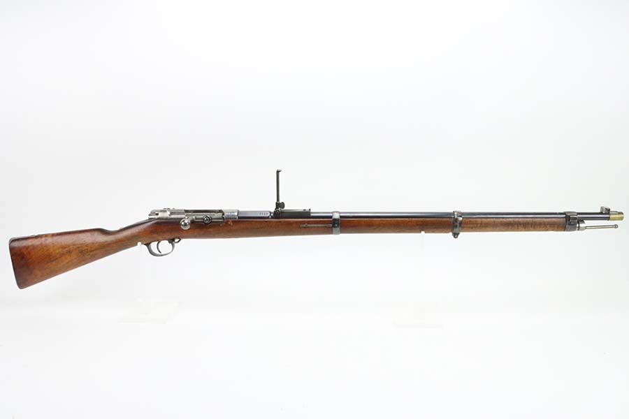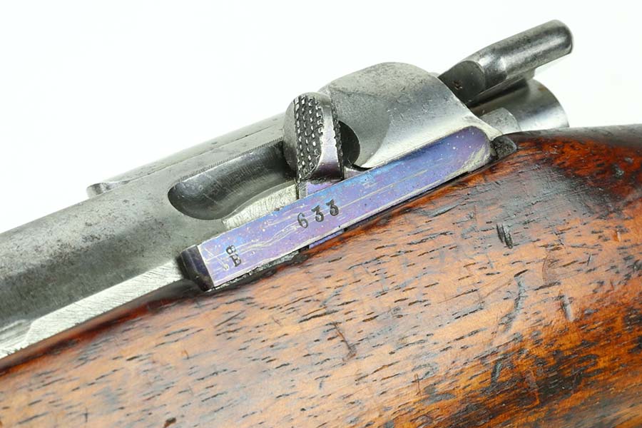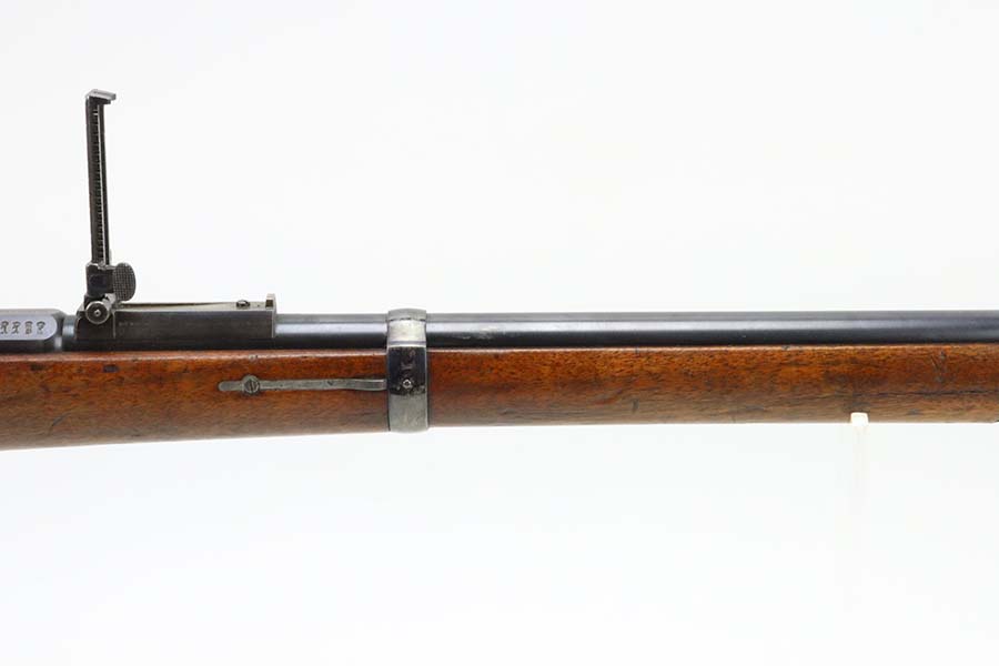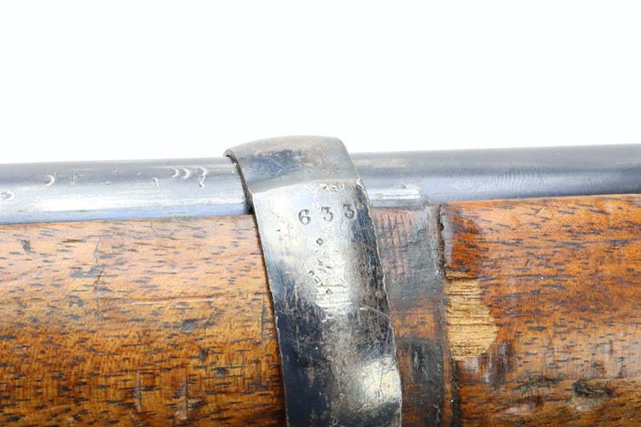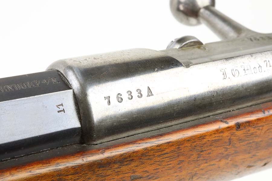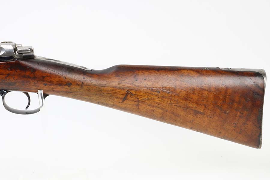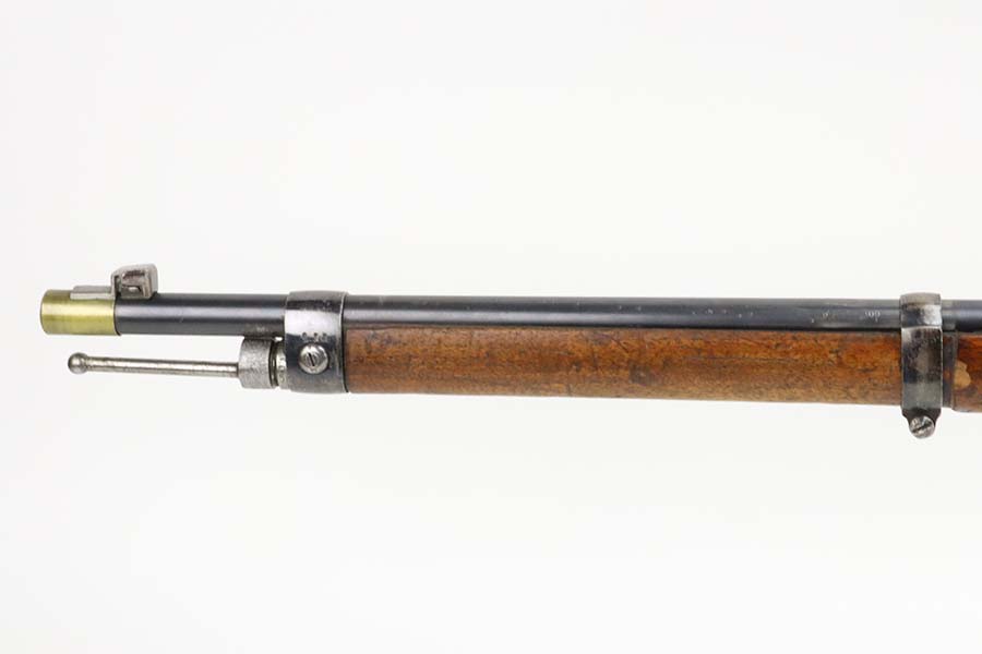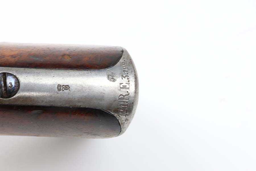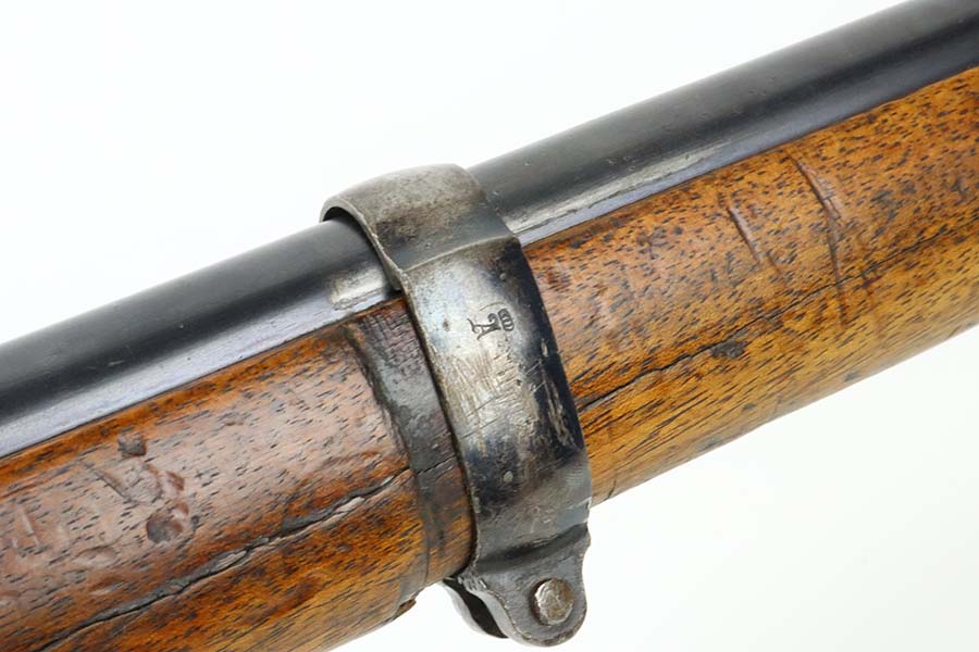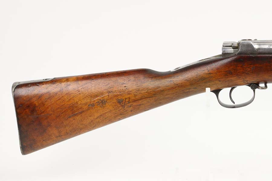 3/27/24 – This is a very nice example of a Mauser Gewehr 71/84. This was the successor to the Model 1871. By altering the stock and action configuration it was possible to adapt the original platform for the use of the Austrian-designed, Kropatschek-style, tubular magazine. Operating the bolt depressed and raised a lifter/carrier that efficiently loaded cartridges into the chamber from the under-barrel magazine. The bolt head itself was redesigned. Now recessed, the extractor was also re-sited because of the altered mechanism. Like most other repeaters of the period, the Infanterie-Gewehr Modell 1871/84 as it was designated, incorporated a cut-off that would disable the carrier and allow the rifle to be fired single-shot. Sights on the 71/84 were a blade front that was drift-adjustable for windage and a ladder-style rear, graduated to 1,600 meters. This one is entirely matching, down to the screws. Unit marking on the butt plate. Its original finish rates about 90% with finish loss on the barrel bands and some areas of light scratchy wear here and there. Very nice stock. Great bore for its age. Comes with a brass muzzle cap.