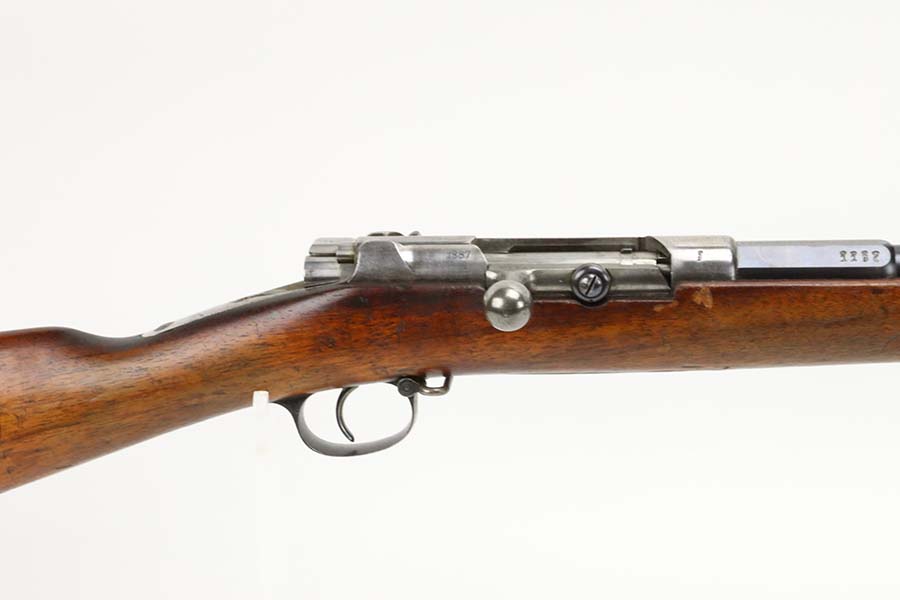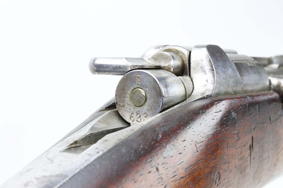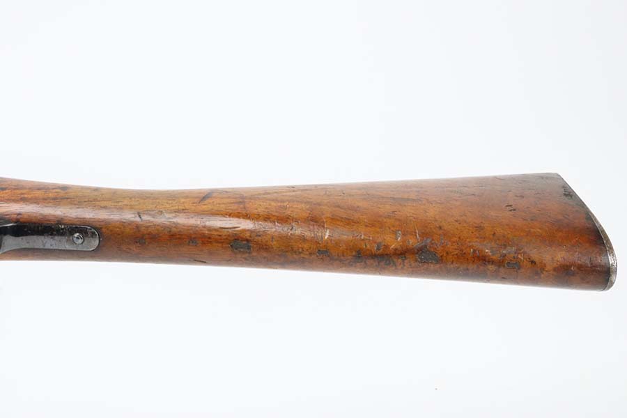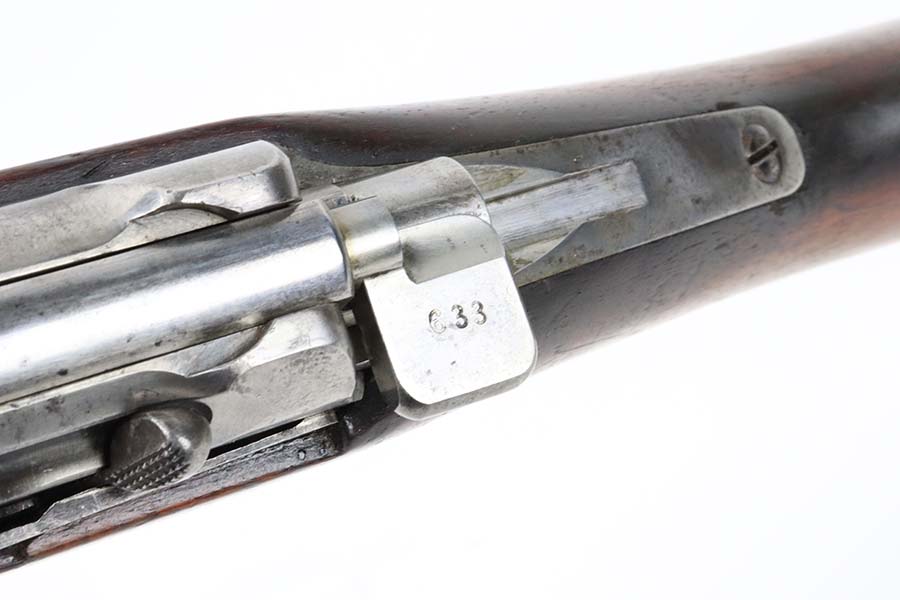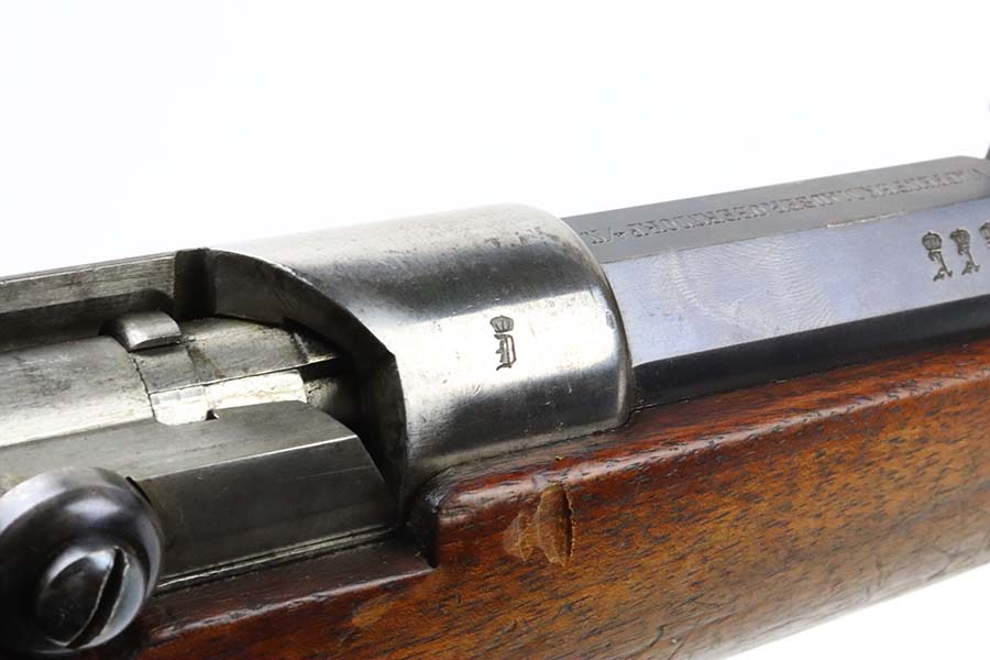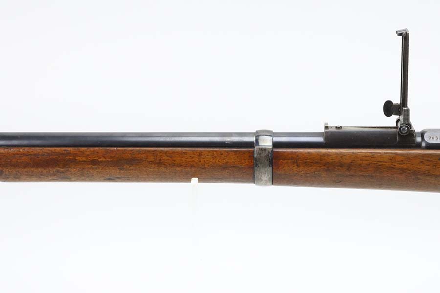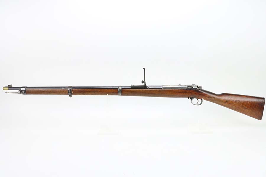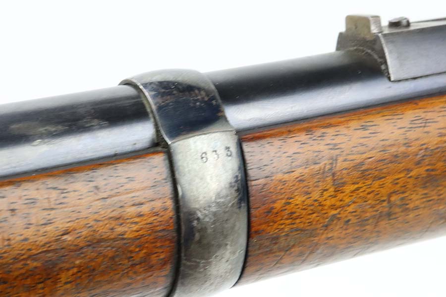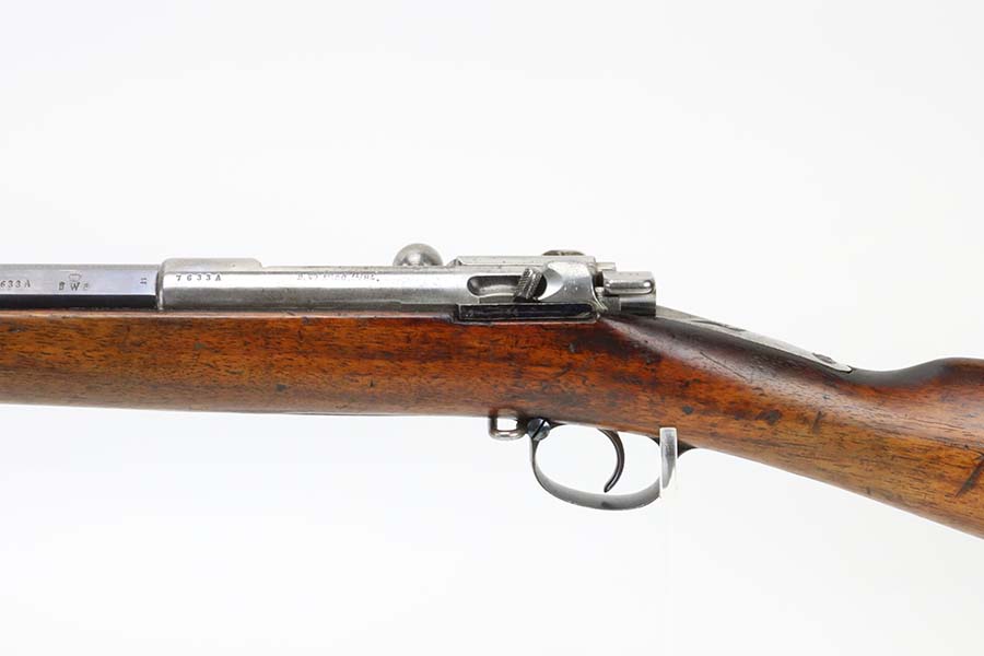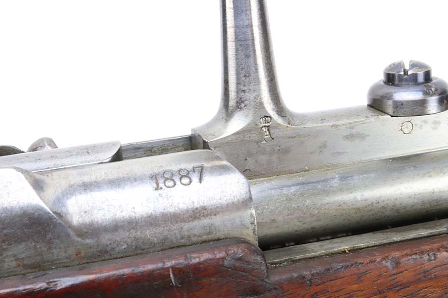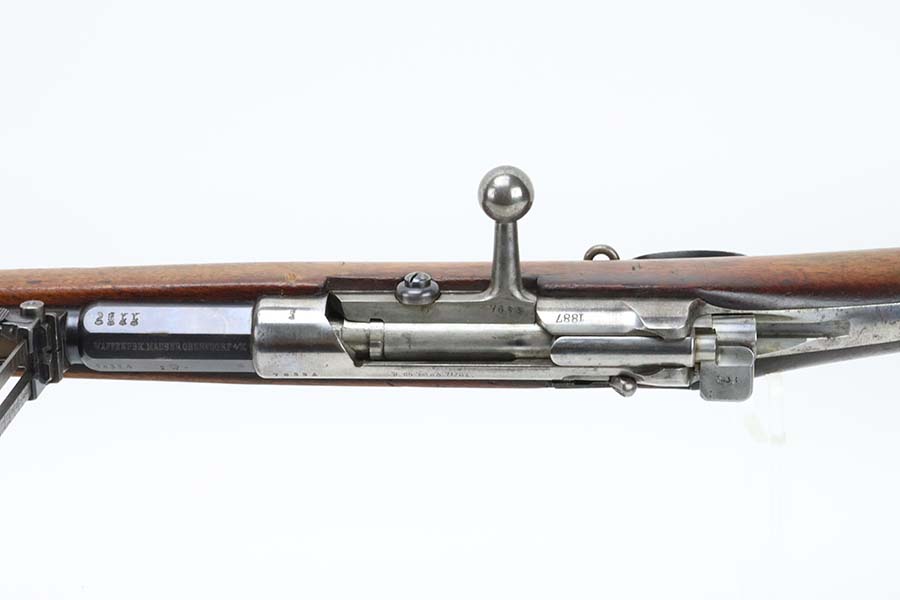 3/27/24 – This is a very nice example of a Mauser Gewehr 71/84. This was the successor to the Model 1871. By altering the stock and action configuration it was possible to adapt the original platform for the use of the Austrian-designed, Kropatschek-style, tubular magazine. Operating the bolt depressed and raised a lifter/carrier that efficiently loaded cartridges into the chamber from the under-barrel magazine. The bolt head itself was redesigned. Now recessed, the extractor was also re-sited because of the altered mechanism. Like most other repeaters of the period, the Infanterie-Gewehr Modell 1871/84 as it was designated, incorporated a cut-off that would disable the carrier and allow the rifle to be fired single-shot. Sights on the 71/84 were a blade front that was drift-adjustable for windage and a ladder-style rear, graduated to 1,600 meters. This one is entirely matching, down to the screws. Unit marking on the butt plate. Its original finish rates about 90% with finish loss on the barrel bands and some areas of light scratchy wear here and there. Very nice stock. Great bore for its age. Comes with a brass muzzle cap.