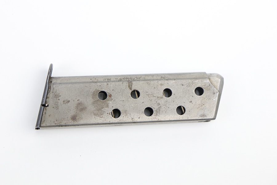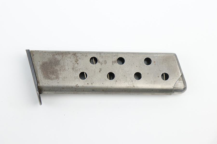 9/1/21 – This magazine is for a Mauser HSC. The magazine is a second variation example meaning it has a “half moon” indent on the magazine bottom’s front. The tube is okay condition showing oxidation and slight pitting throughout.