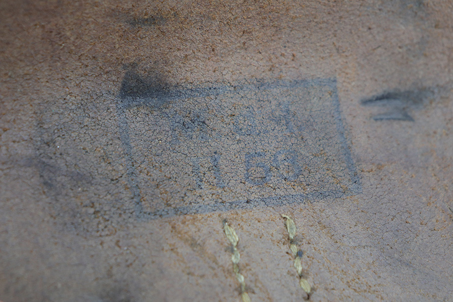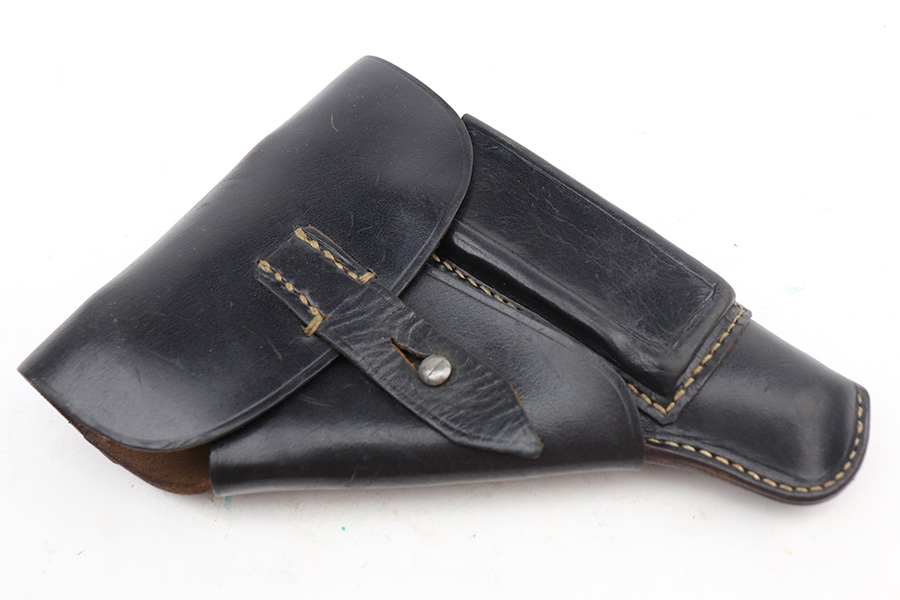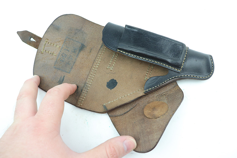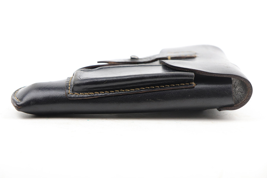 9/17/21 – This is a Mauser HSC holster – likely a post WW2 production, as indicated by the ink stamp on the interior leather. The ink stamp appears to say “H 56”, where we think the “56” is likely the year of production. So this would be appropriate for a French HSc, but could also serve as a useful placeholder for most 7.65mm Axis pistols.