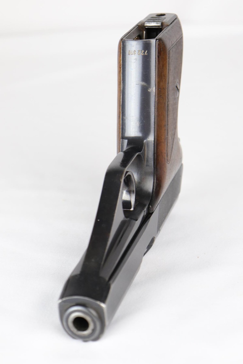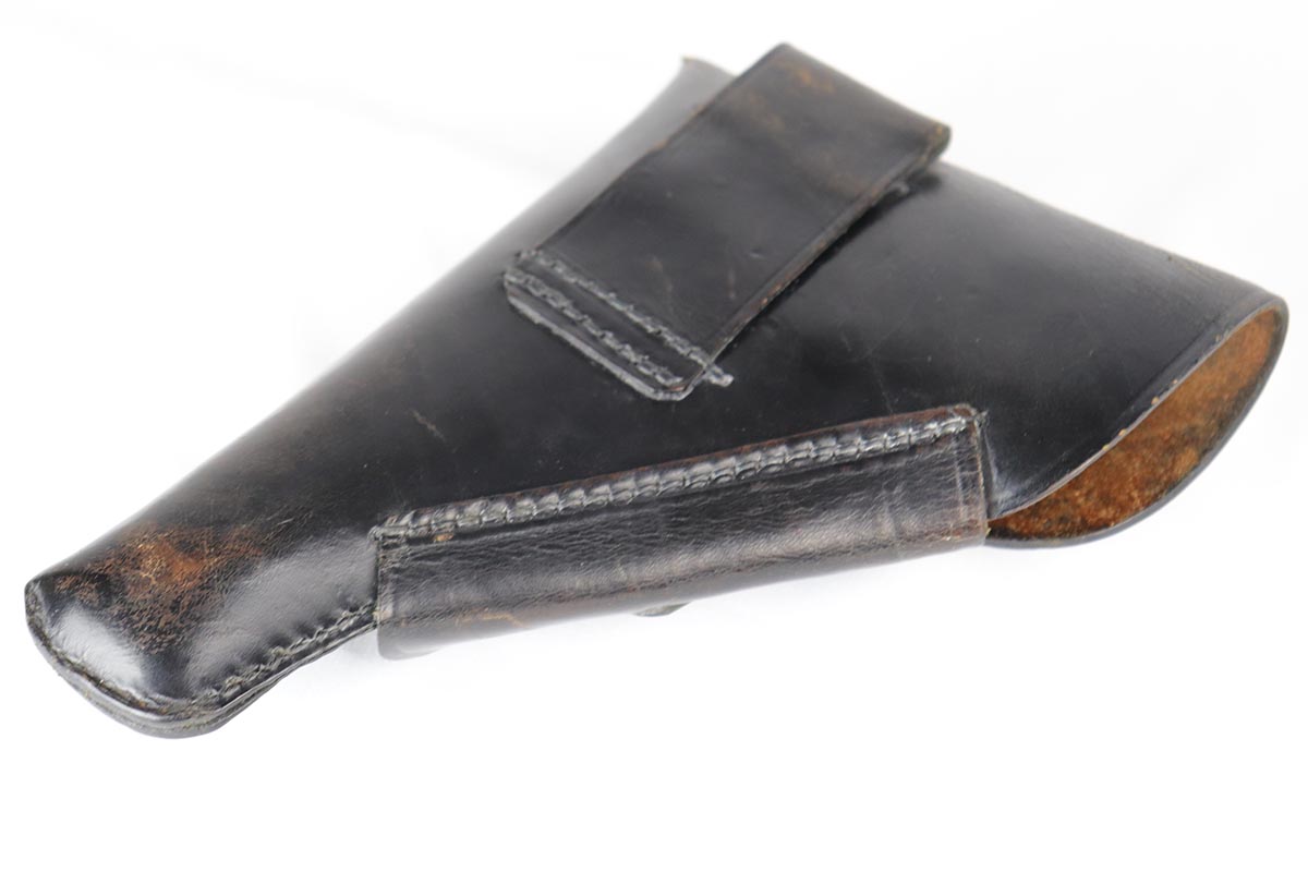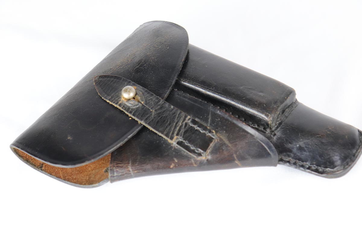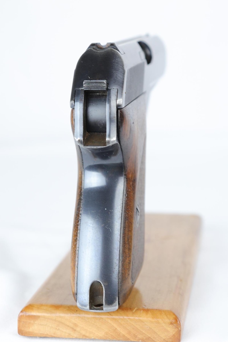 6/20/18 – This is an early Army Mauser HSc, with high-polish finish and Eagle over 655 marking on trigger guard. This is one of the first ~23,000 HSc’s ever made, likely in mid 1941. The bluing rates at about 94% with muzzle wear on both sides of the slide and a little more on the front strap. Excellent grips and Mauser banner magazine. Comes with a very nice, period original holster that is unmarked. Excellent bore.
